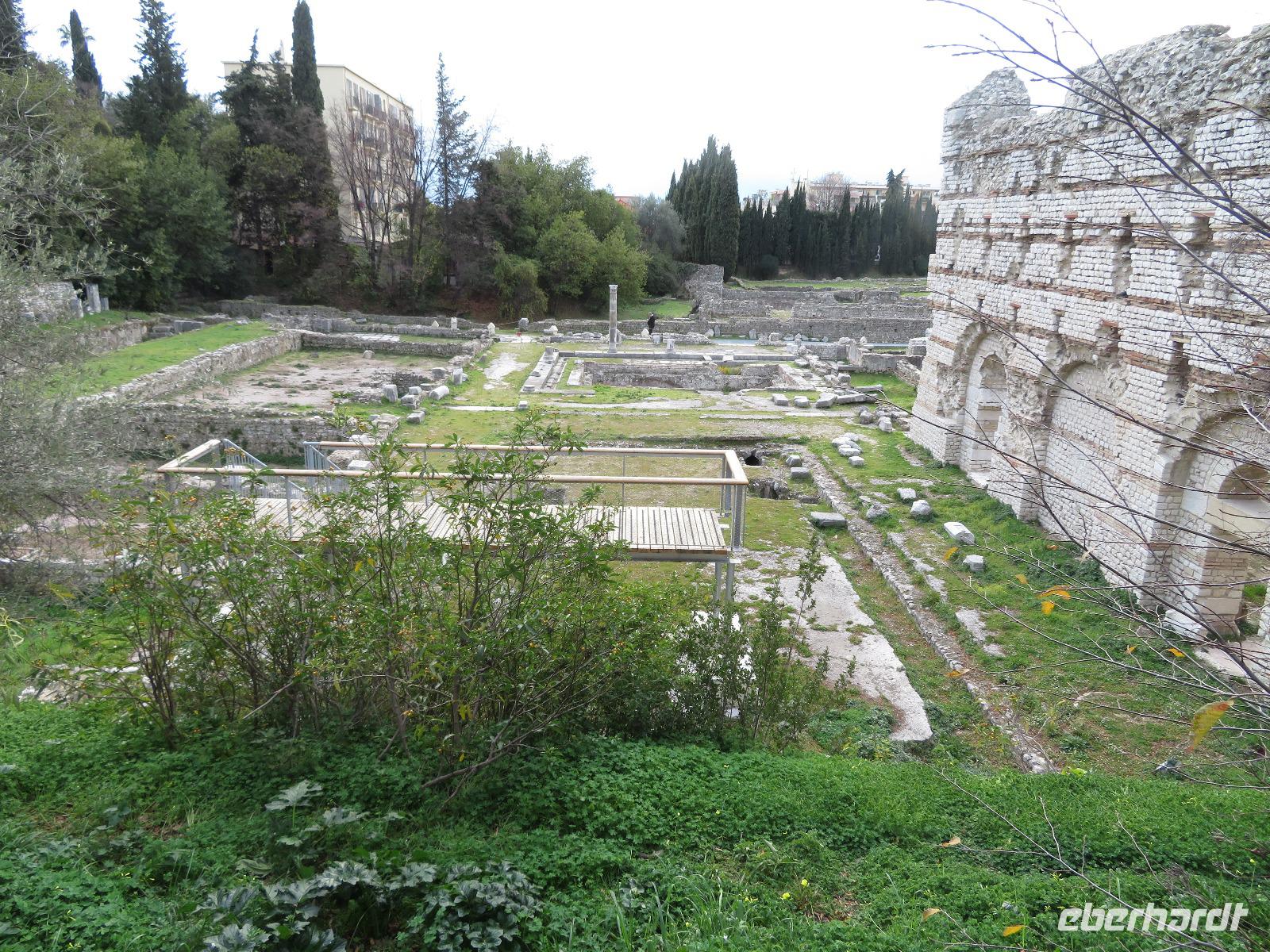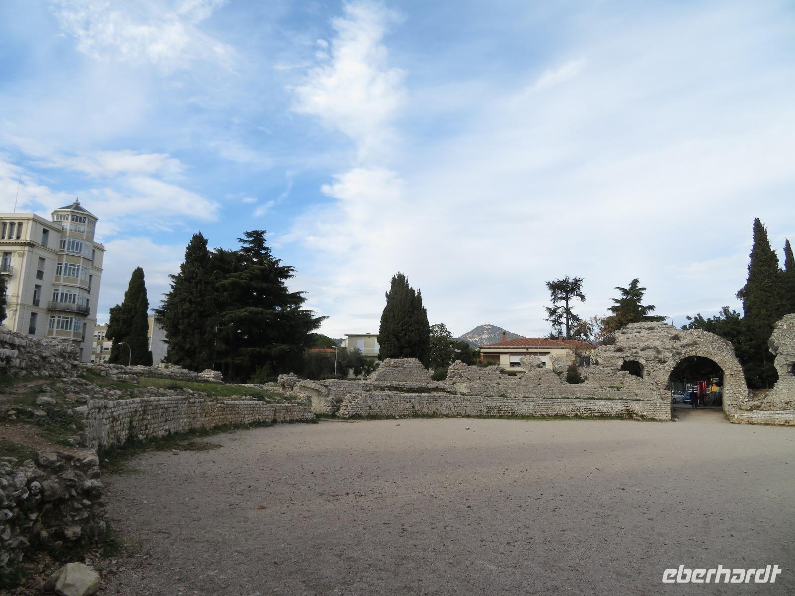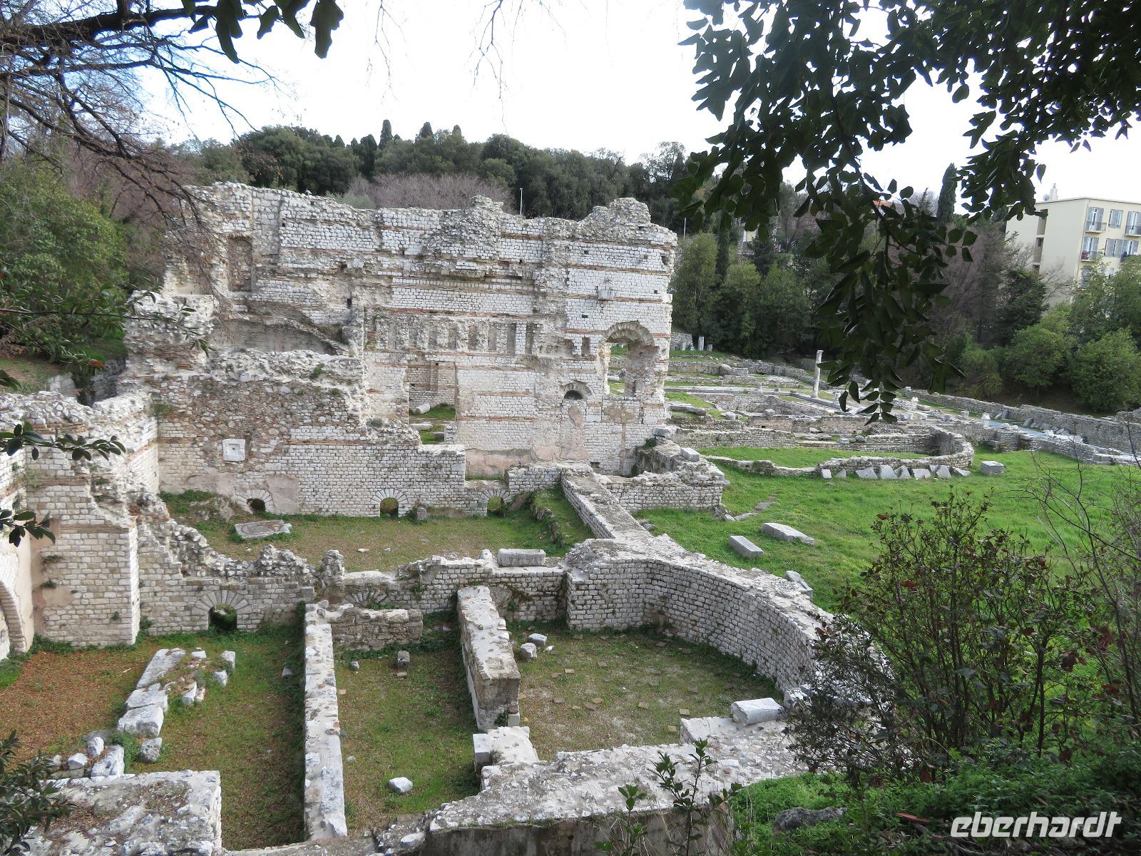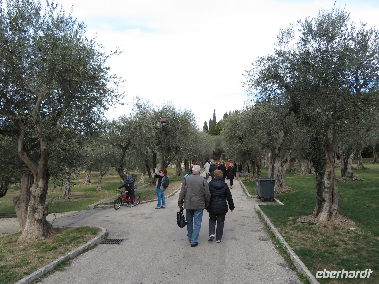 Mit dem Linienbus fahren wir in das nördlich der Altstadt gelegene Stadtviertel Cimiez, welches auf einem Hügel hoch über den Dächern von Nizza liegt. Hier kann man bis heute in den luxuriösen Winterresidenzen des europäischen Hochadels wohnen! Die großzügigen Freitreppen, die kunstvollen schmiedeeisernen Gitter und Brüstungen, die Wintergärten und Privatparks lassen uns ein wenig vom Leben in der „Belle Epoque" erahnen. Das prächtigste aller Palais ist das für Queen Victoria 1897 fertiggestellte Winterpalais Régina I, welches die schönste Fassade von Nizza besitzt: Eine Veranda aus Glas, Balkonelemente mit schmiedeeisernen Gittern und verspielte Türmchen auf dem Dach. Hier lebte und malte Henri Matisse mehrere Jahre. Wir spazieren durch den „Parc des Arènes" zu den Ruinen römischer Thermen und besuchen die Kirche eines Franziskanerklosters. Dort sind wertvolle Gemälde des berühmten Malers Louis Bréa aus konservatorischen Gründen hinter einer Gaze versteckt - sie, wie auch die gesamte Kirche warten dringend auf eine Restaurierung! Vom ehemaligen Klostergarten aus haben wir einen sehr schönen Ausblick auf den „Mont Boron" im Osten der Stadt, die weiße Halbkugel der beweglichen Kuppel des Observatorium von Gustav Eiffel ist ganz leicht zu erkennen, etwas mehr Mühe haben wir, in weiter Ferne Türmchen der Villa von Elton John, dem bekannten britischen Sänger und Komponisten, zu erspähen. Um so besser kann man das Flussbett des Paillon und den Schlossberg (Colline du Château), der hoch über Nizza thront, erkennen. Wer die steile Treppe hinauf auf den Schlossberg nicht nehmen möchte, kann kostenlos einen Aufzug benutzen. Oben angekommen wird man mit einem atemberaubenden Ausblick belohnt!
