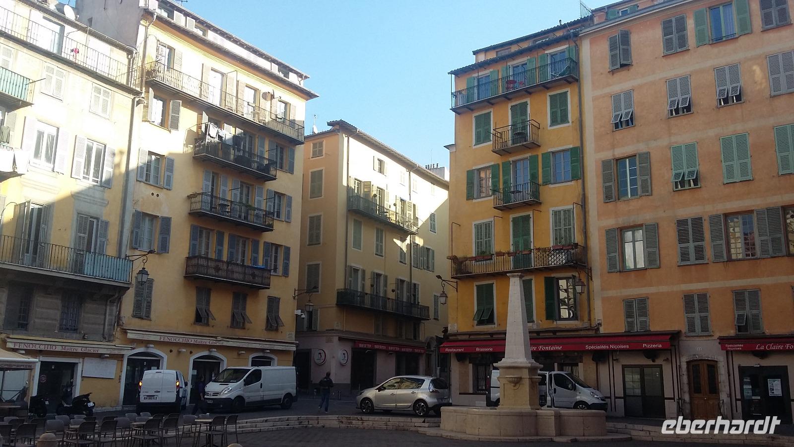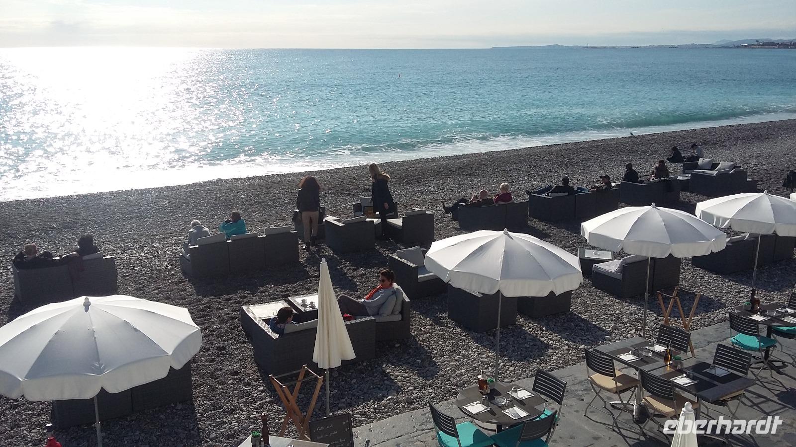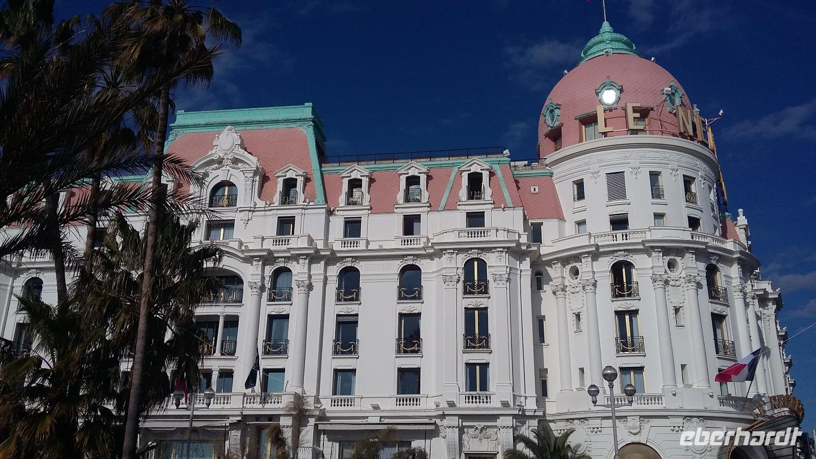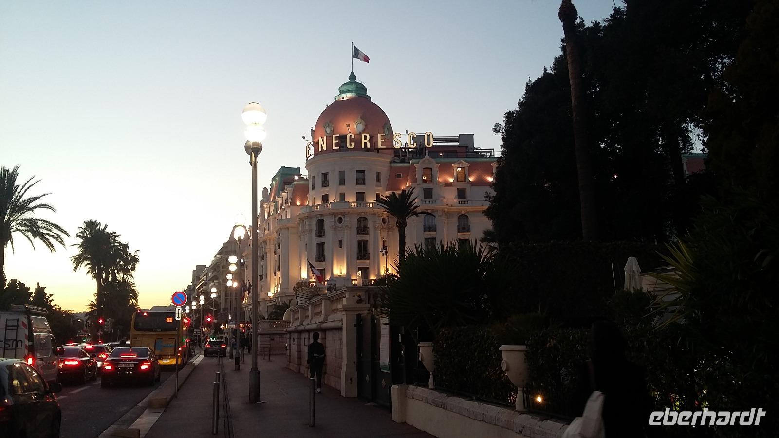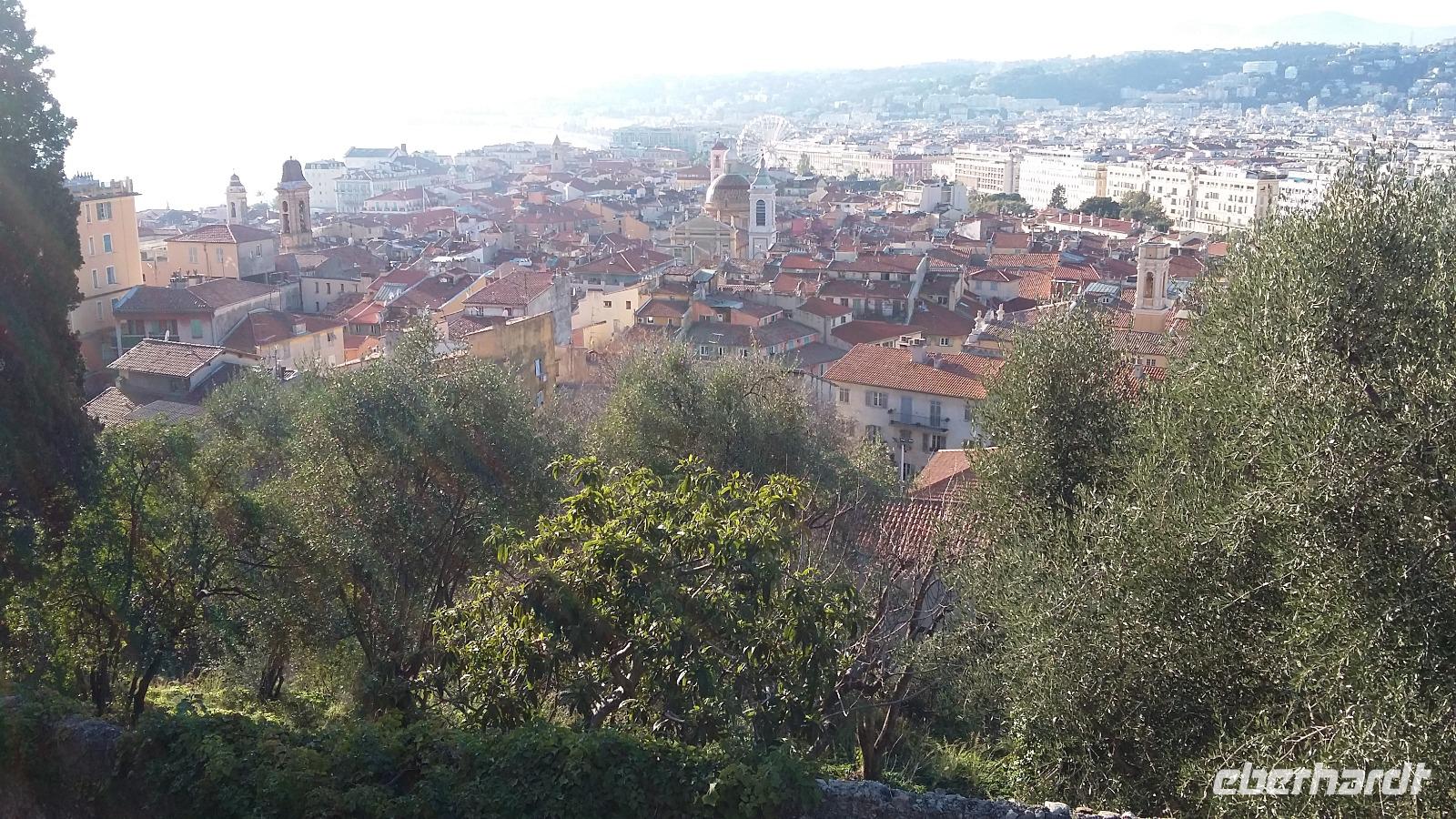 Mit strahlend blauem Himmel und absoluter Windstille begrüßte uns die Hauptstadt der Côte d'Azur am Tag unserer Ankunft. Nachdem 13 unserer insgesamt 15 Gäste gegen Mittag am Flughafen Nizza angekommen waren, ging es zunächst in unser wunderschönes und zentral gelegenes Hotel „Le Grimaldi" und anschließend zum Mittagessen in die Altstadt. Pissaladière, Socca und Petis farcis- alles Spezialitäten der Region- kamen bei den Gästen sehr gut an. Danach erwartete uns der Aufstieg zum Schlosshügel, der bei einigen zwar ein paar Schweißperlen auf der Stirn hervorrief, aber am Ende alle mit einem fantastischen Ausblick über die Stadt und die Engelsbucht belohnte. Auch das Flanieren auf der weltberühmten „Promenade des Anglais" wollten wir uns bei diesem Traumwetter natürlich nicht entgehen lassen, was auch einen kleinen Aperitif in Form eines belgischen Bieres unweit des Hotels Negresco beinhaltete. Kurz vor dem Abendessen trafen dann auch die beiden letzten Gäste ein und wir machten uns auf den Weg zum „dîner"- heute Abend ein kurzer Weg, denn das Restaurant „Davia" lag direkt nebenan. Nach dem Kalbsschnitzel in Champignon-Creme-Soße und dem Mousse au Chocolat fielen wir alle müde ins Bett. Alles in allem ein sehr gelungener erster Tag!