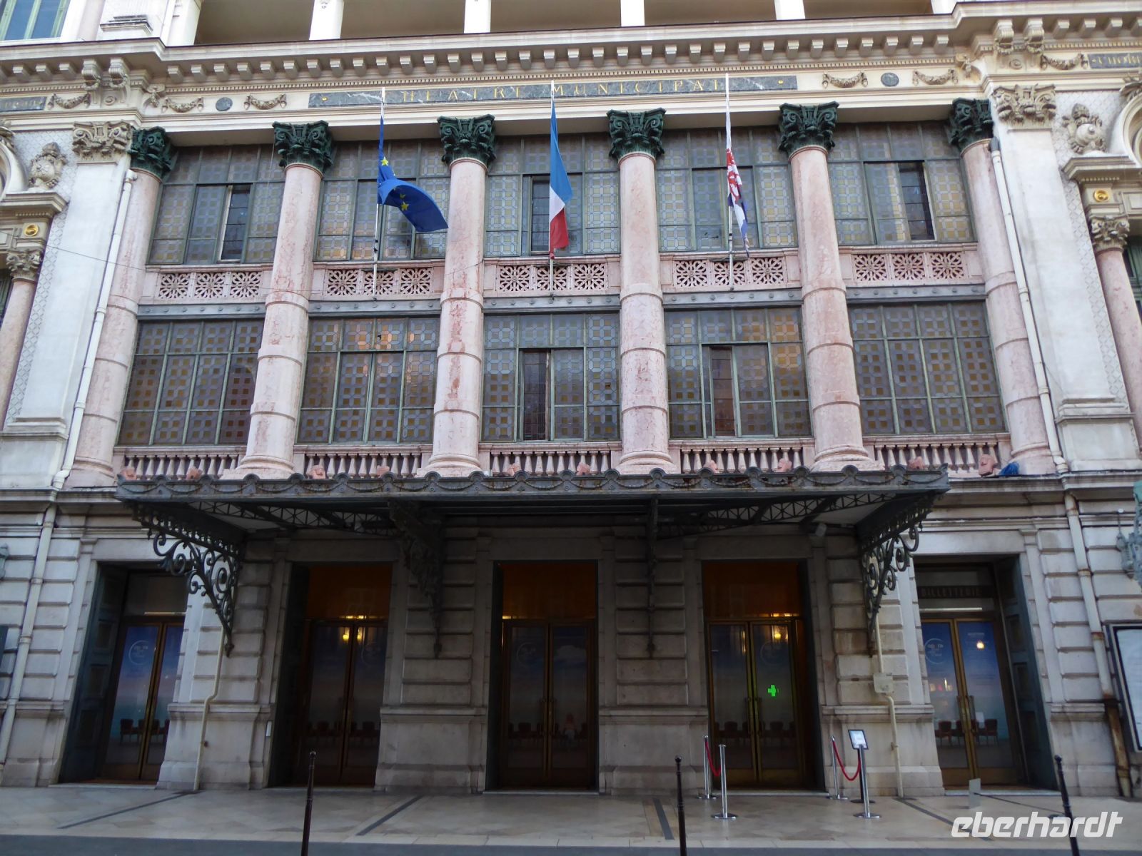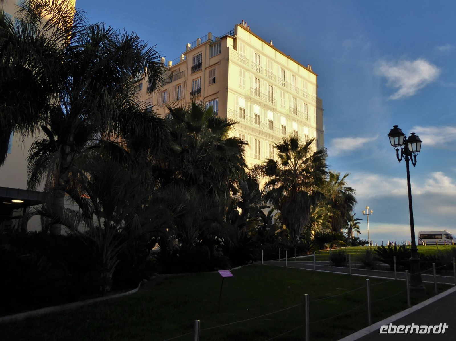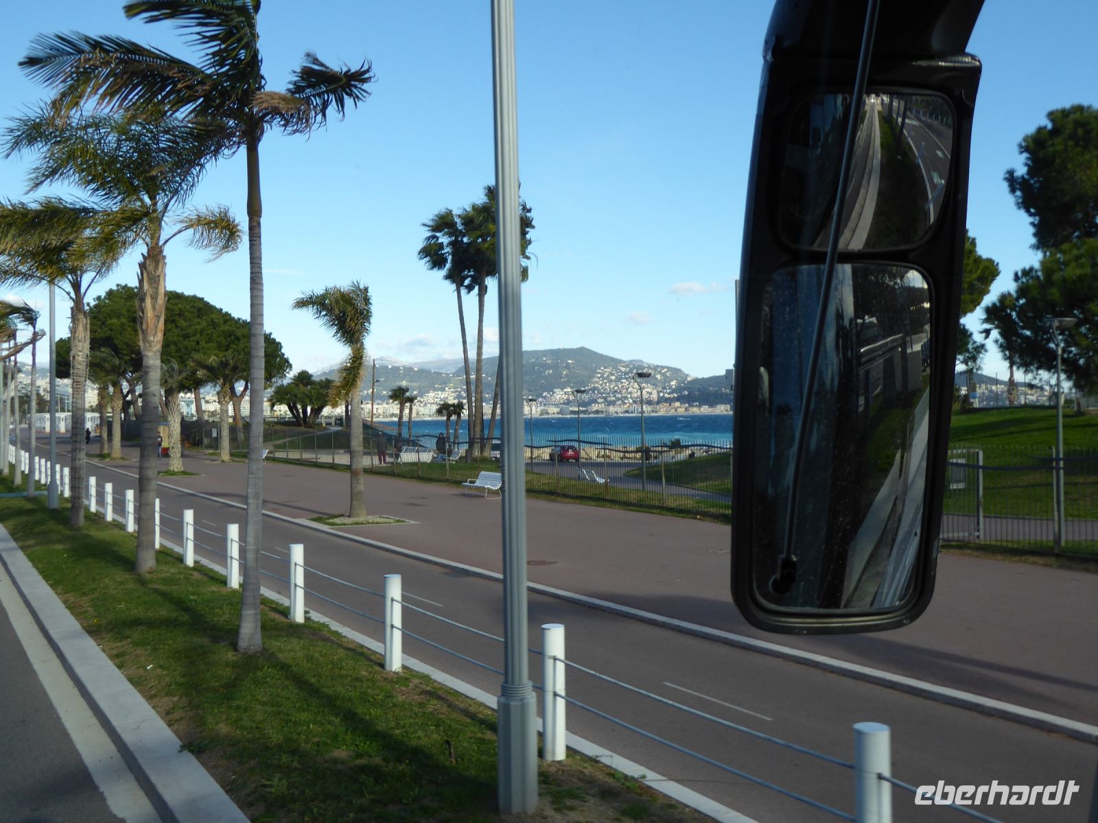 Aufgeteilt in zwei annähernd gleich große Gruppen bestiegen wir die bereitstehenden Busse, die uns in unsere Hotels brachten. Unterwegs gab es schon die ersten Erläuterungen zur Stadt Nizza, schließlich fuhren wir die legendäre Promenade des Anglais entlang. Hier reihen sich berühmte Hotels der Belle Époque aneinander, allen voran das berühmteste der Hotels, Le Negresco, das seit 1912 seine auffällige pinkfarbene Kuppel in den Himmel reckt. Einem Gerücht zufolge soll diese von Gustave Eiffel konstruiert worden sein, dem dafür der Busen seiner Geliebten als Modell diente. Im Jahre 1957 wurde das Hotel von seinem Dornröschenschlaf wieder erweckt und beherbergte seither prominente und weniger prominente Größen aus Politik und Wirtschaft, Kunstschaffende und Musiker sowie Vertreter des Jetset und Showbiz. Ein abendlicher Besuch in der gemütlichen Bar stand demgemäß auch bei uns weit oben auf der Wunschliste.