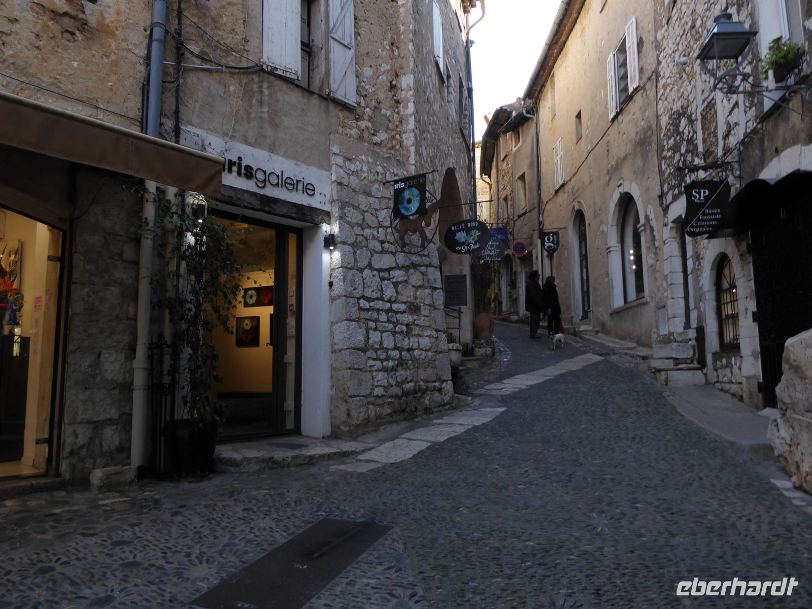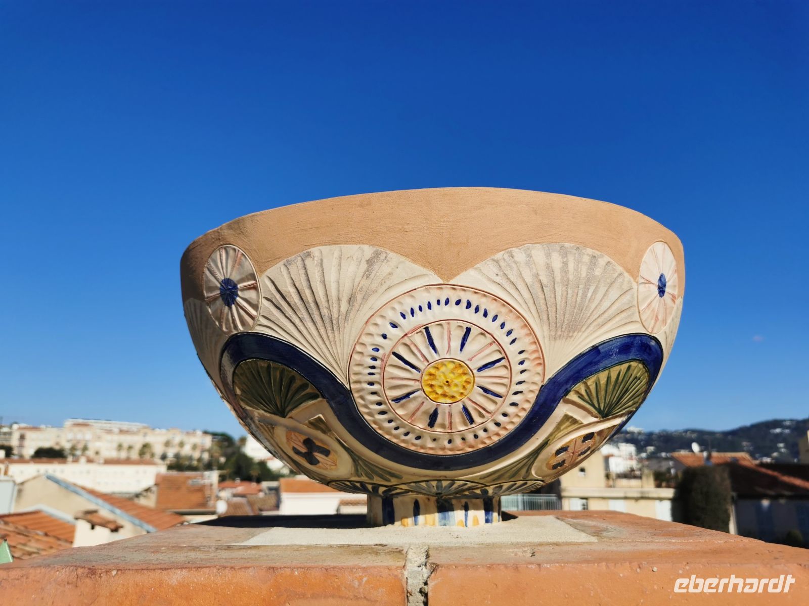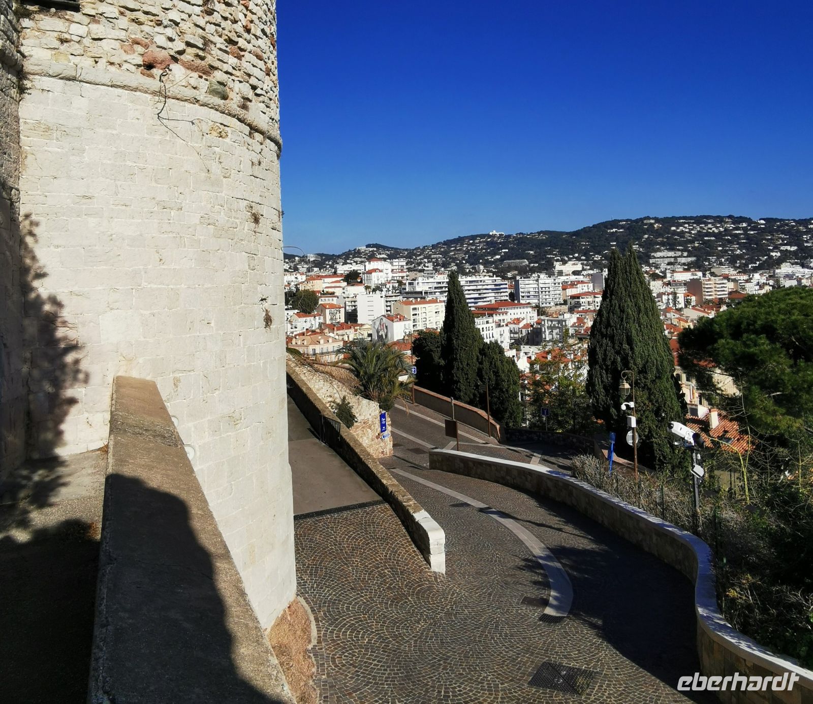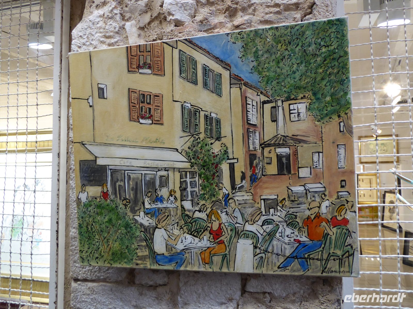 Wieder schien die Sonne herrlich vom blauen Himmel, als wir um 9:00 Uhr den Bus bestiegen und Richtung Westen nach Cannes fuhren. In der knappen Stunde Fahrtzeit unterhielt uns Hannelore fachkundig mit Geschichten und amüsanten Anekdoten von der Côte d´Azur, die vor vielen Jahrzehnten zu ihrer Heimat wurde. Unser Fahrer Jean-Pascal ließ uns direkt am alten Hafen in Cannes aussteigen. Gemütlich spazierten wir zum Casino und Filmfestspielpalast. Wir bestaunten die Handabdrücke berühmter Filmemacher und die der ganz Großen der Schauspielkunst, die sich, mit der begehrten goldenen Palme von Cannes ausgezeichnet, hier in dem berühmten Walk of Fame vor dem Gebäudekomplex verewigen durften: Sylvester Stallone, Penélope Cruz, Jean-Paul Belmondo, Nicole Kidman, George Lucas, Julia Roberts, Brad Pitt und 400 weitere Filmschaffende. Und schon sahen wir sie, die berühmte Treppe mit dem nicht minder berühmten roten Teppich. Leider mussten wir uns für unsere Fotos wegen einer Veranstaltung mit dem orangefarbenen Teppich auf der Treppe des Nebeneingangs begnügen. Doch Hannelore zeigte uns ein kleines Stückchen der legendären Auslegware, das sie in weiser Voraussicht mitgebracht hatte. Bei angenehmen Temperaturen, die fast die 15°C Marke erreichten, spazierten wir den Sandstrand entlang und bestaunten die Luxushotels und Nobelboutiquen, die sich am berühmten Boulevard de la Croisette angesiedelt haben. Doch überall wird gebaggert und planiert, Cannes bereitet sich auf die 76. Auflage der Internationalen Filmfestspiele vor. Der Hauptplatz ist fast fertig und so verbrachten wir dort eine angenehme, sonnige Mittagspause in der Stadt der Schönen und Reichen. Auf dem Hügel über der Stadt liegt das Château de la Castre. Von da oben hat man einen einmaligen Panoramablick auf die Bucht von Cannes und die beiden Inseln Ste. Marguerite und St. Honorat. Der berühmte Schriftzug der Stadt bietet ein ideales Fotomotiv. In der Wallfahrtskirche Nôtre-Dame de l´Espérance konnten wir eine der schönen provenzalischen Krippen mit bewegten Figuren und Musik bewundern. Gemütlich bummelten wir durch die engen Gassen, über den Markt und vorbei am Busbahnhof mit seiner bemalten Fassade, einer bunten Hommage an die große Kunst des internationalen Films. Am frühen Nachmittag kletterten wir wieder in den Bus und fuhren in die Berge nach St. Paul de Vence, einem mittelalterlich anmutenden Dorf, das eng mit den Namen berühmter Maler und Schauspieler verknüpft ist: Sofia Loren, Lino Ventura, Yves Montand und Curd Jürgens, Chagall, Léger, Matisse, Miró und Picasso sowie die sogenannte High Society, alle waren sie gern gesehene Gäste im 1931 eröffneten Lokal „La Colombe d´Or“ von Paul und Babtistine Roux. Chagall und Jürgens lebten hier in enger Nachbarschaft und auf dem malerisch am Hang gelegenen Friedhof fand der Malerpoet Marc Chagall auch seine letzte Ruhestätte. Die pittoresken Gassen und die grandiosen Aussichten einerseits auf die Alpes maritimes und andererseits auf das Mittelmeer bezauberten auch uns und so genossen wir die warme Sonne und die herrliche Landschaft.