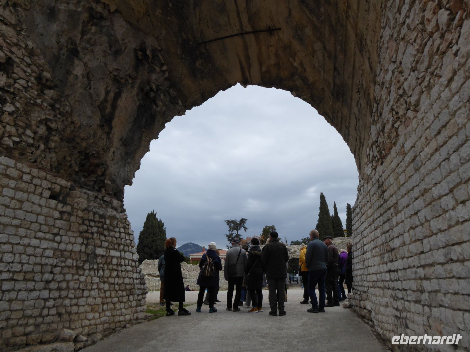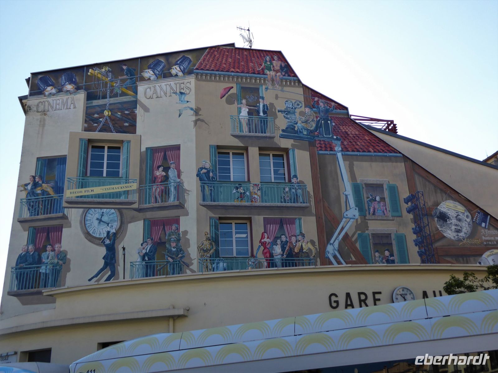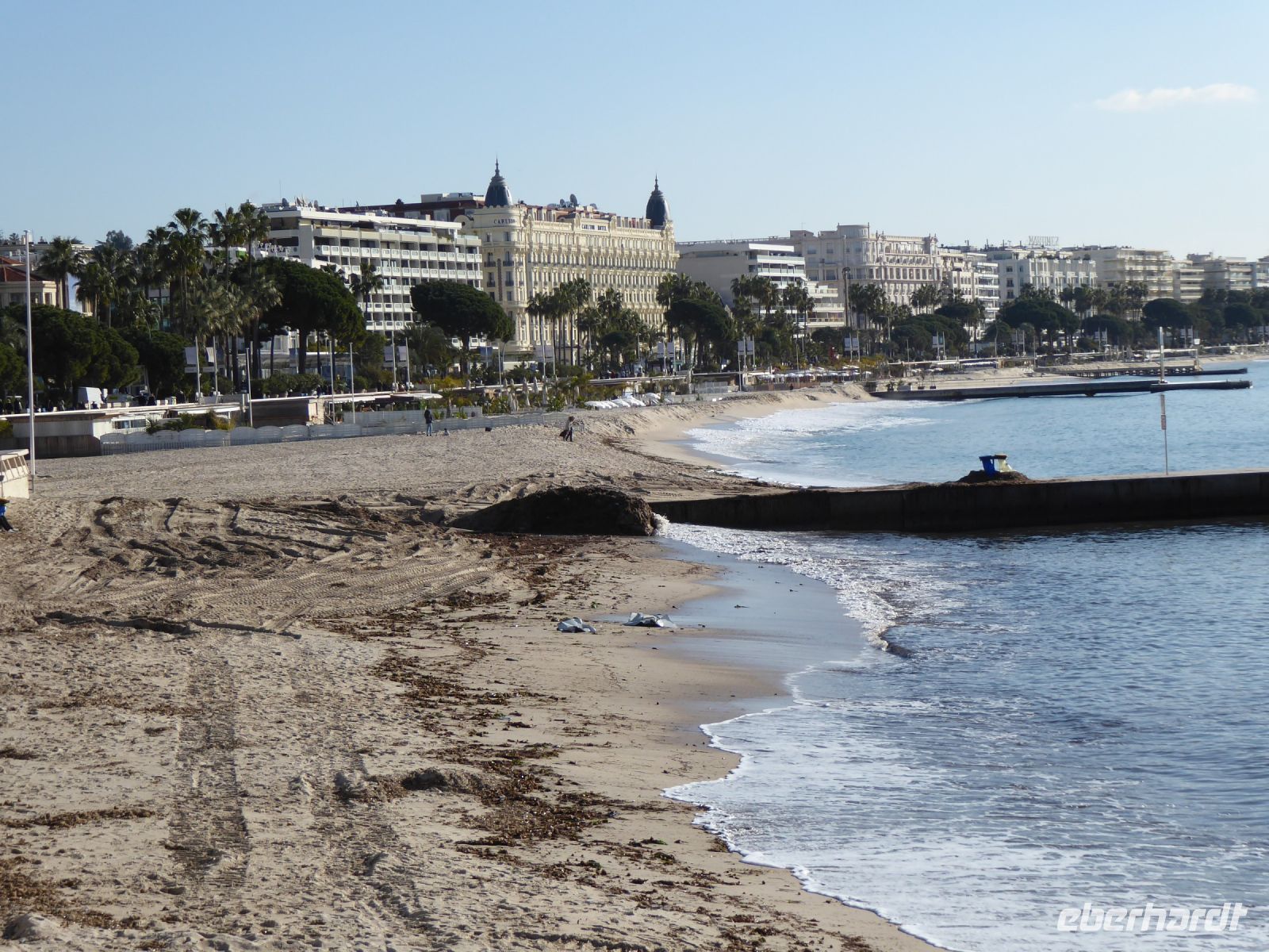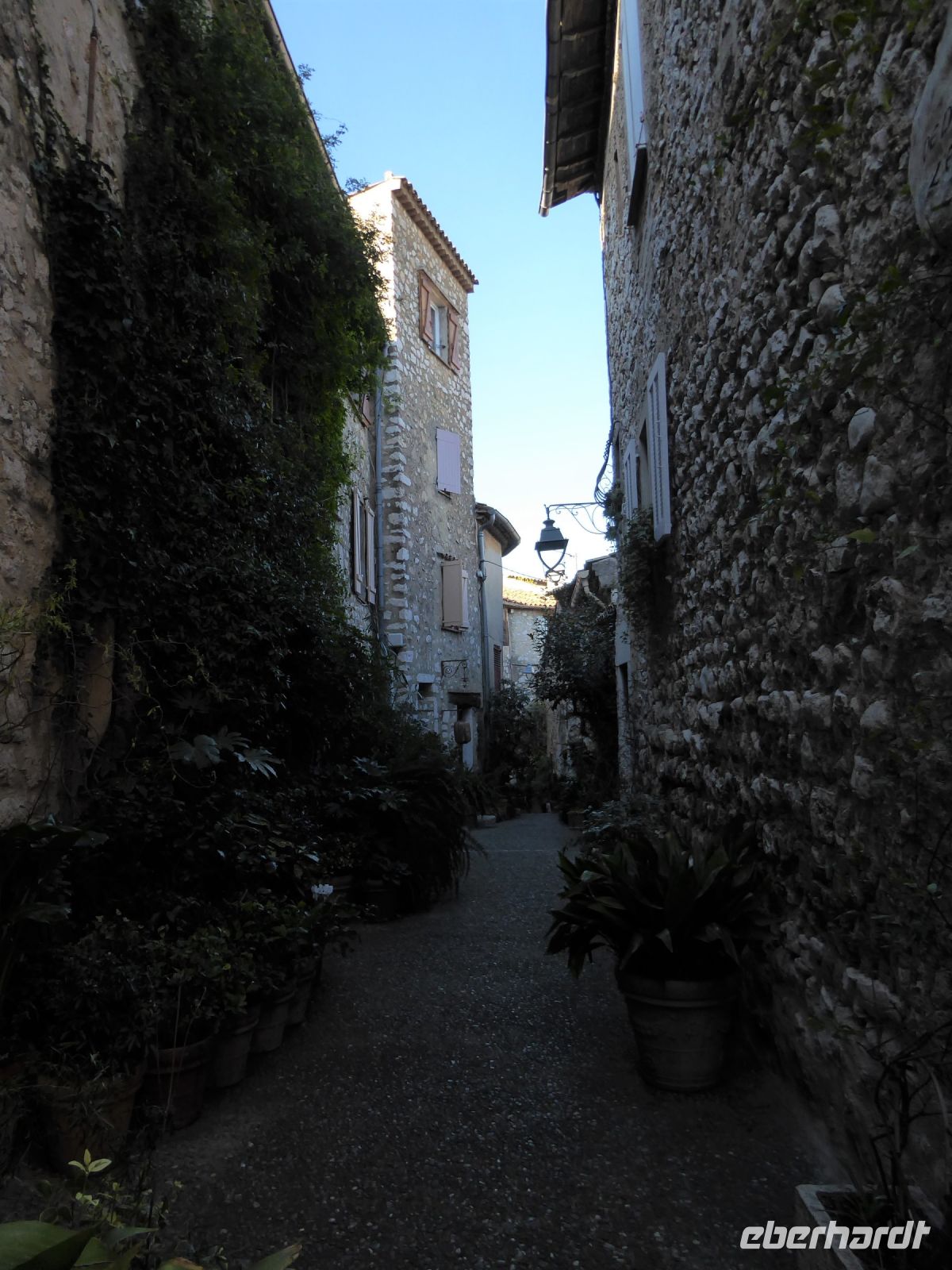 Wieder schien die Sonne herrlich vom blauen Himmel, als wir um 9:00 Uhr den Bus bestiegen und Richtung Westen nach Cannes fuhren. In der knappen Stunde Fahrtzeit unterhielt uns Hannelore fachkundig mit Geschichten und amüsanten Anekdoten von der Côte d´Azur, die vor vielen Jahrzehnten zu ihrer Heimat wurde. Unser Fahrer Jean-Pascal ließ uns direkt am alten Hafen in Cannes aussteigen. Gemütlich spazierten wir zum Casino und Filmfestspielpalast. Wir bestaunten die Handabdrücke berühmter Filmemacher und die der ganz Großen der Schauspielkunst, die sich, mit der begehrten goldenen Palme von Cannes ausgezeichnet, hier in dem berühmten Walk of Fame vor dem Gebäudekomplex verewigen durften: Sylvester Stallone, Penélope Cruz, Jean-Paul Belmondo, Nicole Kidman, George Lucas, Julia Roberts, Brad Pitt und 400 weitere Filmschaffende. Und schon sahen wir sie, die berühmte Treppe mit dem nicht minder berühmten roten Teppich. Leider mussten wir uns für unsere Fotos wegen einer Veranstaltung mit dem orangefarbenen Teppich auf der Treppe des Nebeneingangs begnügen. Doch Hannelore zeigte uns ein kleines Stückchen der legendären Auslegware, das sie in weiser Voraussicht mitgebracht hatte. Bei angenehmen Temperaturen, die fast die 15°C Marke erreichten, spazierten wir den Sandstrand entlang und bestaunten die Luxushotels und Nobelboutiquen, die sich am berühmten Boulevard de la Croisette angesiedelt haben. Doch überall wird gebaggert und planiert, Cannes bereitet sich auf die 76. Auflage der Internationalen Filmfestspiele vor. Der Hauptplatz ist fast fertig und so verbrachten wir dort eine angenehme, sonnige Mittagspause in der Stadt der Schönen und Reichen. Auf dem Hügel über der Stadt liegt das Château de la Castre. Von da oben hat man einen einmaligen Panoramablick auf die Bucht von Cannes und die beiden Inseln Ste. Marguerite und St. Honorat. Der berühmte Schriftzug der Stadt bietet ein ideales Fotomotiv. In der Wallfahrtskirche Nôtre-Dame de l´Espérance konnten wir eine der schönen provenzalischen Krippen mit bewegten Figuren und Musik bewundern. Gemütlich bummelten wir durch die engen Gassen, über den Markt und vorbei am Busbahnhof mit seiner bemalten Fassade, einer bunten Hommage an die große Kunst des internationalen Films. Am frühen Nachmittag kletterten wir wieder in den Bus und fuhren in die Berge nach St. Paul de Vence, einem mittelalterlich anmutenden Dorf, das eng mit den Namen berühmter Maler und Schauspieler verknüpft ist: Sofia Loren, Lino Ventura, Yves Montand und Curd Jürgens, Chagall, Léger, Matisse, Miró und Picasso sowie die sogenannte High Society, alle waren sie gern gesehene Gäste im 1931 eröffneten Lokal „La Colombe d´Or“ von Paul und Babtistine Roux. Chagall und Jürgens lebten hier in enger Nachbarschaft und auf dem malerisch am Hang gelegenen Friedhof fand der Malerpoet Marc Chagall auch seine letzte Ruhestätte. Die pittoresken Gassen und die grandiosen Aussichten einerseits auf die Alpes maritimes und andererseits auf das Mittelmeer bezauberten auch uns und so genossen wir die warme Sonne und die herrliche Landschaft.