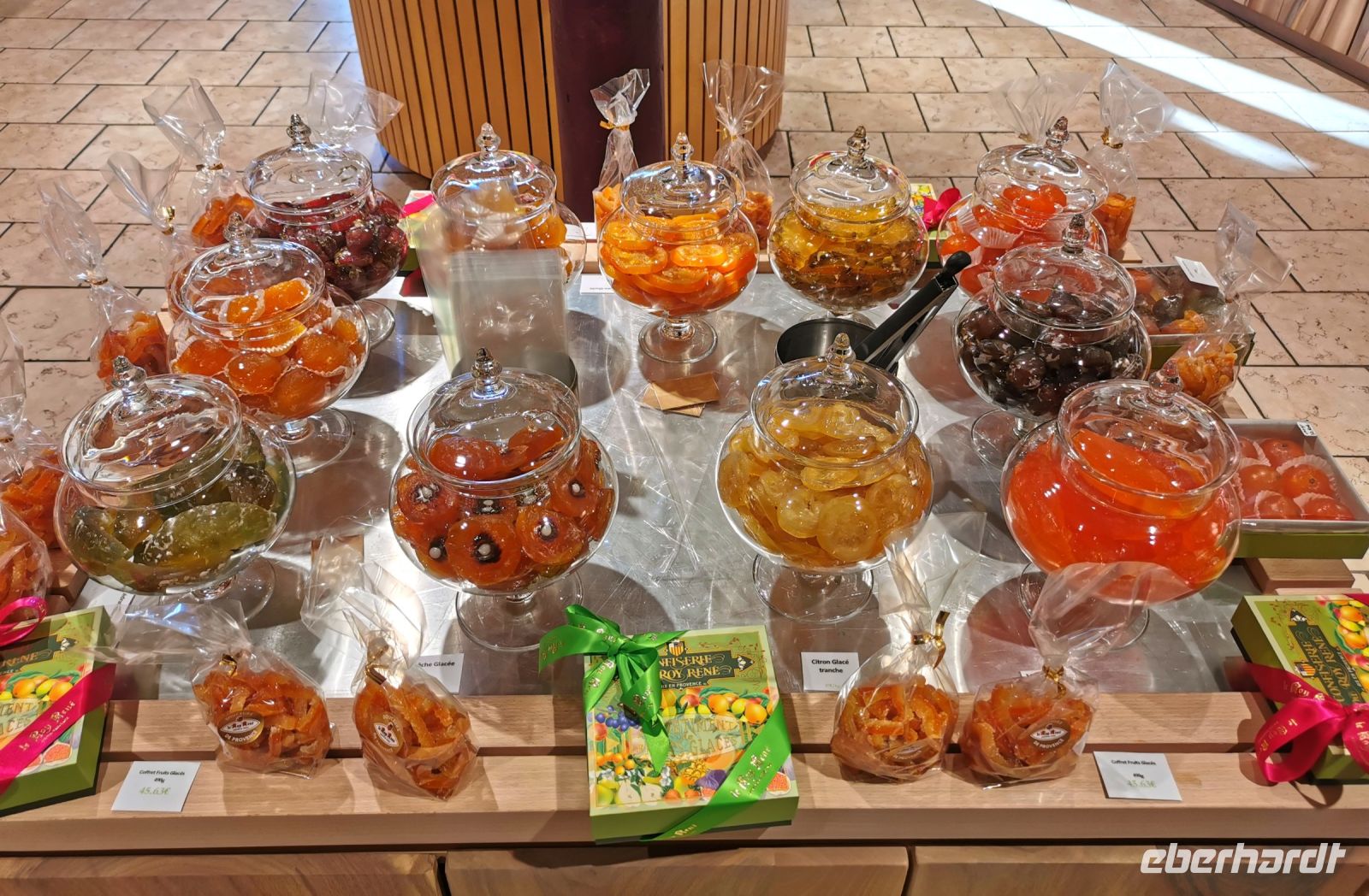 Nach einem gemütlichen, dem gestrigen Abend angepassten, späten Frühstück im Hotel blieb noch etwas Zeit, die Sonne zu genießen oder in den nahe gelegenen Geschäften letzte Einkäufe zu tätigen. Schließlich wollten die mit Schneeschippen beauftragten Zuhausegebliebenen, mit einer kleinen Gabe von der Côte d´Azur bedacht werden. Ein Glas Tapenade vielleicht, der leckere Brotaufstrich aus schwarzen Oliven und Sardellenfilets oder lieber doch was Süßes, wie die leckeren Calissons? Die Wahl fällt nicht leicht, gibt es doch eine Vielzahl ganz besonderer landestypischer Produkte.