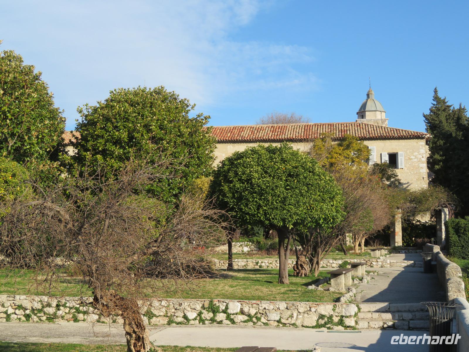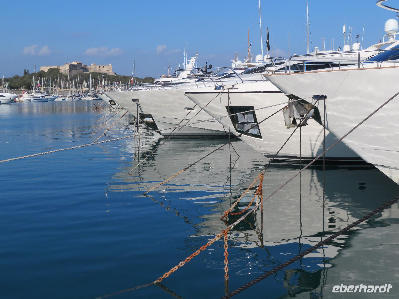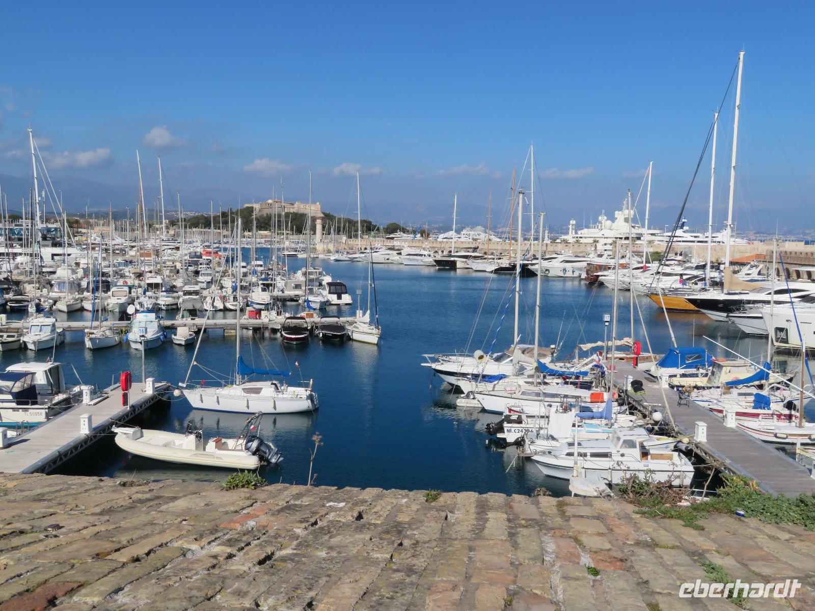 Nach knapp einer Stunde Busfahrt erreichten wir Cannes, dessen Uferstraße Croisette ein wenig vergleichbar ist mit dem Boulevard Angleterre von Nizza. Hotelbauten der Belle Epoque prägen das mittelmeernahe Stadtbild. Seit 1946 ist das Filmfestival von Cannes, das die „Goldene Palme" vergibt, der Medienhöhepunkt von Cannes. Der Kongress- und Festivalpalast ist indes im typischen Architekturstil der sechziger und siebziger Jahre erbaut: nicht ganz „Raffinerie" wie das Centre Pompidou in Paris, aber dennoch mit wenig Charme, zudem von Absperrungen und Baustellen an der Croisette umgeben. Dennoch entdeckten wir zahlreiche der Handabdrücke bedeutender Filmschauspieler und Regisseure, wenn auch alles sehr unspektakulär und kaum auffallend. Manche Unterschrift konnten wir dann auch deuten: Nicole Kidman ganz zart und Silvester Stallone fast tatzenhaft. Wer Lust hatte, stieg westlich des Hafenbeckens zum kleinen Plateau an der Kirche auf und blickte in warmen Sonnenlicht auf die Bucht von Cannes. Zur Mittagszeit ging es weiter nach Antibes mit einem Hafenbecken für wohl 1700 Boote und Jachten; manche sucht auch einen neuen Eigner (für schlappe 4 bis 15 Millionen Euro). Wir bummelten bescheiden und individuell durch die Altstadt, wo sich im Grimaldi-Schloss eine Kunstwerkeausstellung befindet, darunter zwei Dutzend Picassos aus seiner Zeit in Antibes. Auf der Küstenstraße ging es etwas stauig zurück nach Nizza; im Hintergrund die schneebedeckten Berge der Seealpen.