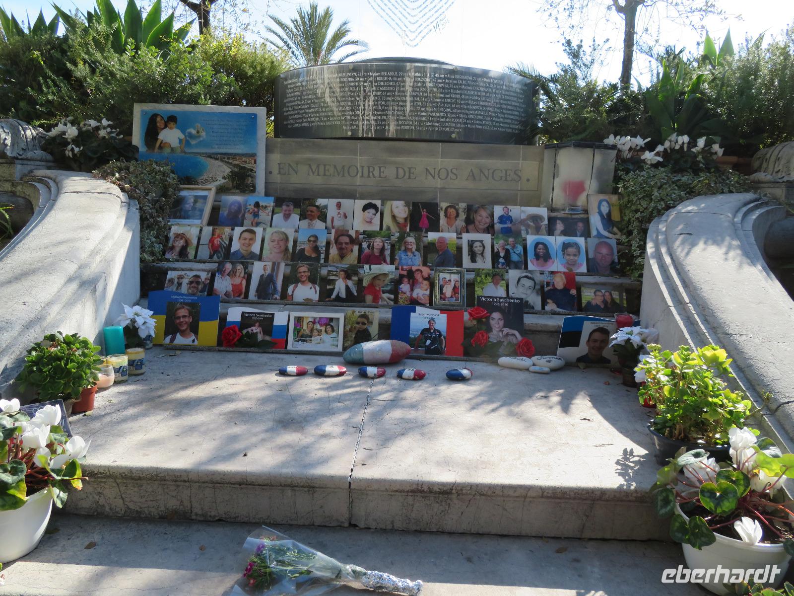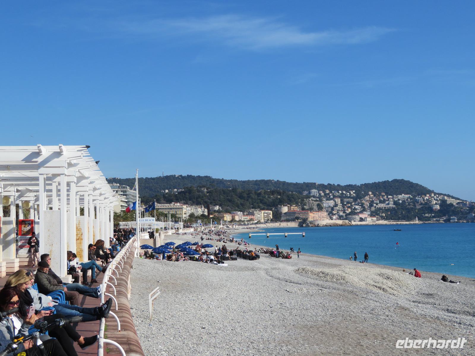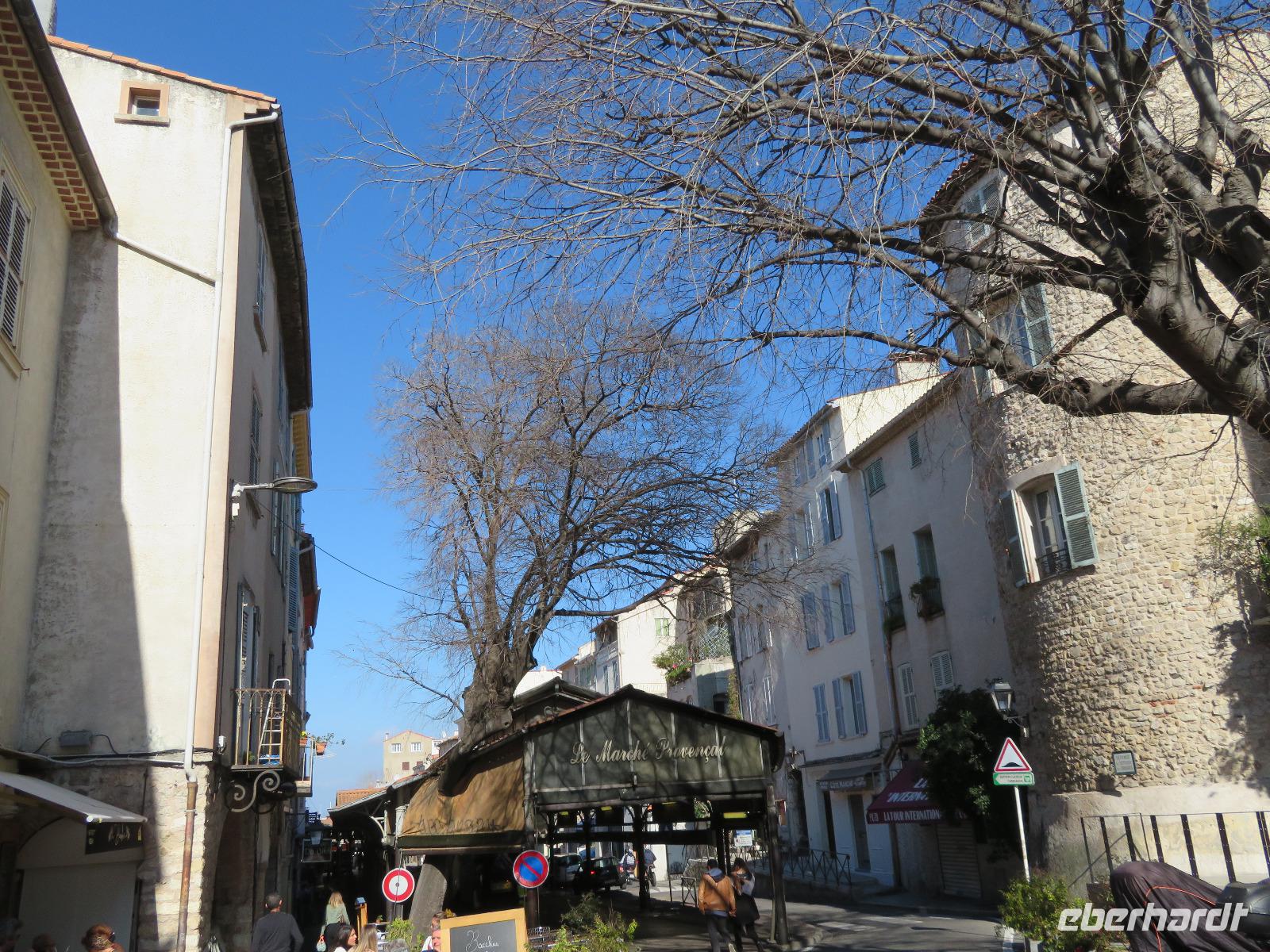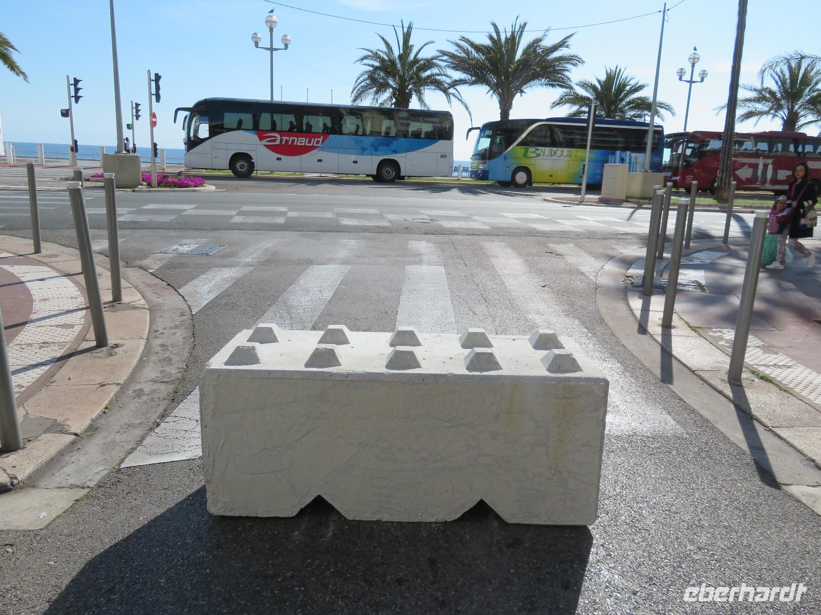 Nach knapp einer Stunde Busfahrt erreichten wir Cannes, dessen Uferstraße Croisette ein wenig vergleichbar ist mit dem Boulevard Angleterre von Nizza. Hotelbauten der Belle Epoque prägen das mittelmeernahe Stadtbild. Seit 1946 ist das Filmfestival von Cannes, das die „Goldene Palme" vergibt, der Medienhöhepunkt von Cannes. Der Kongress- und Festivalpalast ist indes im typischen Architekturstil der sechziger und siebziger Jahre erbaut: nicht ganz „Raffinerie" wie das Centre Pompidou in Paris, aber dennoch mit wenig Charme, zudem von Absperrungen und Baustellen an der Croisette umgeben. Dennoch entdeckten wir zahlreiche der Handabdrücke bedeutender Filmschauspieler und Regisseure, wenn auch alles sehr unspektakulär und kaum auffallend. Manche Unterschrift konnten wir dann auch deuten: Nicole Kidman ganz zart und Silvester Stallone fast tatzenhaft. Wer Lust hatte, stieg westlich des Hafenbeckens zum kleinen Plateau an der Kirche auf und blickte in warmen Sonnenlicht auf die Bucht von Cannes. Zur Mittagszeit ging es weiter nach Antibes mit einem Hafenbecken für wohl 1700 Boote und Jachten; manche sucht auch einen neuen Eigner (für schlappe 4 bis 15 Millionen Euro). Wir bummelten bescheiden und individuell durch die Altstadt, wo sich im Grimaldi-Schloss eine Kunstwerkeausstellung befindet, darunter zwei Dutzend Picassos aus seiner Zeit in Antibes. Auf der Küstenstraße ging es etwas stauig zurück nach Nizza; im Hintergrund die schneebedeckten Berge der Seealpen.
