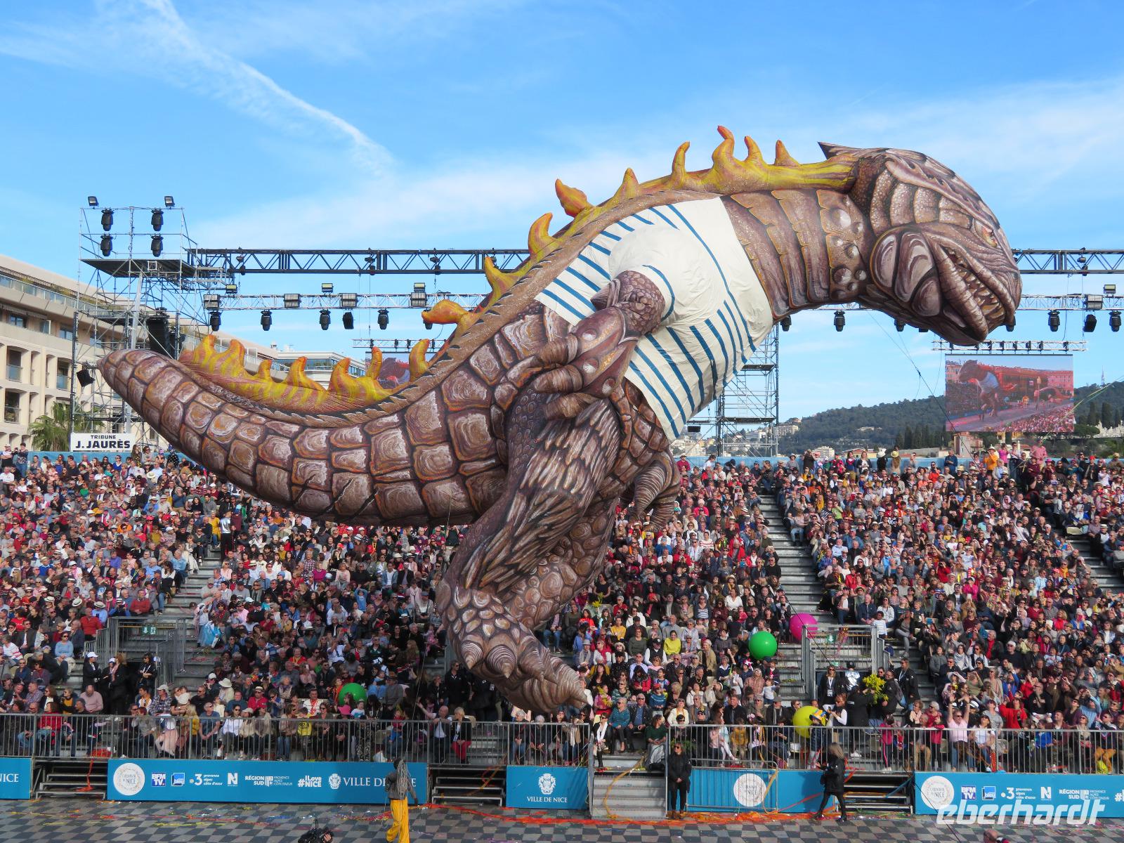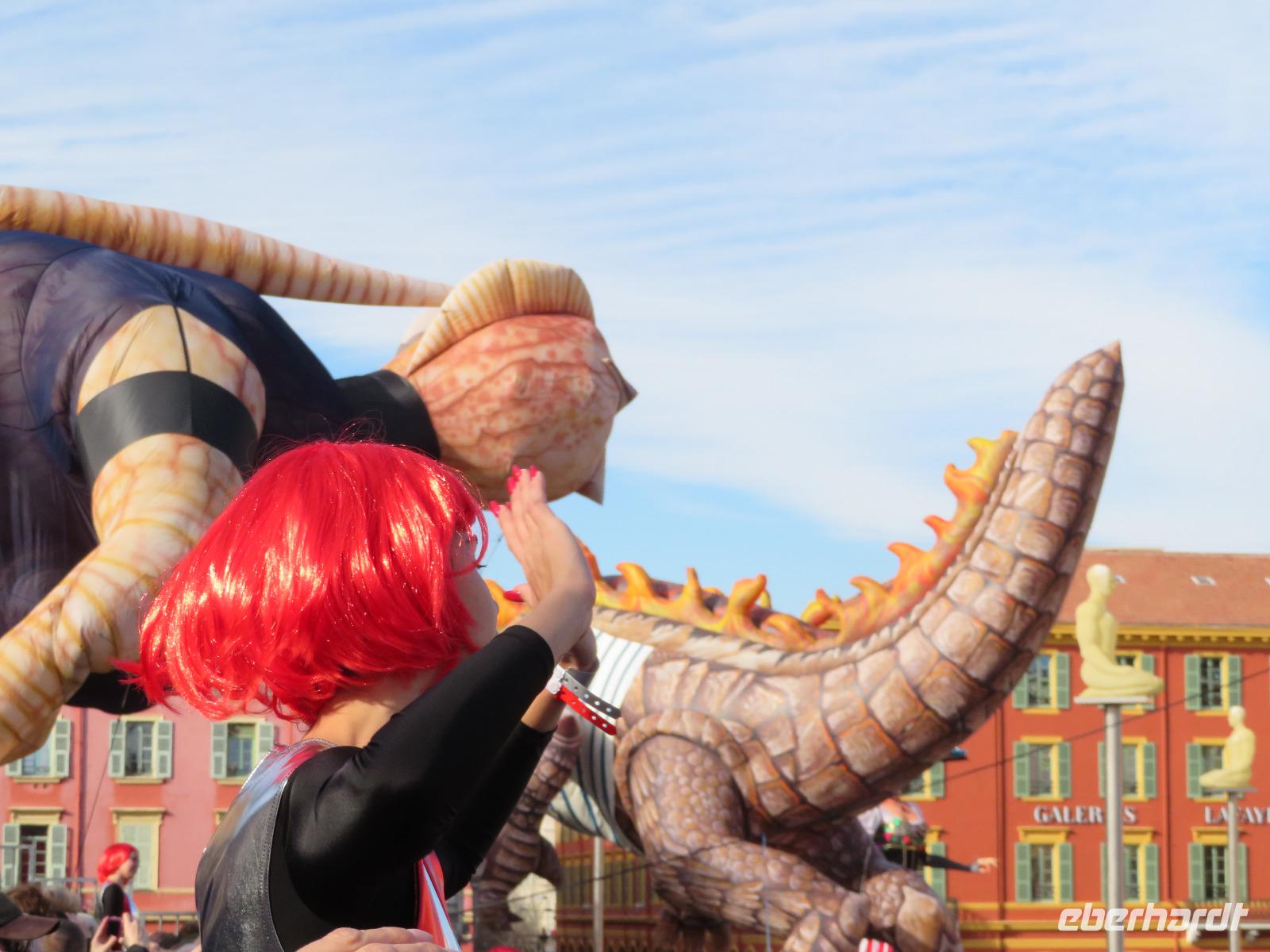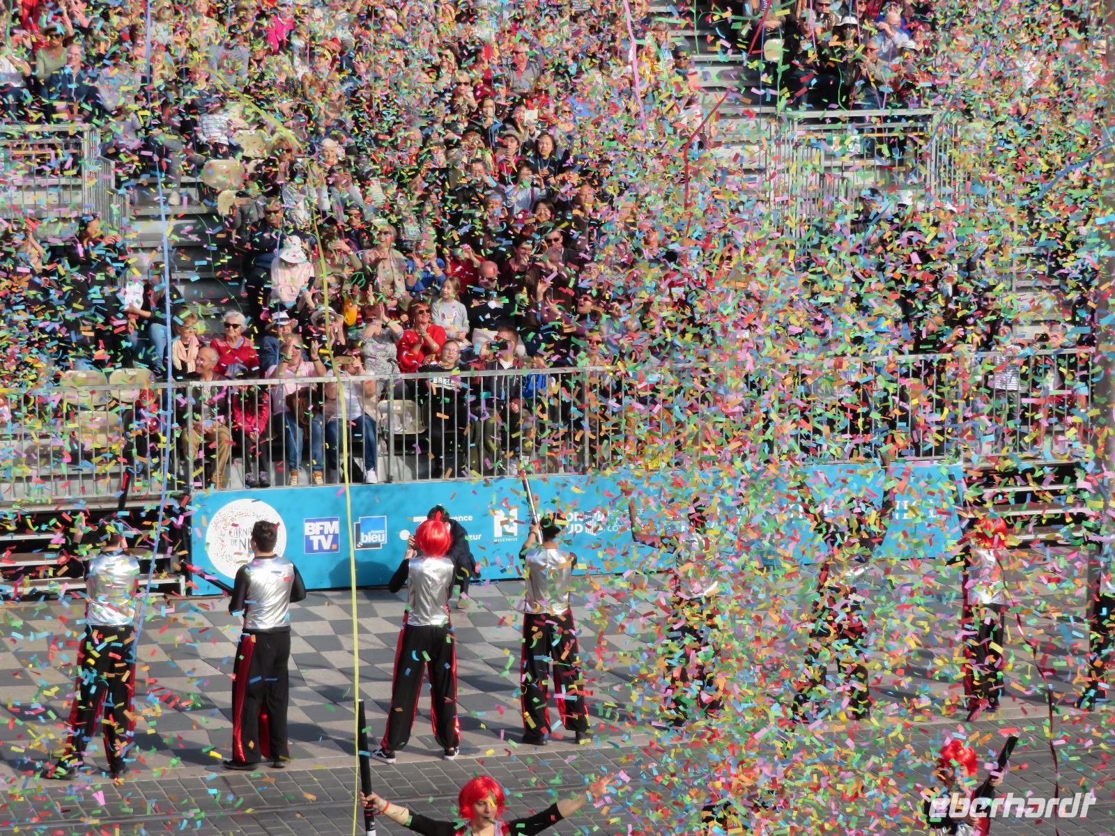 Mit ausreichend zeitlichem Puffer vor Beginn des Blumencorsos im Rahmen des Karnevals von Nizza trafen wir uns am Nachmittag auf unseren Tribünenplätzen. Wohl sechzehn gestaltete Karnevalswagen voller Blüten, Musik- und Tanzensemble aus aller Welt gestalteten den fröhlichen Umzug, der 2020 unter dem Motto „König der Mode" stand - ein wenig um die Ecke schaute dabei eine riesige Büste, die auf Karl Lagerfeld (oder Dali?) abzielte. In der zweiten Runde des Corsos verteilen die Umzugsteilnehmer die wohl 80. bis 100.000 Blumen an die Zuschauer auf den Tribünen, die sich zunehmend lichteten.