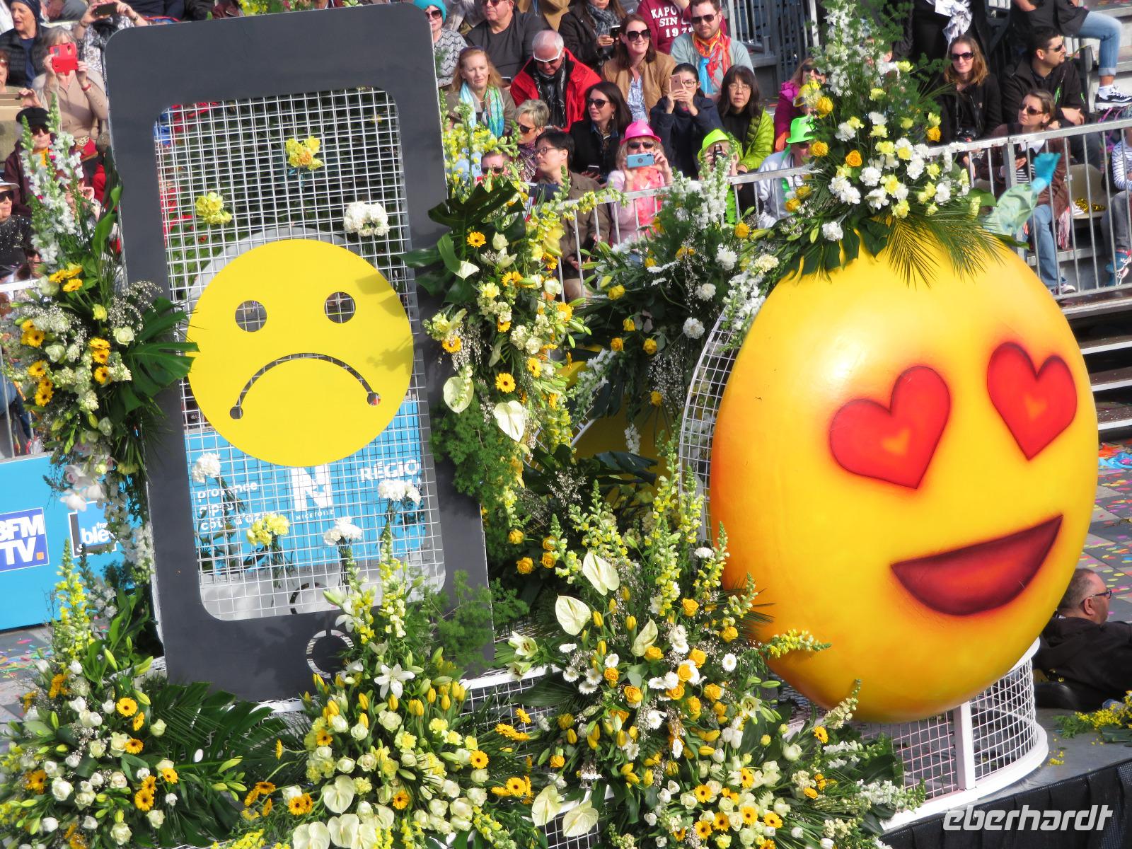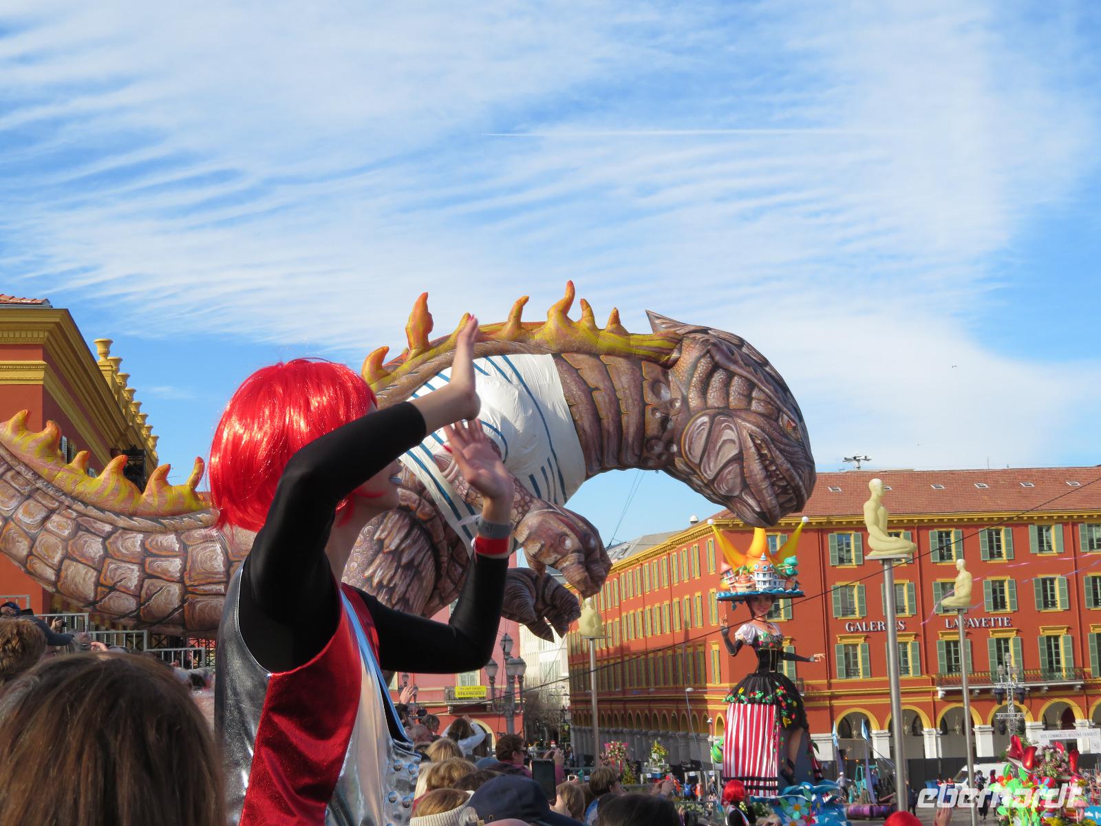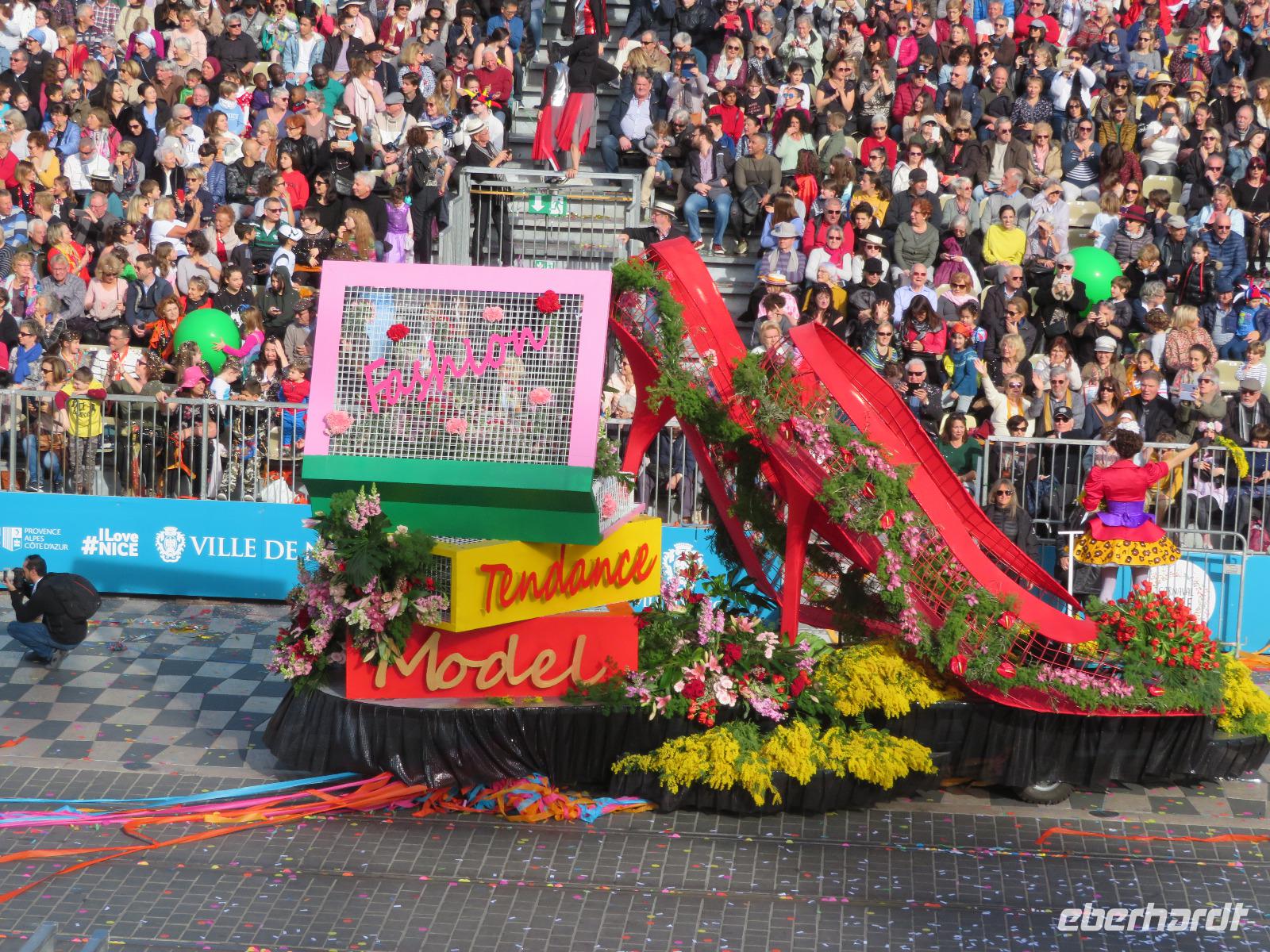 Mit ausreichend zeitlichem Puffer vor Beginn des Blumencorsos im Rahmen des Karnevals von Nizza trafen wir uns am Nachmittag auf unseren Tribünenplätzen. Wohl sechzehn gestaltete Karnevalswagen voller Blüten, Musik- und Tanzensemble aus aller Welt gestalteten den fröhlichen Umzug, der 2020 unter dem Motto „König der Mode" stand - ein wenig um die Ecke schaute dabei eine riesige Büste, die auf Karl Lagerfeld (oder Dali?) abzielte. In der zweiten Runde des Corsos verteilen die Umzugsteilnehmer die wohl 80. bis 100.000 Blumen an die Zuschauer auf den Tribünen, die sich zunehmend lichteten.