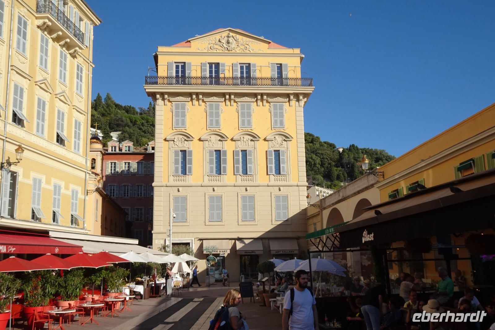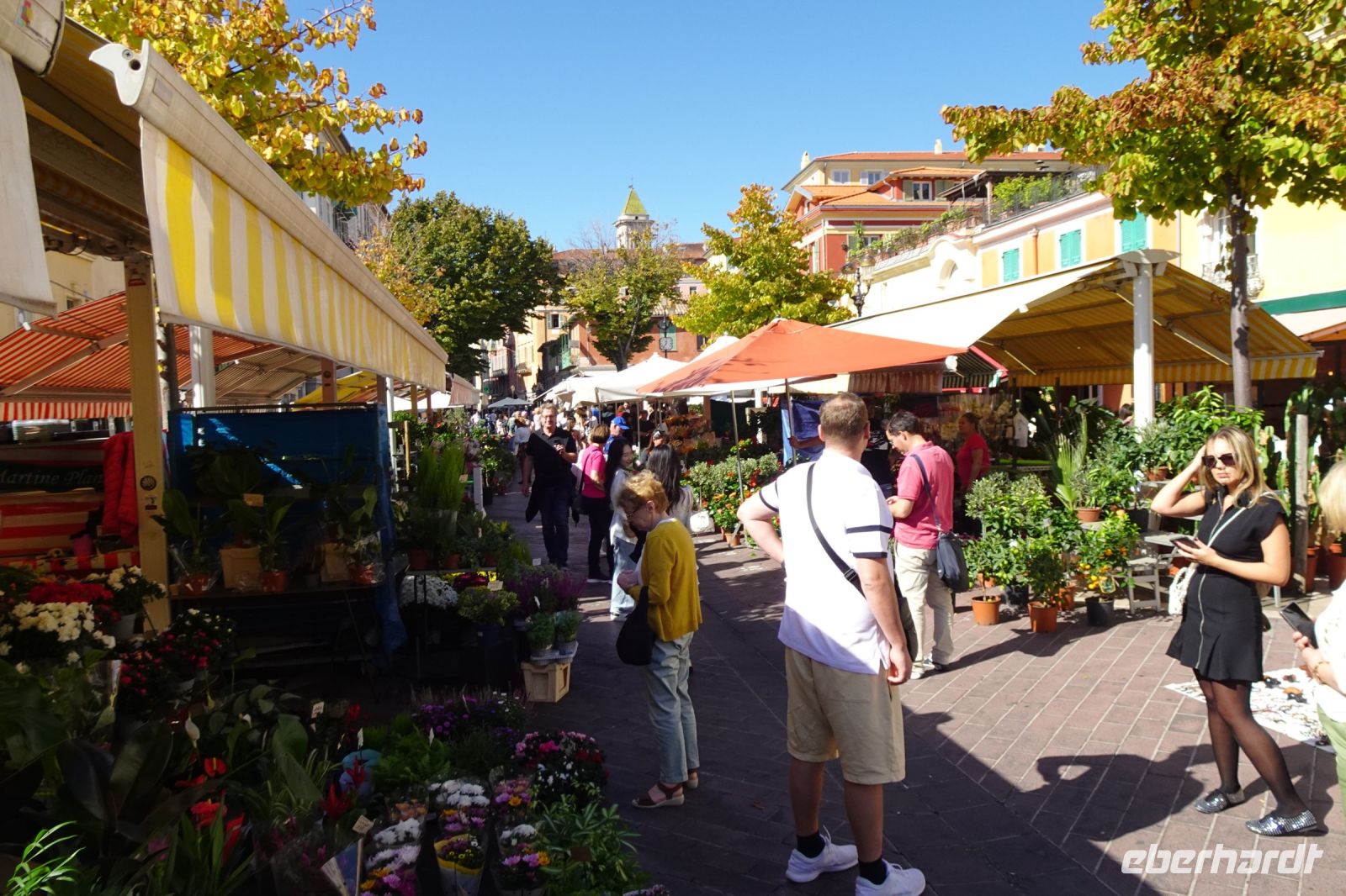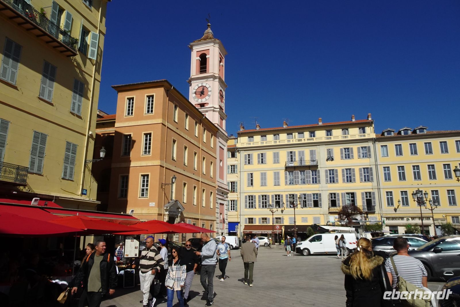 Schon früh am Morgen trafen die ersten Gäste unserer Reisegruppe am Flughafen in Frankfurt ein. Für unsere Reisenden aus dem Norden mit Anschlussflug, war die Nacht sehr kurz und viele, die eine längere Anreise mit dem PKW oder der Bahn hatten, entschieden sich, bereits am Vortag nach Frankfurt anzureisen. Pünktlich hob unser Flieger ab und wir erlebten einen ruhigen Flug über die Alpen. Kaum zwei Stunden später glitzerte unter uns schon das Mittelmeer. In Nizza angekommen, brachten uns in einer knappen halben Stunde die bereitstehenden Vans bequem direkt zu unserem 4-Sterne Hotel „Le Grimaldi“ am Rande der Altstadt. Die Fahrt vom Flughafen zum Hotel gab uns schon einen ersten Eindruck von der legendären Côte d´Azur: Die Sonne strahlte vom blitzblauen Himmel, als wir die palmenbestandene Promenade des Anglais entlangfuhren. Nach dem freundlichen Empfang im Hotel konnten wir gleich alle unsere Zimmer beziehen und ließen nicht viel Zeit verstreichen, um bei einem kleinen Entdeckerspaziergang entlang der Promenade etwas Sonne zu tanken. Bei angenehmen 22°C bummelten wir am Meer entlang. Hier reihen sich berühmte Hotels der Belle Époque aneinander, allen voran das Hotel Le Negresco, das seit 1912 seine auffällige pinkfarbene Kuppel in den Himmel reckt. (Einem Gerücht zufolge soll diese von Gustave Eiffel konstruiert worden sein, dem dafür der Busen seiner Geliebten als Modell diente.) Seit der Wiederentdeckung der Riviera in den fünfziger Jahren, geben sich in dieser Nobelherberge prominente Größen aus Politik und Wirtschaft, Jetset und Showbiz die Klinke in die Hand. Rechts von uns rollte das Meer in langen Wellen an den Strand und tatsächlich konnte man schon die ersten Badenden erspähen, die sich nach den großen Unwetter der vergangenen Tage wieder ins Wasser wagten. Gemütlich gingen wir vorbei an der beeindruckenden Architektur der die Promenade säumenden Gebäude, den imposanten Kunstwerken und den gepflegten Grünanlagen, bis hinein ins Herz der Altstadt von Nizza mit ihrem wunderschönen Marktplatz.