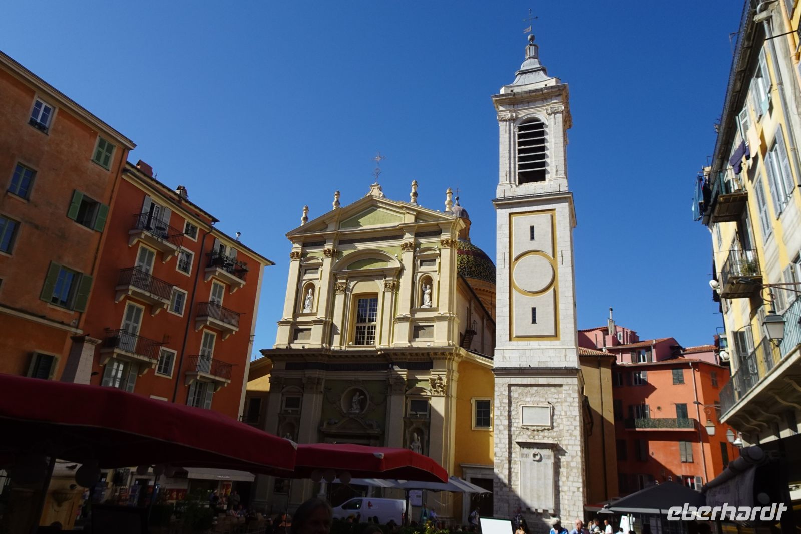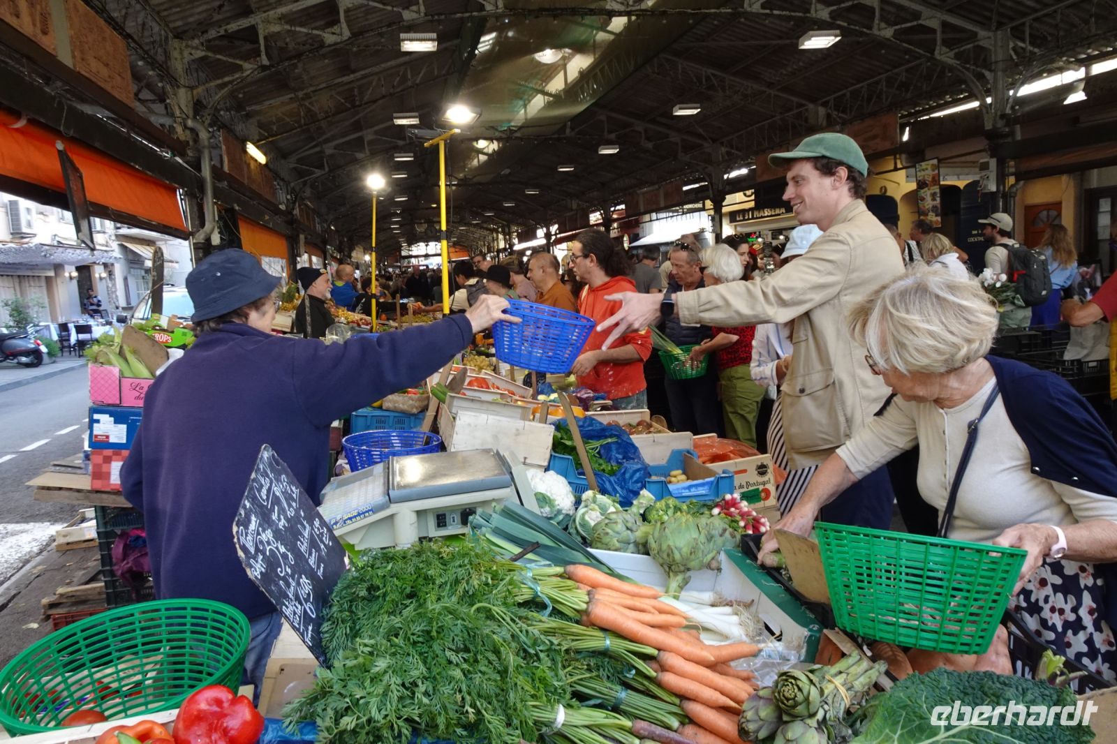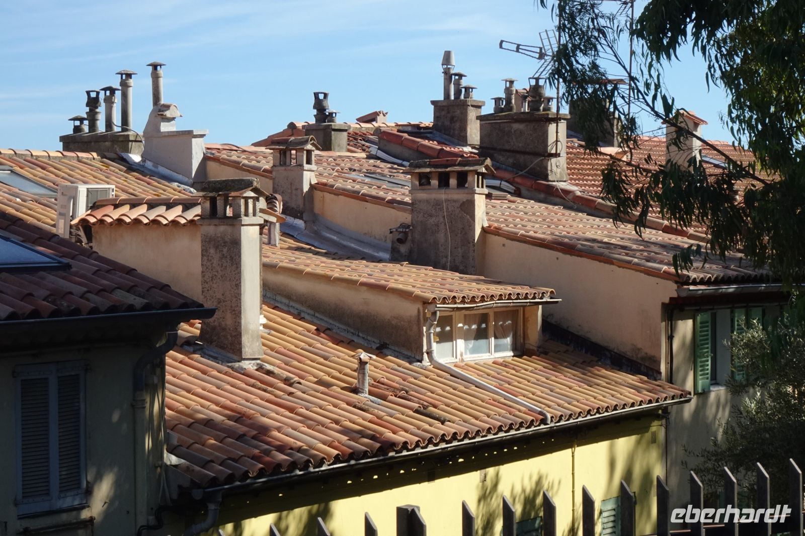 Schon früh am Morgen trafen die ersten Gäste unserer Reisegruppe am Flughafen in Frankfurt ein. Für unsere Reisenden aus dem Norden mit Anschlussflug, war die Nacht sehr kurz und viele, die eine längere Anreise mit dem PKW oder der Bahn hatten, entschieden sich, bereits am Vortag nach Frankfurt anzureisen. Pünktlich hob unser Flieger ab und wir erlebten einen ruhigen Flug über die Alpen. Kaum zwei Stunden später glitzerte unter uns schon das Mittelmeer. In Nizza angekommen, brachten uns in einer knappen halben Stunde die bereitstehenden Vans bequem direkt zu unserem 4-Sterne Hotel „Le Grimaldi“ am Rande der Altstadt. Die Fahrt vom Flughafen zum Hotel gab uns schon einen ersten Eindruck von der legendären Côte d´Azur: Die Sonne strahlte vom blitzblauen Himmel, als wir die palmenbestandene Promenade des Anglais entlangfuhren. Nach dem freundlichen Empfang im Hotel konnten wir gleich alle unsere Zimmer beziehen und ließen nicht viel Zeit verstreichen, um bei einem kleinen Entdeckerspaziergang entlang der Promenade etwas Sonne zu tanken. Bei angenehmen 22°C bummelten wir am Meer entlang. Hier reihen sich berühmte Hotels der Belle Époque aneinander, allen voran das Hotel Le Negresco, das seit 1912 seine auffällige pinkfarbene Kuppel in den Himmel reckt. (Einem Gerücht zufolge soll diese von Gustave Eiffel konstruiert worden sein, dem dafür der Busen seiner Geliebten als Modell diente.) Seit der Wiederentdeckung der Riviera in den fünfziger Jahren, geben sich in dieser Nobelherberge prominente Größen aus Politik und Wirtschaft, Jetset und Showbiz die Klinke in die Hand. Rechts von uns rollte das Meer in langen Wellen an den Strand und tatsächlich konnte man schon die ersten Badenden erspähen, die sich nach den großen Unwetter der vergangenen Tage wieder ins Wasser wagten. Gemütlich gingen wir vorbei an der beeindruckenden Architektur der die Promenade säumenden Gebäude, den imposanten Kunstwerken und den gepflegten Grünanlagen, bis hinein ins Herz der Altstadt von Nizza mit ihrem wunderschönen Marktplatz.