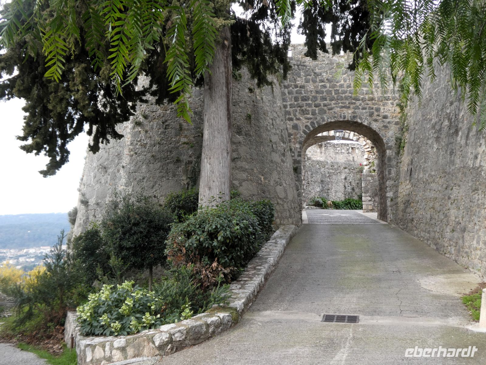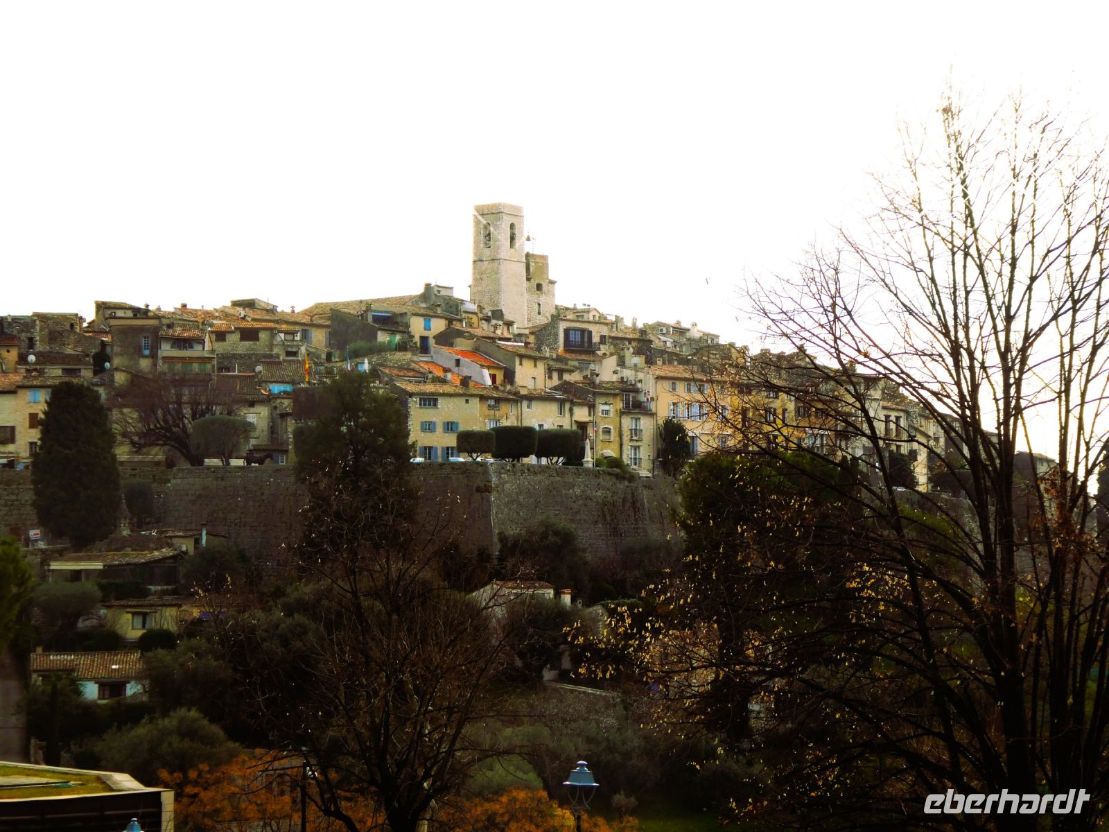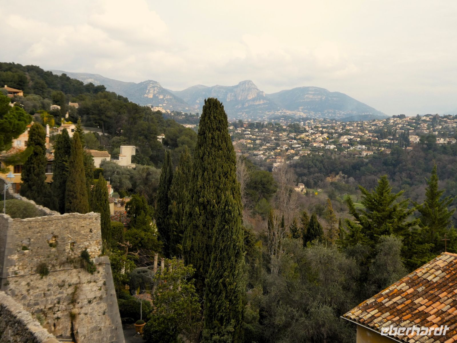Wir gehen durch die mittelalterliche Stadtmauer und laufen langsam und stetig entlang der alten Stadtmauer hinauf in südliche Richtung. Wir haben wunderbare Ausblicke auf die Ausläufer der Seealpen. Blumenschmuck und schöne Portale unterstreichen die gemütliche Atmosphäre. Vorbei an der Kirche aus dem 16.Jahrhundert und entlang zahlreicher Kunstgalerien erreichen wir das andere Ende des befestigten Ortes und haben auch von hier einen guten Ausblick zum "Massif des Maures" und auf den Friedhof des Ortes mit seinen schönen alten Familiengräbern. Besonders aber das Grab von Marc Chagall zieht unser Interesse auf sich. Es ist schlicht und von Steinen verschiedenster Art bedeckt, gemäß der jüdischen Tradition.