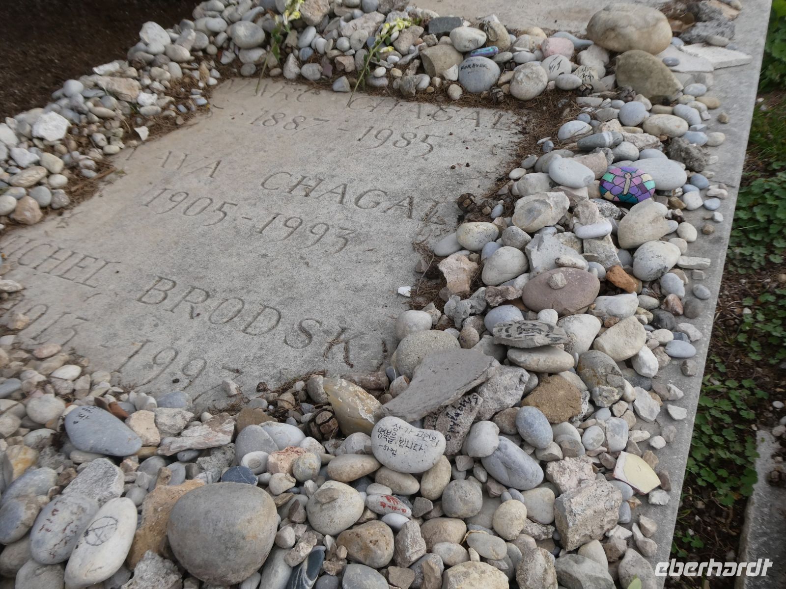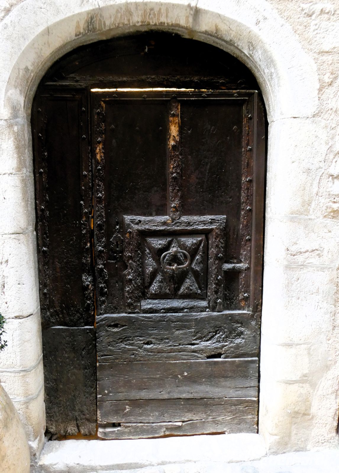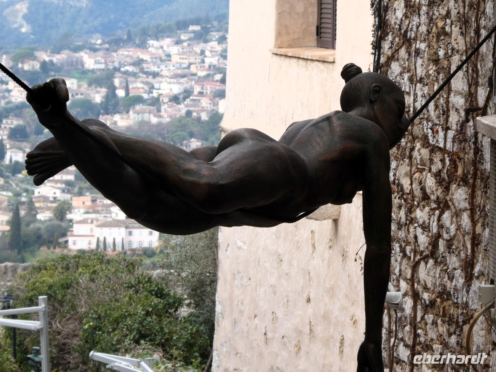 Wir gehen durch die mittelalterliche Stadtmauer und laufen langsam und stetig entlang der alten Stadtmauer hinauf in südliche Richtung. Wir haben wunderbare Ausblicke auf die Ausläufer der Seealpen. Blumenschmuck und schöne Portale unterstreichen die gemütliche Atmosphäre. Vorbei an der Kirche aus dem 16.Jahrhundert und entlang zahlreicher Kunstgalerien erreichen wir das andere Ende des befestigten Ortes und haben auch von hier einen guten Ausblick zum "Massif des Maures" und auf den Friedhof des Ortes mit seinen schönen alten Familiengräbern. Besonders aber das Grab von Marc Chagall zieht unser Interesse auf sich. Es ist schlicht und von Steinen verschiedenster Art bedeckt, gemäß der jüdischen Tradition.
