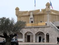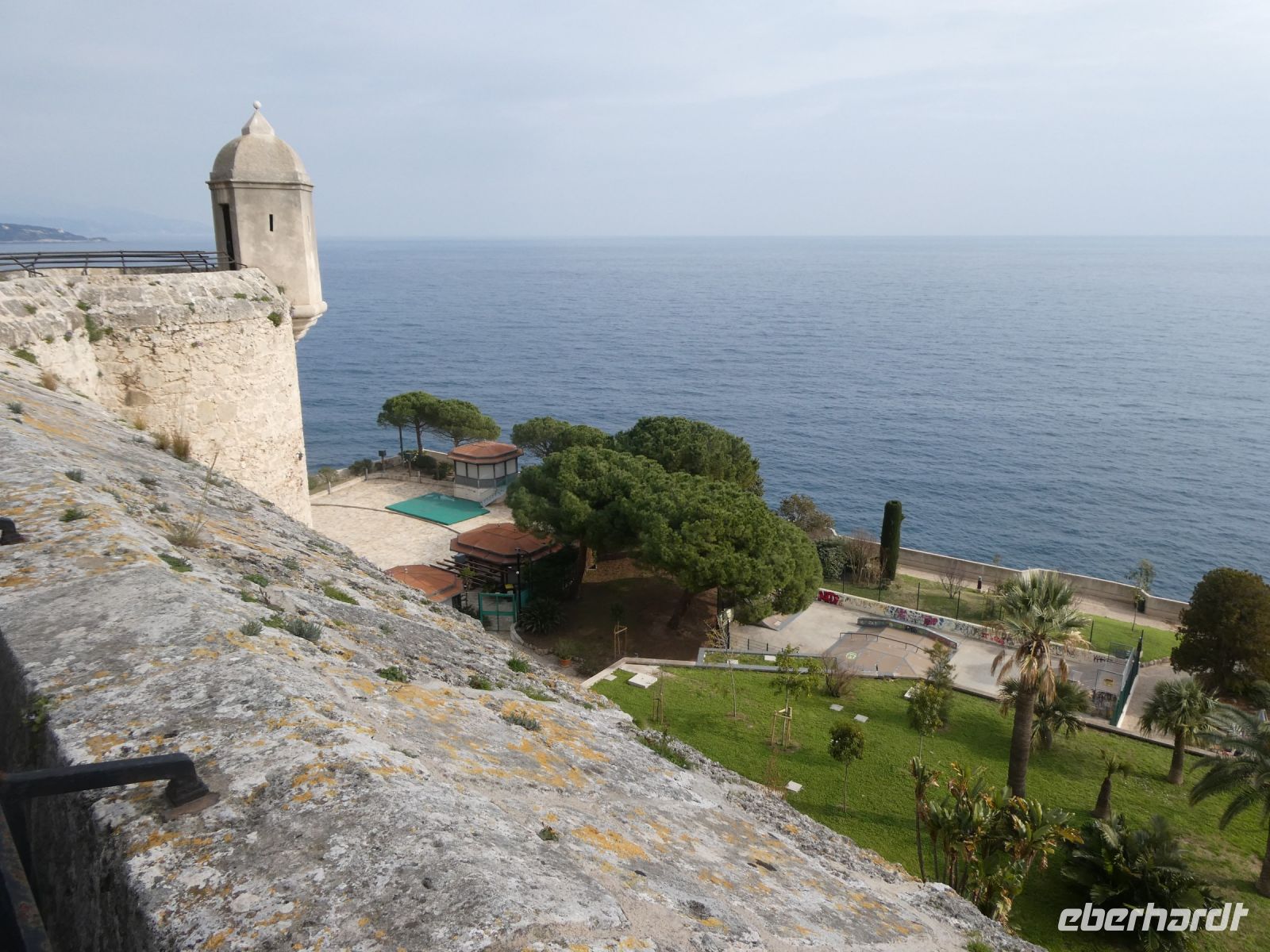 Mit Rolltreppe und Fahrstuhl kommen Wir wieder an die Oberfläche. Wir werfen erst einmal einen Blick auf die Rückseite des Ozeanografischen Museums aber Hannelore möchte uns erst das Gefängnis mit der besten Aussicht aller Gefängnisse Frankreichs, natürlich muss es "Monacos" heißen.