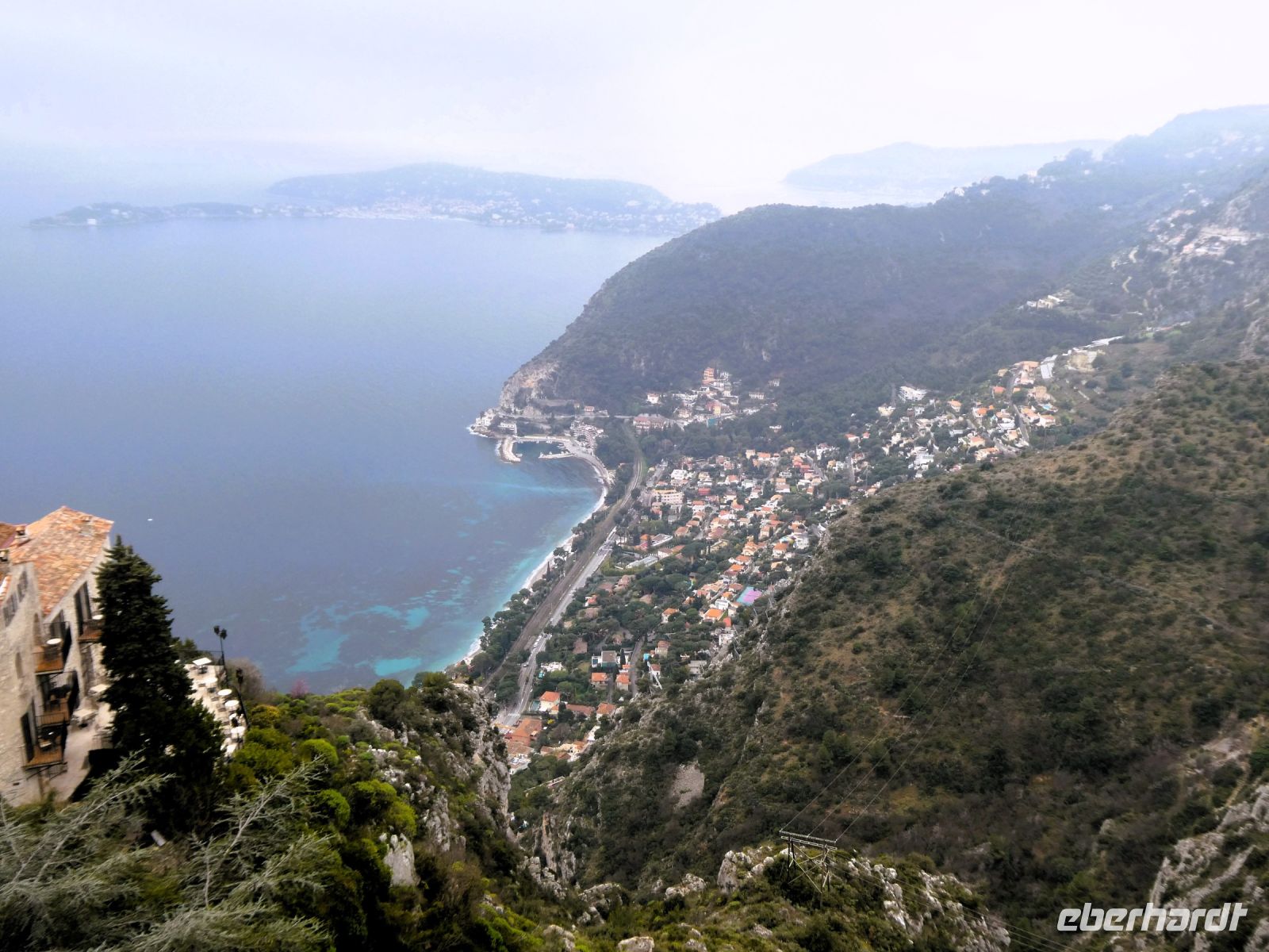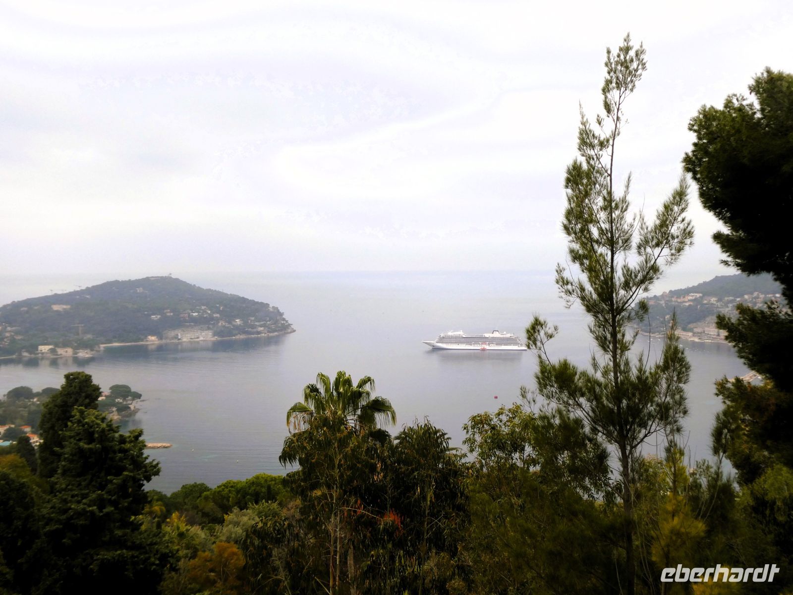 Heute Morgen starten wir in Richtung Osten entlang der Küste. Nicht weit entfernt streifen wir das berühmte Cap-Ferrat. An einem Aussichtspunkt machen wir einen Fotostopp über Villefranche-sur-Mer. Leider ist heute das Wetter etwas dunstig und der Himmel bewölkt. Kaum kann man die Villa Ephrussi de Rothschild ausmachen, welche dort heute als Museum besichtigt werden kann. Sie wurde im Stil der Renaissance von der Baronesse Béatrice de Rothschild am Ende des 19.Jahrhunderts errichtet, die eine leidenschaftliche Sammlerin war und hier ihren Traum verwirklichte. Sie vermachte das Haus der "Akademie der Schönen Künste" und so wurde es der Öffentlichkeit zugänglich gemacht. Es diente als Filmkulisse für zahlreiche Filme, wie Jamed Bond "Sag niemals nie" und "Das Auge" (französischer Spielfilm von 1983).
