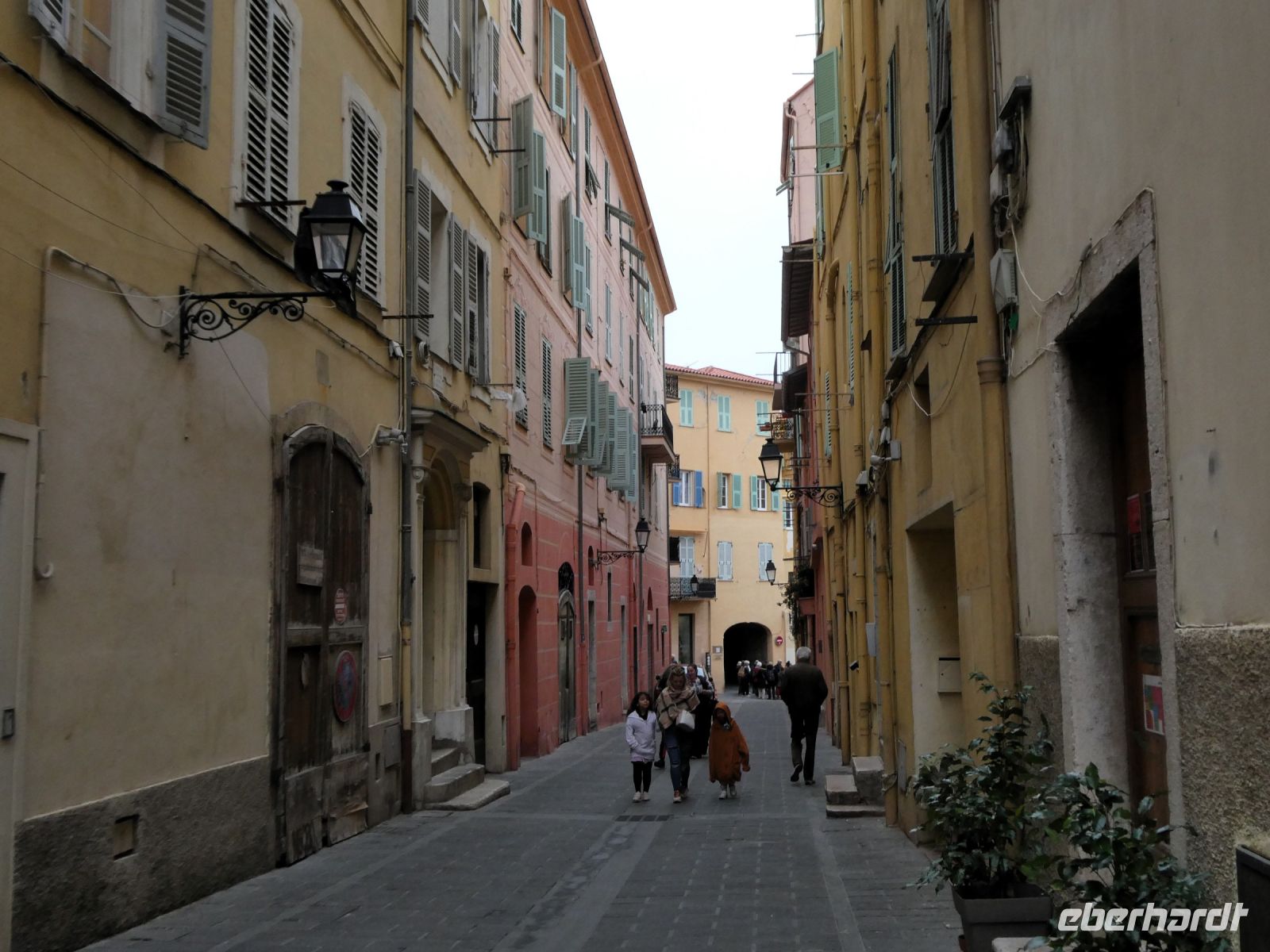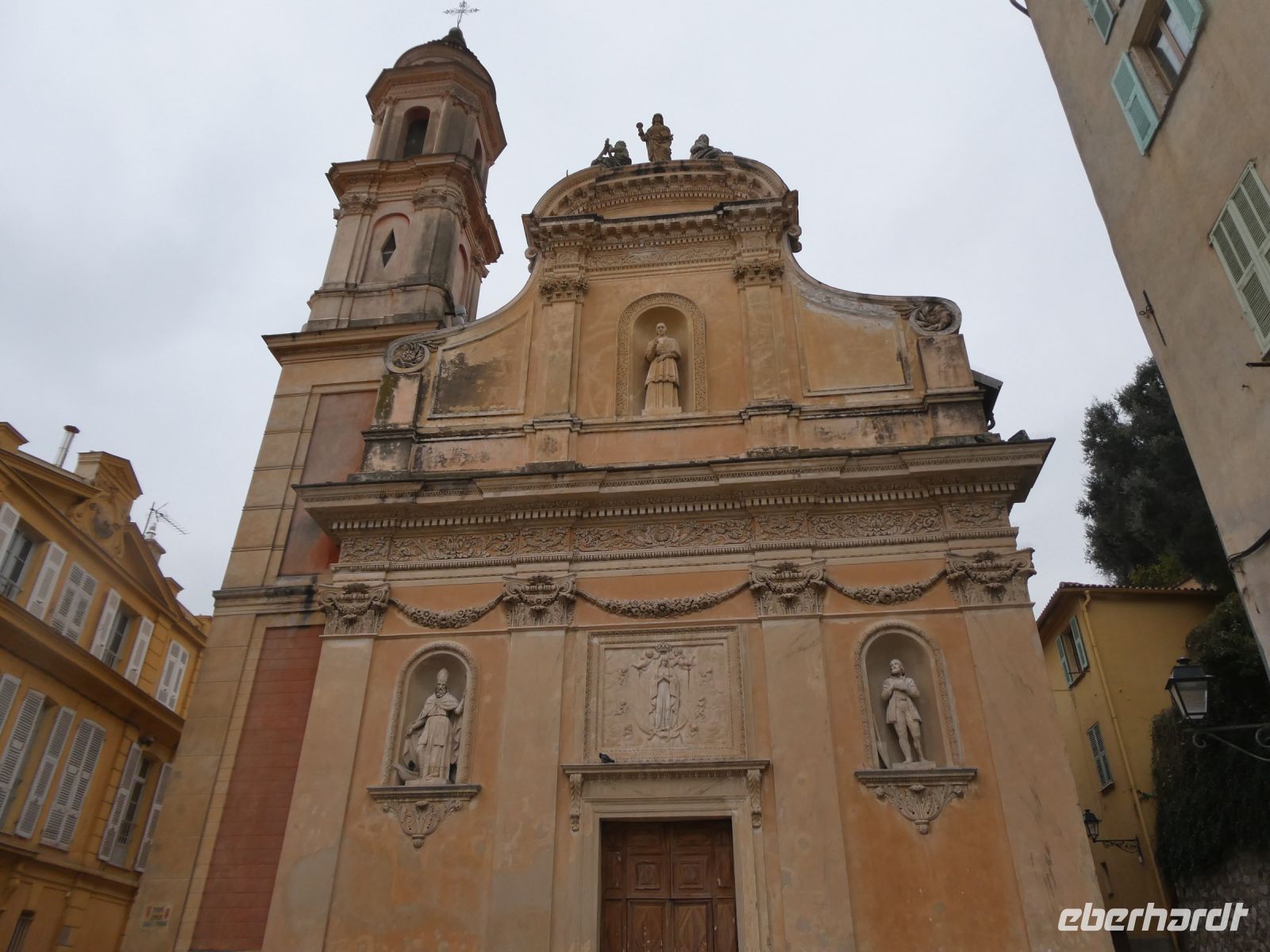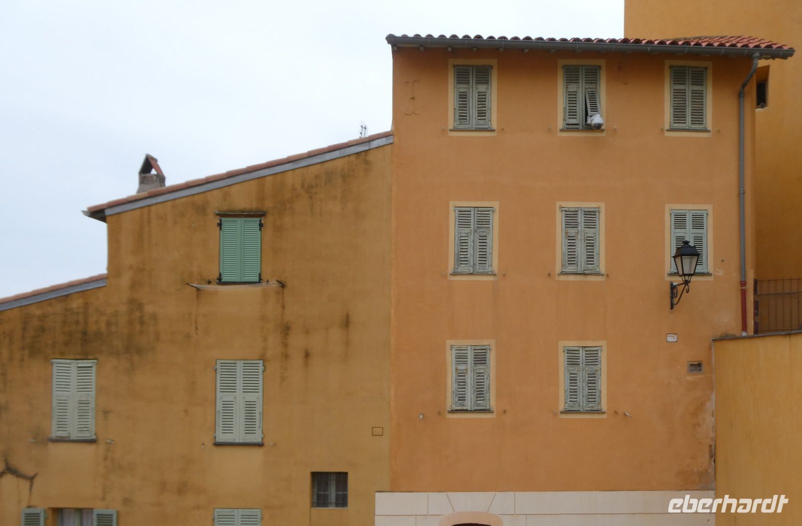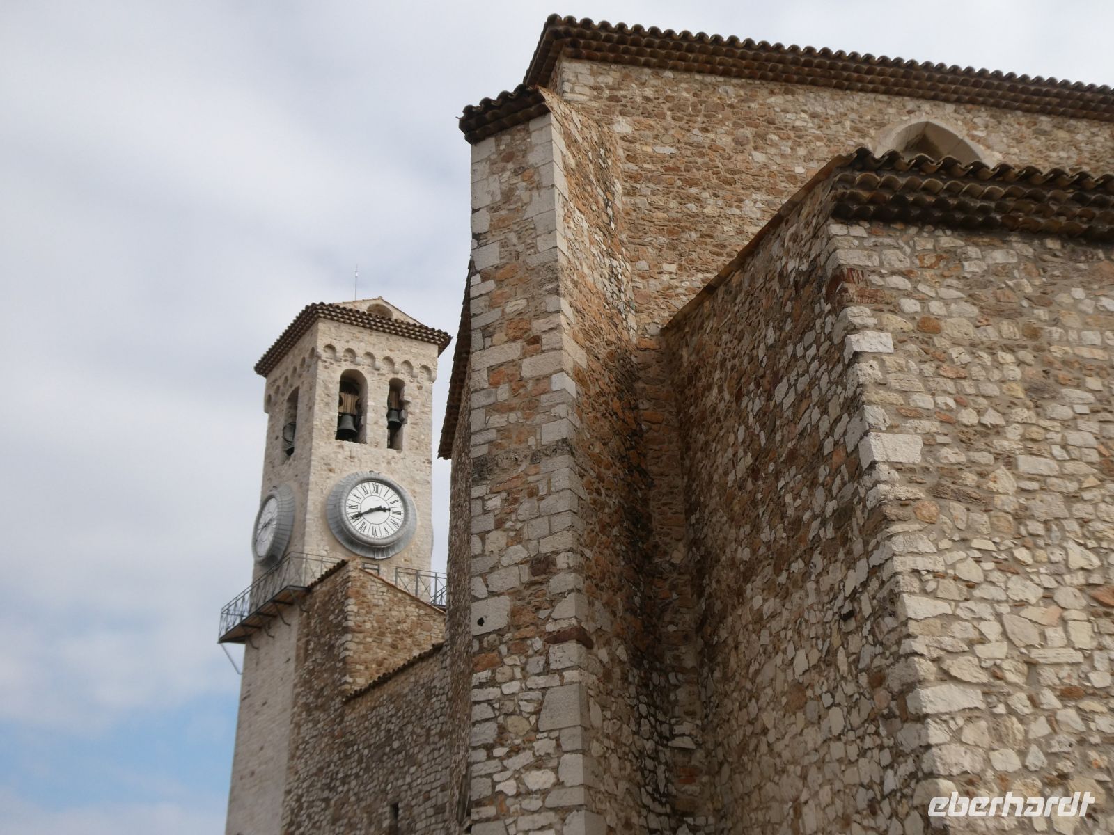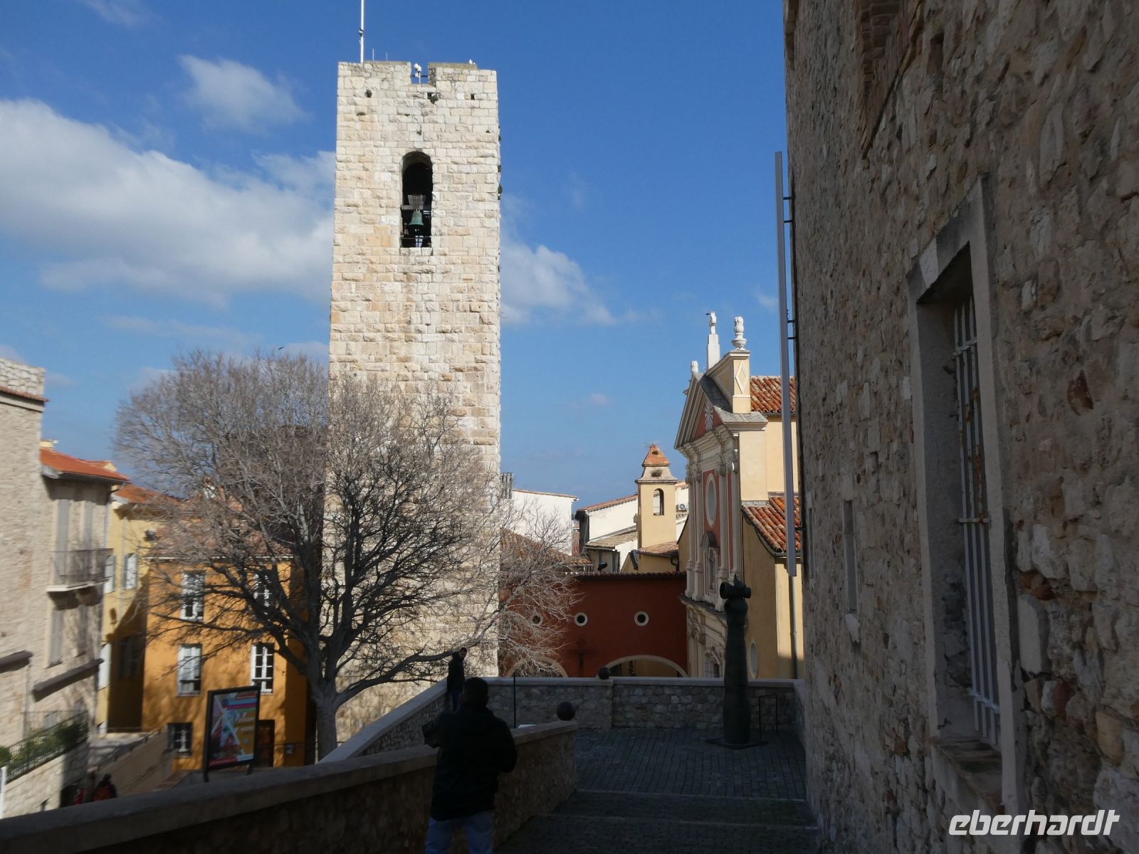 Dann kommen die Stadttore der Altstadt in Sicht. Wir durchschreiten eines der Tore und nach wenigen Minuten befinden wir uns schon am "Cours Masséna", benannt nach einem französischen Offizier der vor allem während der Revolutionskriege bewährte, vor dem überdachten Markt. Hier werden Produkte aus der Region verkauft und es ist schon einiges los. Hierher können wir später zurückkommen und einen kleinen Imbiss nehmen, z.B. die hier bekannte "Socca", ein gewürzter Teigfladen aus Kirchererbsenmehl der auf offenem Holzfeuer gebacken wird. Schnell geht es links eine Treppe hinauf und wir nähern uns der Kathedrale aus dem 16.Jahrhundert mit ihrem älteren Glockenturm. Nach einem kurzen Besuch der Kathedrale die sich direkt vor dem "Chateau Grimaldi" befindet, welches heute das Picasso-Museum beherbergt.