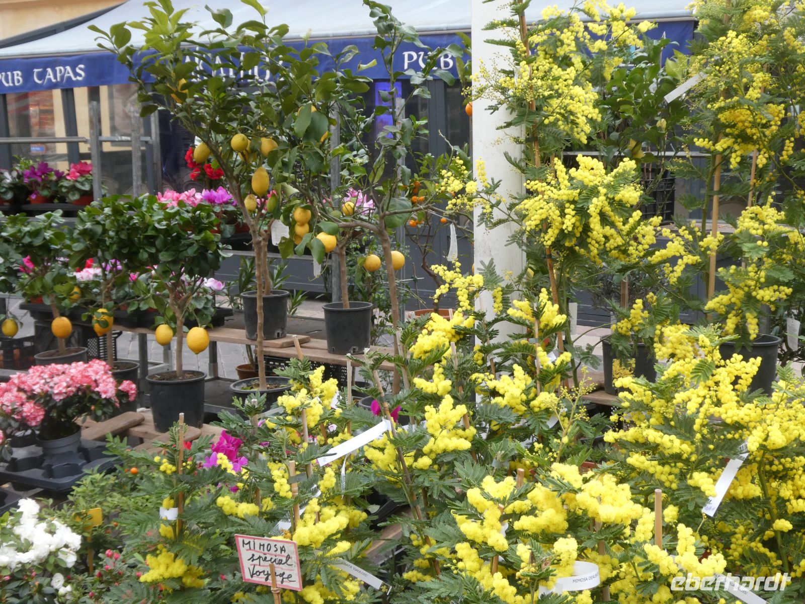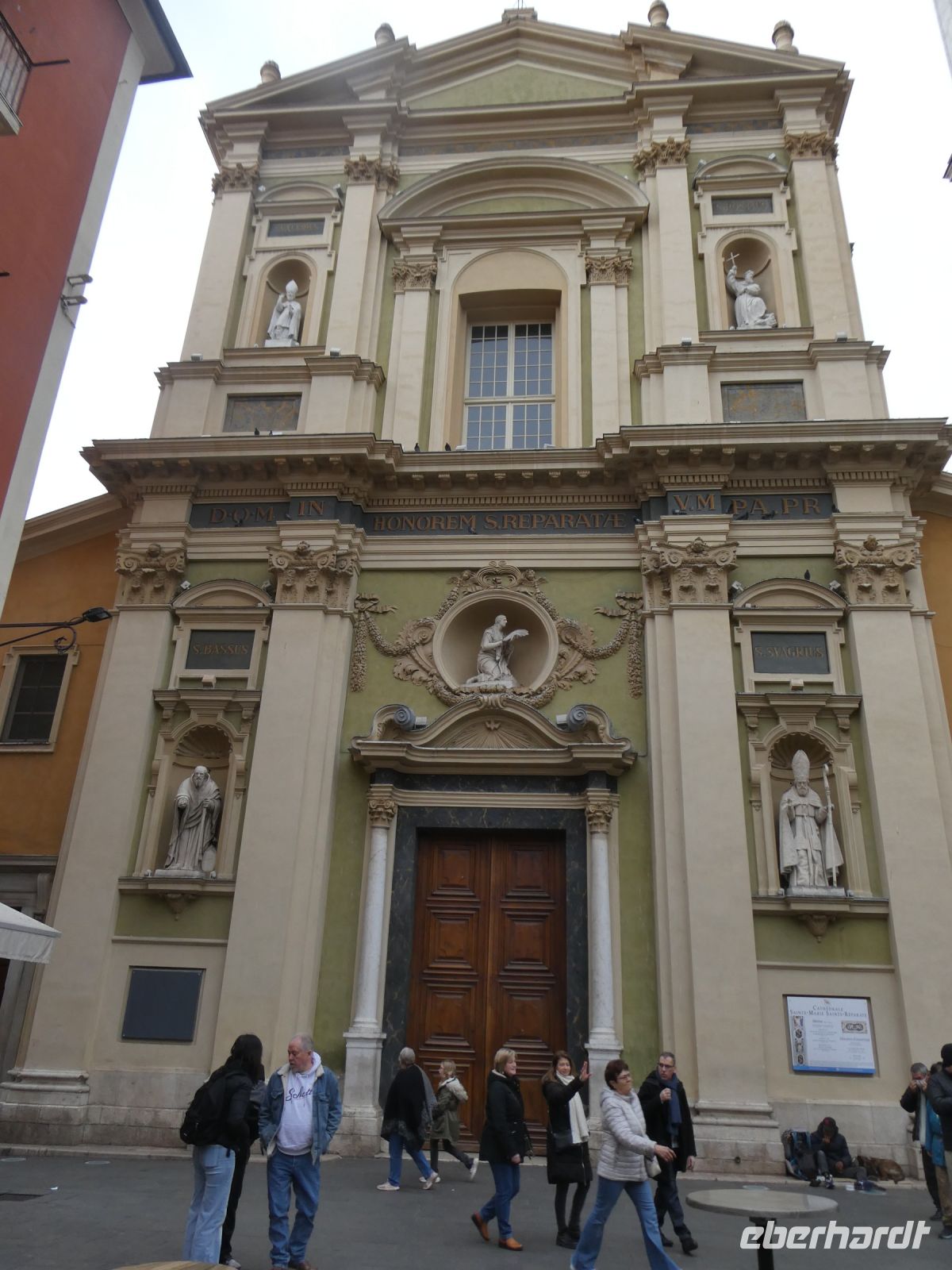 Wir bekommen von Karin eine Erläuterung der besonderen Spezialitäten die hier käuflich zu erwerben sind und kommen bald am Blumenmarkt, auf dem zu dieser Jahreszeit Sehr viele Mimosen angeboten werden, an. Der Duft der Blumen erfüllt die Luft. Nach dem angrenzenden Lebensmittelmarkt biegen wir in die engen Gassen der Altstadt ab. Wir schlendern am Justizpalast vorbei, bewundern die Skulptur eines Olivenbaumes und spazieren bis zur Kathedrale Sainte-Réparate, eine Barockkirche die aber geschlossen ist.