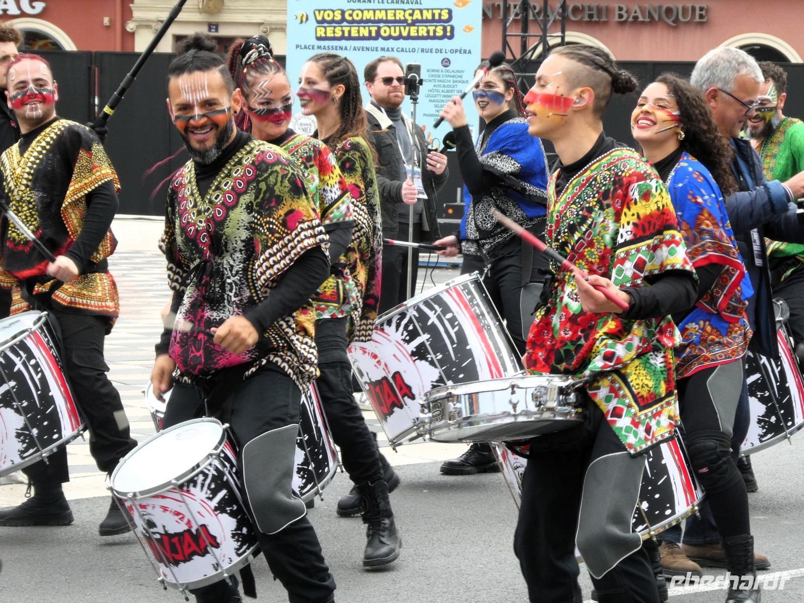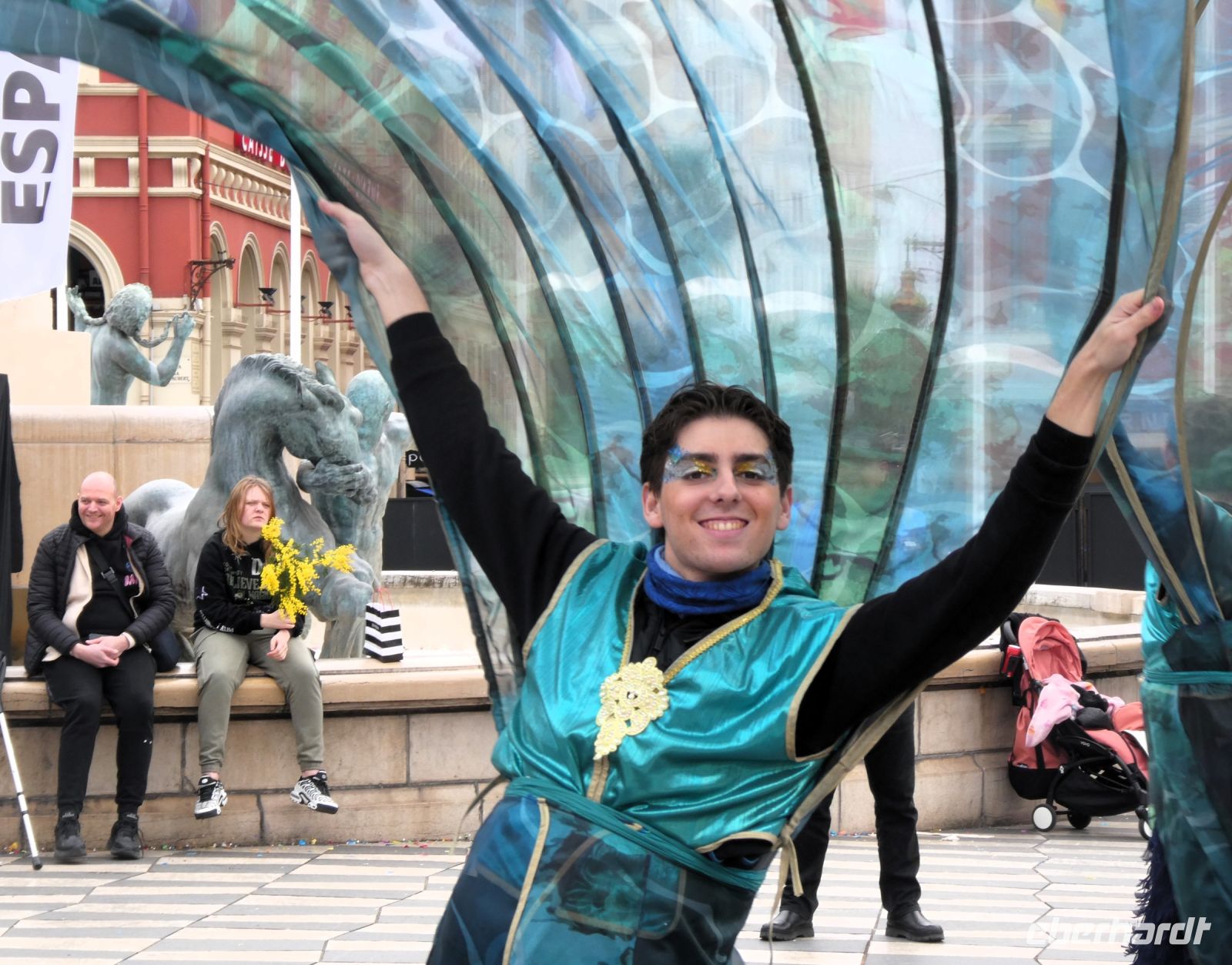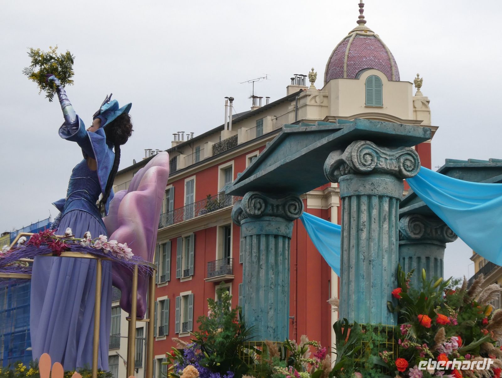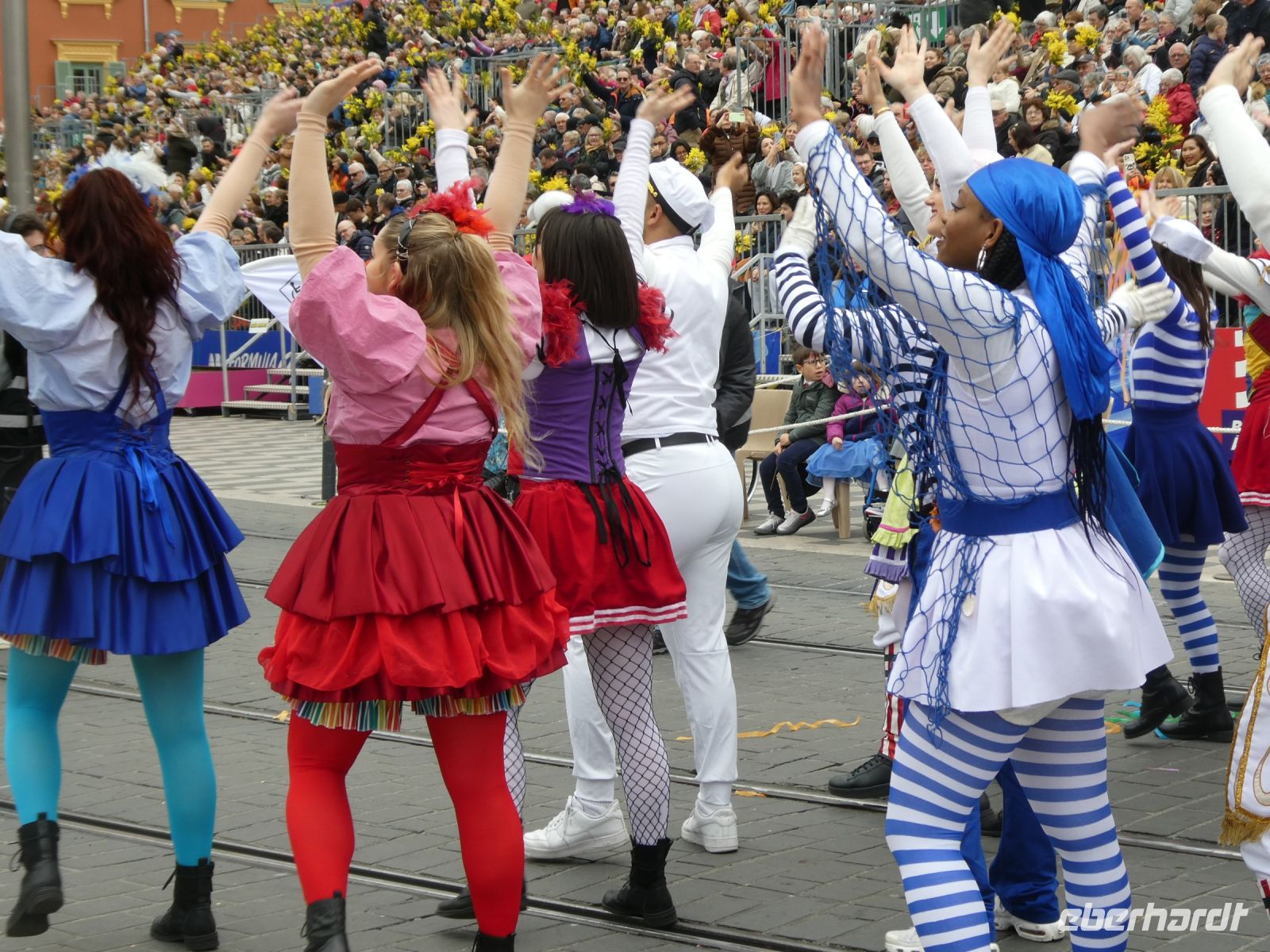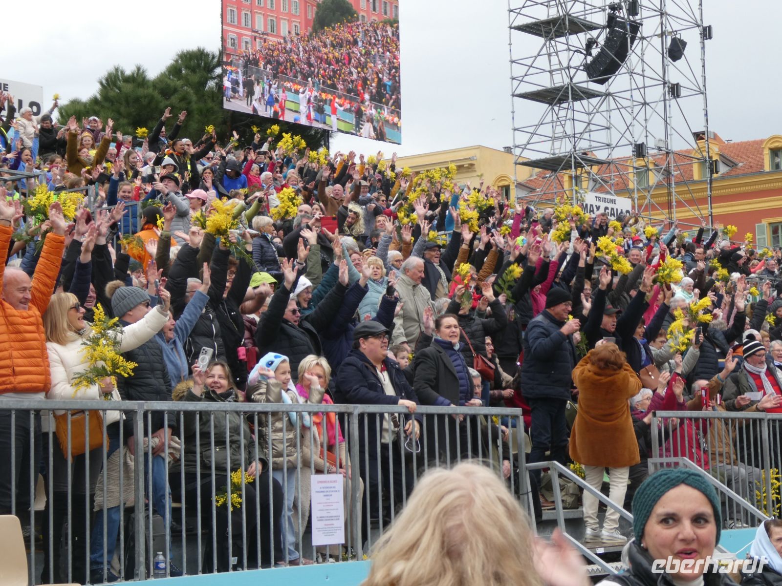 Danach heißt es rechtzeitig die Plätze einzunehmen und nach einer Wartezeit beginnt das Karnevalsspektakel welches mit der Einstimmung der Zuschauer in der französischen Variante beginnt. Ein sog. Conferencier heizt die Menge an. In der Mitte tanzen verschieden bunt bekleidete junge Tänzer nach einschlägigen Rhythmen. Alle machen mit und schwingen ihre zu diesem Zweck verteilten Mimosen Zweige. Dann beginnt der Umzug mit Vielfalt und Buntheit, es schweben Riesen-Libellen an uns vorbei oder eine Trommelgruppe gibt ihr Bestes. Zwei mal tourt der Umzug über den Platz. Jeder bleibt solange er möchte und wir treffen uns erst wieder im Hotel oder am nächsten Morgen.