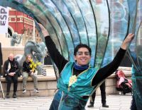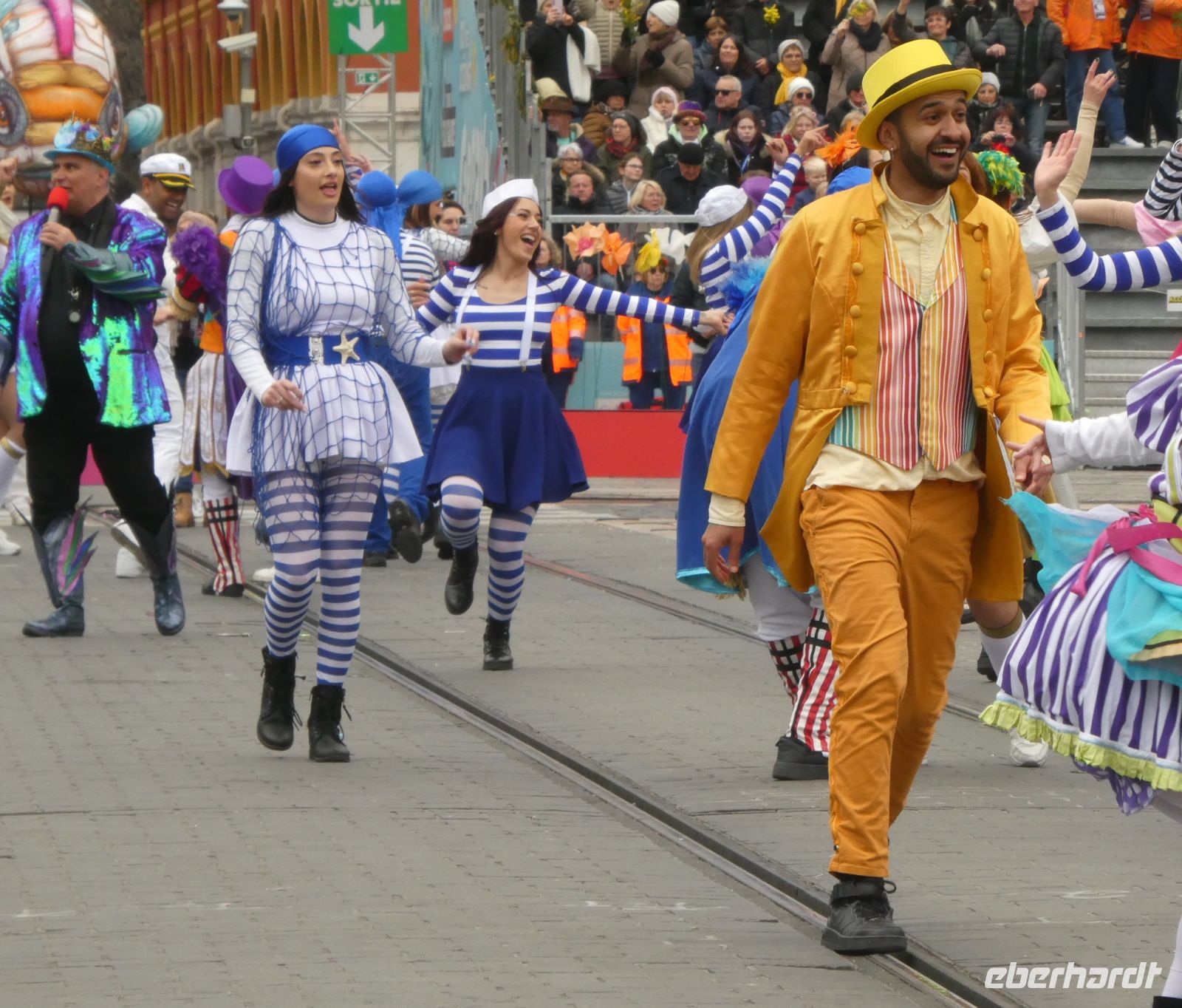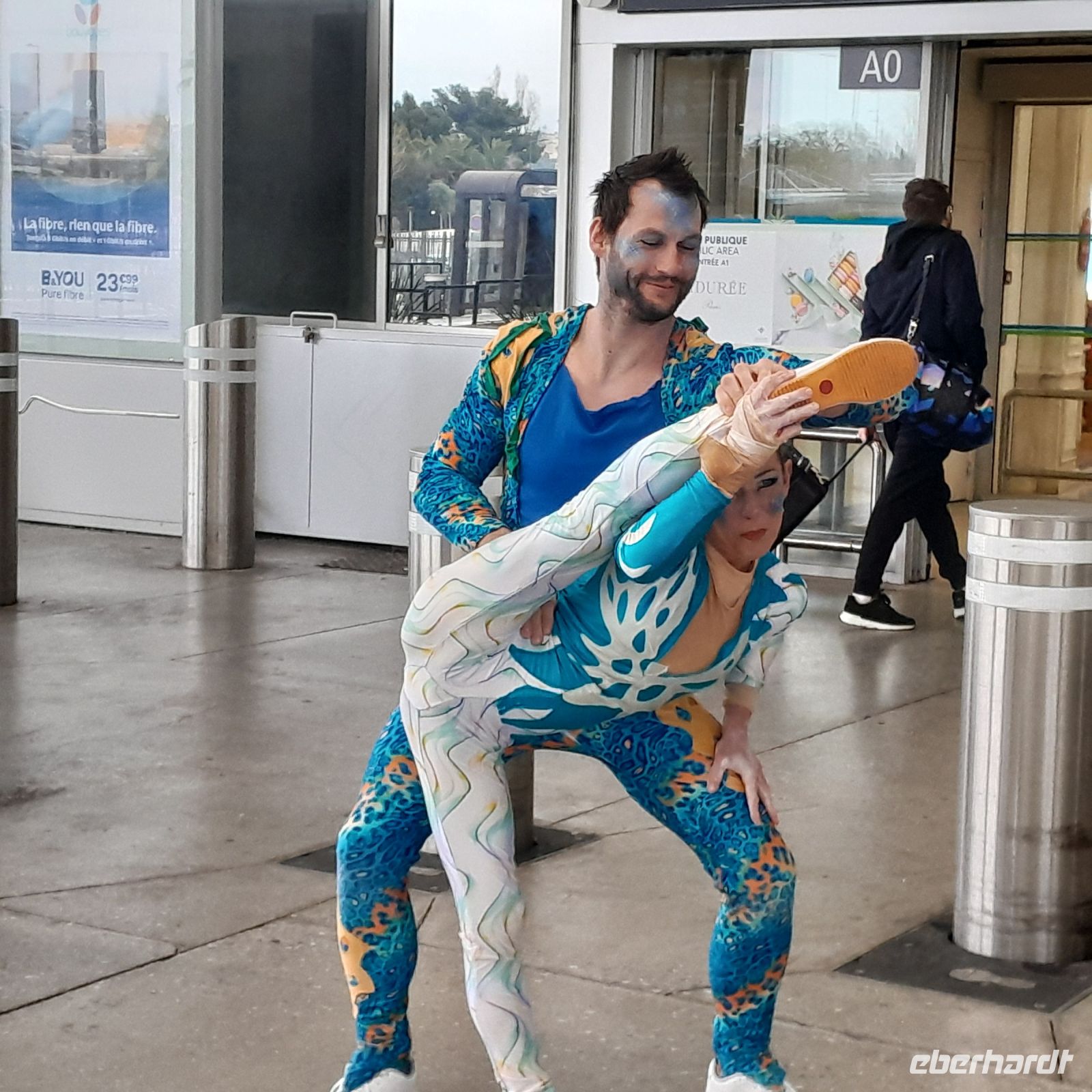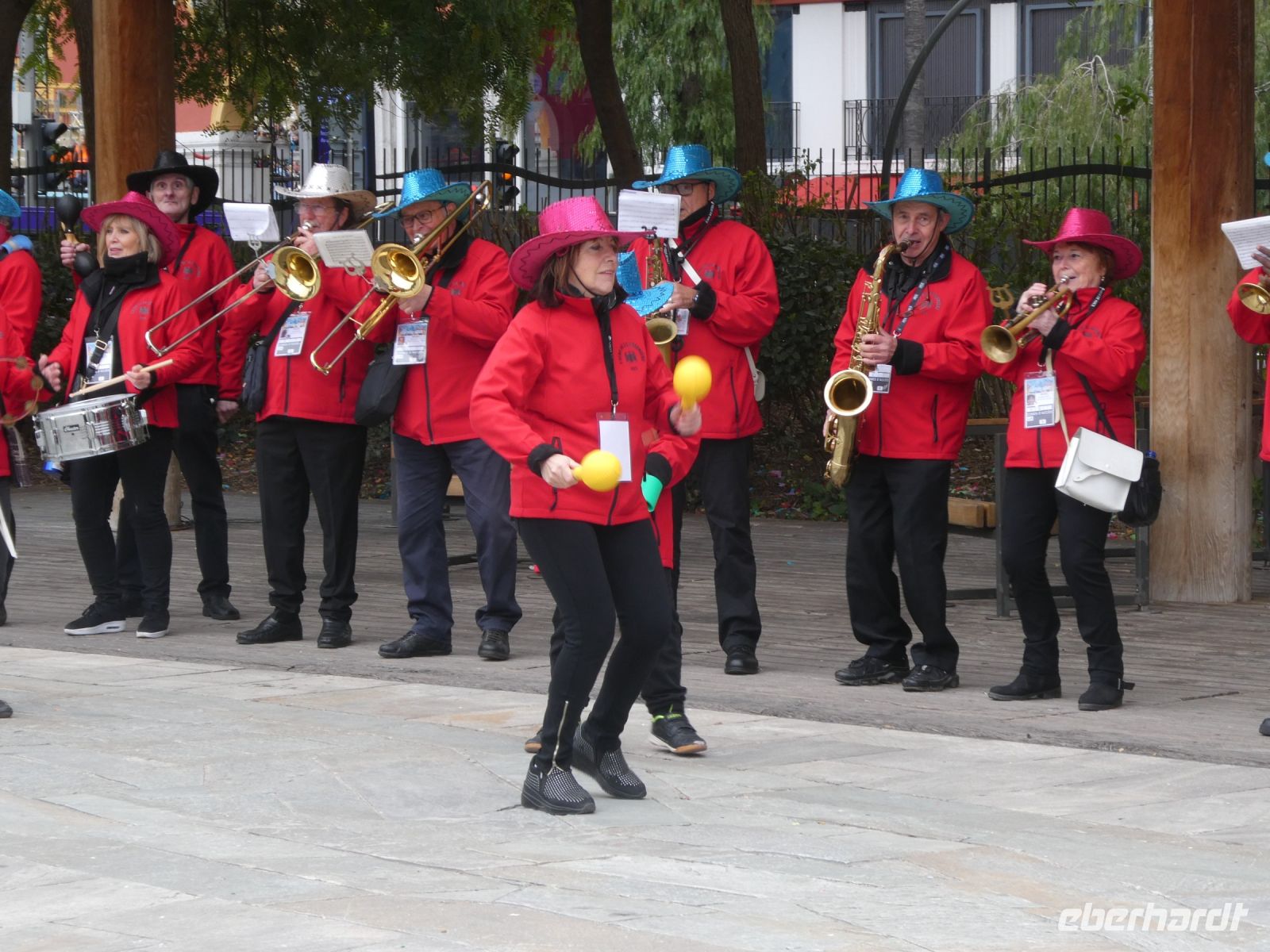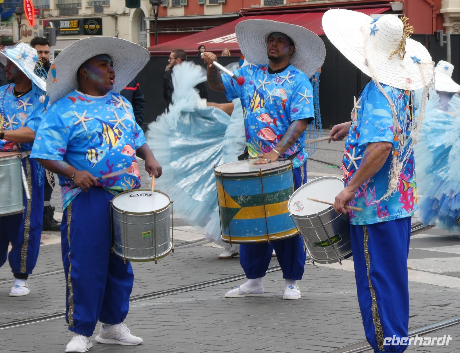 Danach heißt es rechtzeitig die Plätze einzunehmen und nach einer Wartezeit beginnt das Karnevalsspektakel welches mit der Einstimmung der Zuschauer in der französischen Variante beginnt. Ein sog. Conferencier heizt die Menge an. In der Mitte tanzen verschieden bunt bekleidete junge Tänzer nach einschlägigen Rhythmen. Alle machen mit und schwingen ihre zu diesem Zweck verteilten Mimosen Zweige. Dann beginnt der Umzug mit Vielfalt und Buntheit, es schweben Riesen-Libellen an uns vorbei oder eine Trommelgruppe gibt ihr Bestes. Zwei mal tourt der Umzug über den Platz. Jeder bleibt solange er möchte und wir treffen uns erst wieder im Hotel oder am nächsten Morgen.