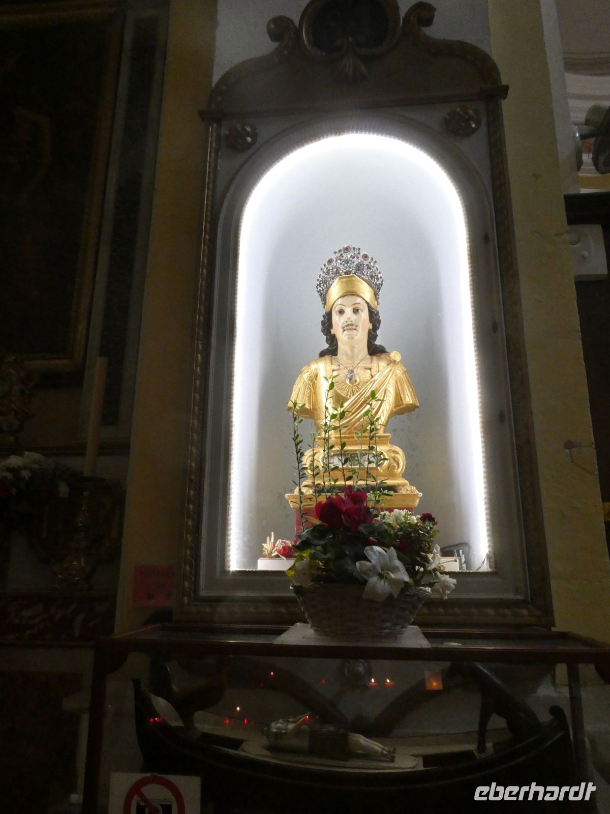 Gina zeigt uns den Treffpunkt für unsere Schiffsfahrt am Nachmittag und dann spazieren wir weiter in Richtung der "Église Notre Dame de l'Assomption" deren Glockenturm weithin sichtbar ist. Hier in der Kirche befindet sich neben anderen heiligen Skulpturen und Statuen eine Büste des Heiligen Torpes, welcher der Namensgeber der Stadt ist. Er soll während der Regentschaft des Kaiser Nero von den Römern geköpft und hier durch ein Wunder an Land gespült worden sein. Das Boot mit der Puppe ohne Kopf unter der Büste weist darauf hin.