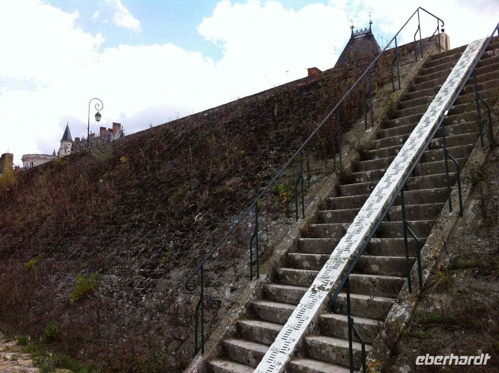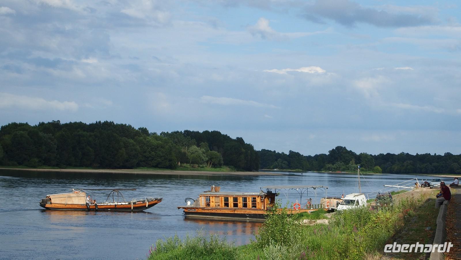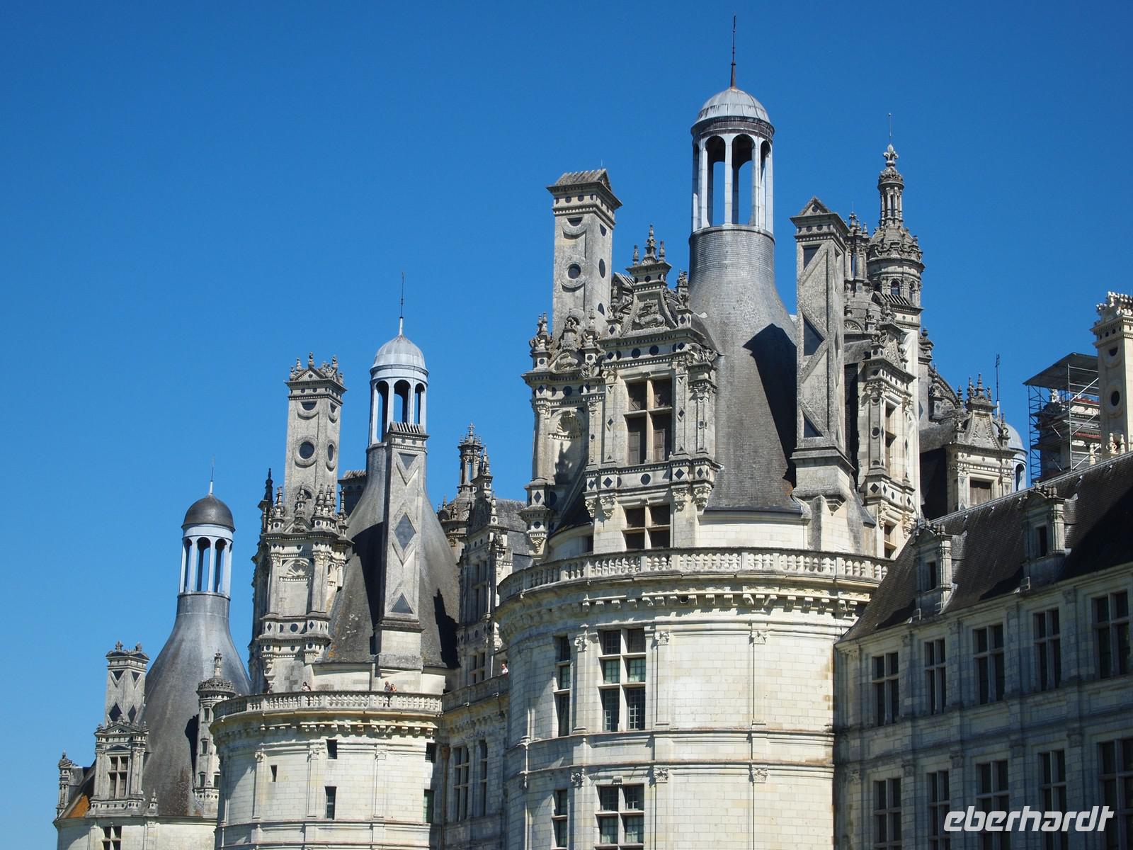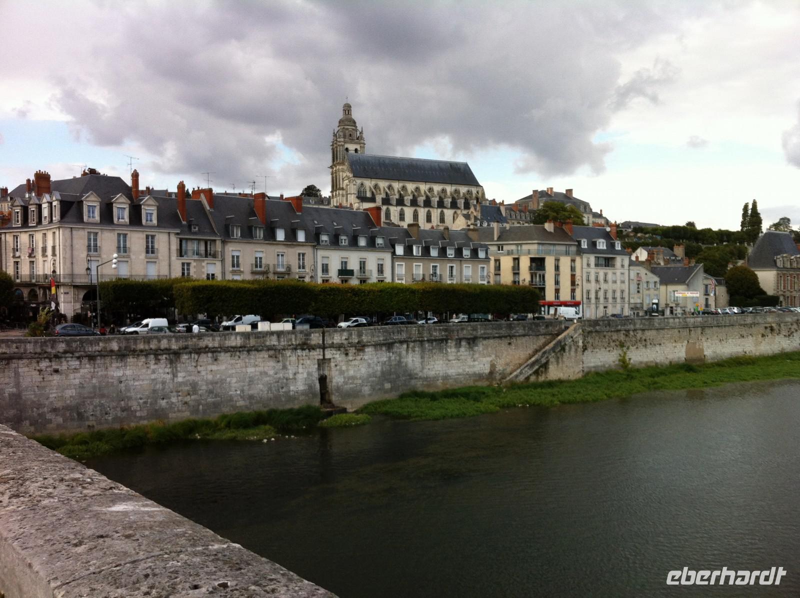 Schon von weitem sehen wir den klotzigen Donjon des alten Städtchens über der Loire aufragen. Von der Terrasse im Südwesten der teilweise noch von einer Stadtmauer umgebenen Kleinstadt mit Weltkulturebestatus haben wir einen schönen Blick auf die 440 Meter lange mittelalterliche Brücke und auf die vielen kleinen Sandbänke und Inseln an dieser sehr breiten Stelle. Der Radweg verläuft unmittelbar entlang der Loire, meist auf einem Damm. Auf Höhe des Dorfes Avaray begegnen wir dem ersten Kraftwerk: das Loire-Wasser wird an einigen Stellen zur Kühlung verwendet. Bei Muides-sûr-Loire wechseln wir die Seite und radeln bis St.Dyé-sûr-Loire durch ein sehr französisch anmutendes Wohngebiet. Nach der Mittagspause auf dem Kirchplatz kommen wir nach flotten sechs Kilometern in Richtung Süden im Jagdrevier von Schloss Chambord an. Genau in der Mittelachse der modular aufgebauten Anlage, die Franz I. an der Stelle eines unbedeutenden Jagdsitzes errichten ließ, fahren wir auf die imposante Schauseite mit den unzähligen pittoresken Kaminen zu. Bei der Besichtigung ist die berühmte Doppelhelix-Treppe -sie geht sehr wahrscheinlich auf einem Entwurf von Leonardo da Vinci zurück- von besonderem Interesse. Nach weiteren 20 Radkilometern eröffnet sich uns ein grandioser Blick auf weiße Häuser mit grauen Schieferdächern und roten Schornsteinen, überragt vom prächtigen Schloss und der Kathedrale. Wir sind in Blois angekommen und genießen den Blick, während wir die Brücke überqueren. Bereits der Weg zum Busparkplatz ist ein Stadtspaziergang mit ersten Eindrücken von der lebendigen Stadt. In den alten Vierteln führen Treppchen durch verwinkelte Quartiere, sodass man sofort Lust bekommt, hinaufzusteigen, ganz egal, wo man herauskommen mag. Zahlreiche Bars und Brasserien locken, die Geschäfte sind geöffnet und das prachtvolle Schloss will von allen Seiten bestaunt werden: Der Flügel zum Platz auf dem künstlichen Hochplateau mit dem Stachelschwein-Emblem Ludwigs XII. über dem Hauptportal und der unter Franz I. erbaute imposante Flügel zur Gartenseite, ein Meisterwerk der Renaissancebaukunst mit zwei Logen- und einem Galeriegeschoss.