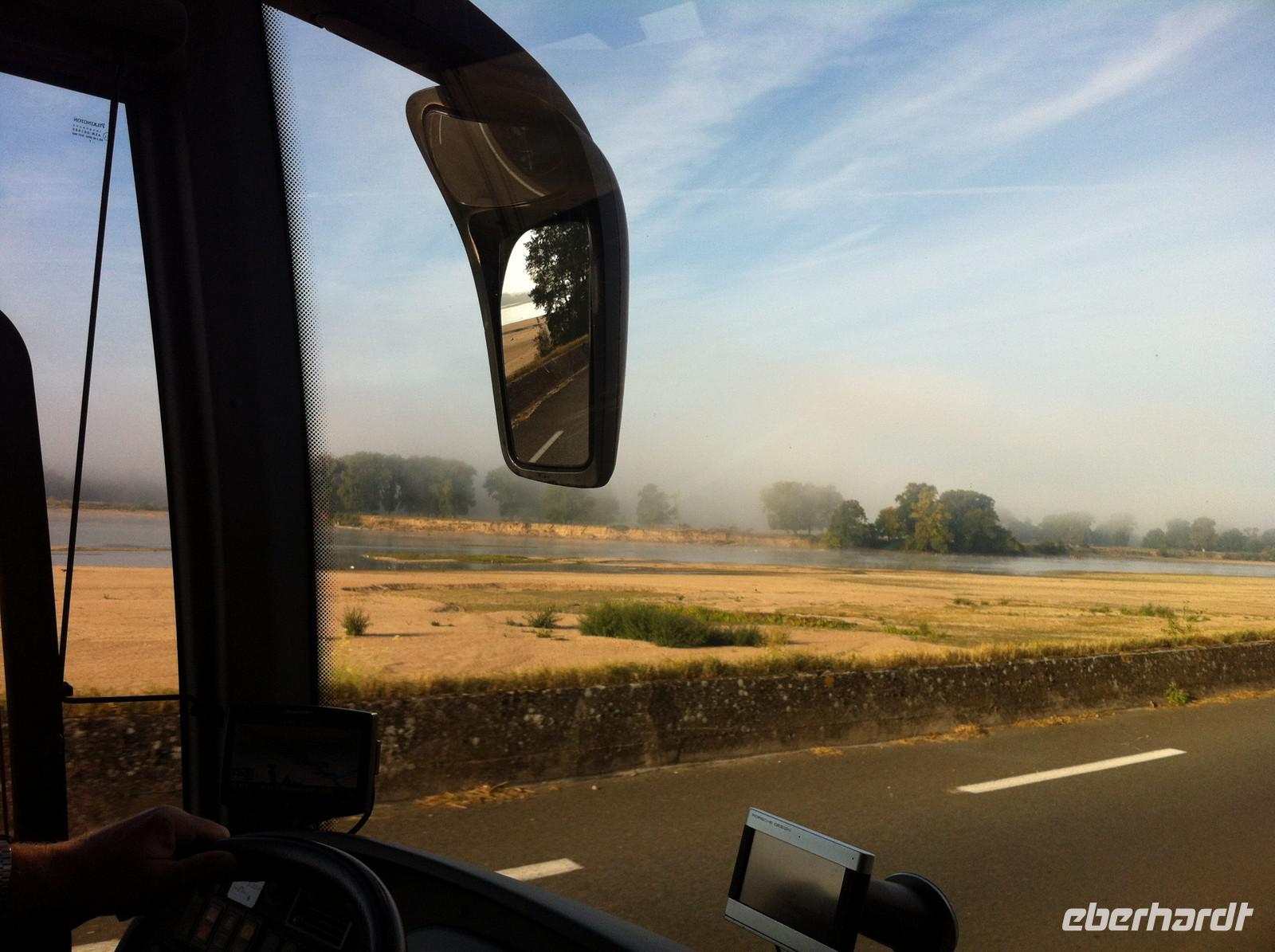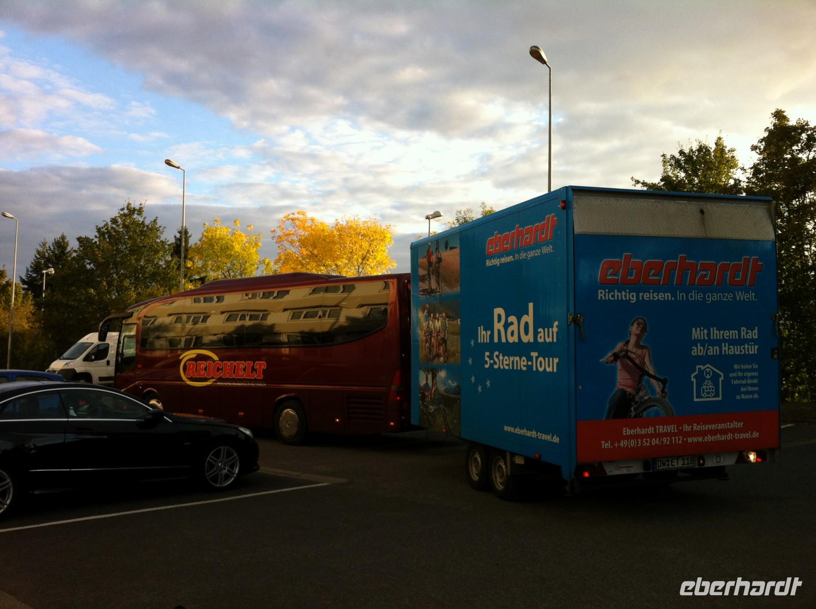 Die Fahrt beginnt morgens um sechs Uhr am Flughafen in Dresden. Es gilt 950 Kilometer zurückzulegen, was mit dem Fahrradanhänger natürlich nicht ganz so schnell zu bewältigen ist. Immerhin gibt es unterwegs viel zu sehen und es werden regelmäßige Pausen eingelegt. Beim letzten Stopp spendiert unser Busfahrer Ingo anlässlich seines heutigen Geburtstags eine Runde Sekt - und stößt mit Wasser an, denn er muss wieder ans Steuer!