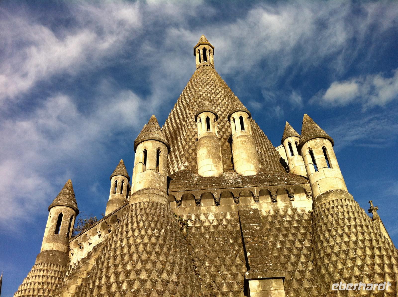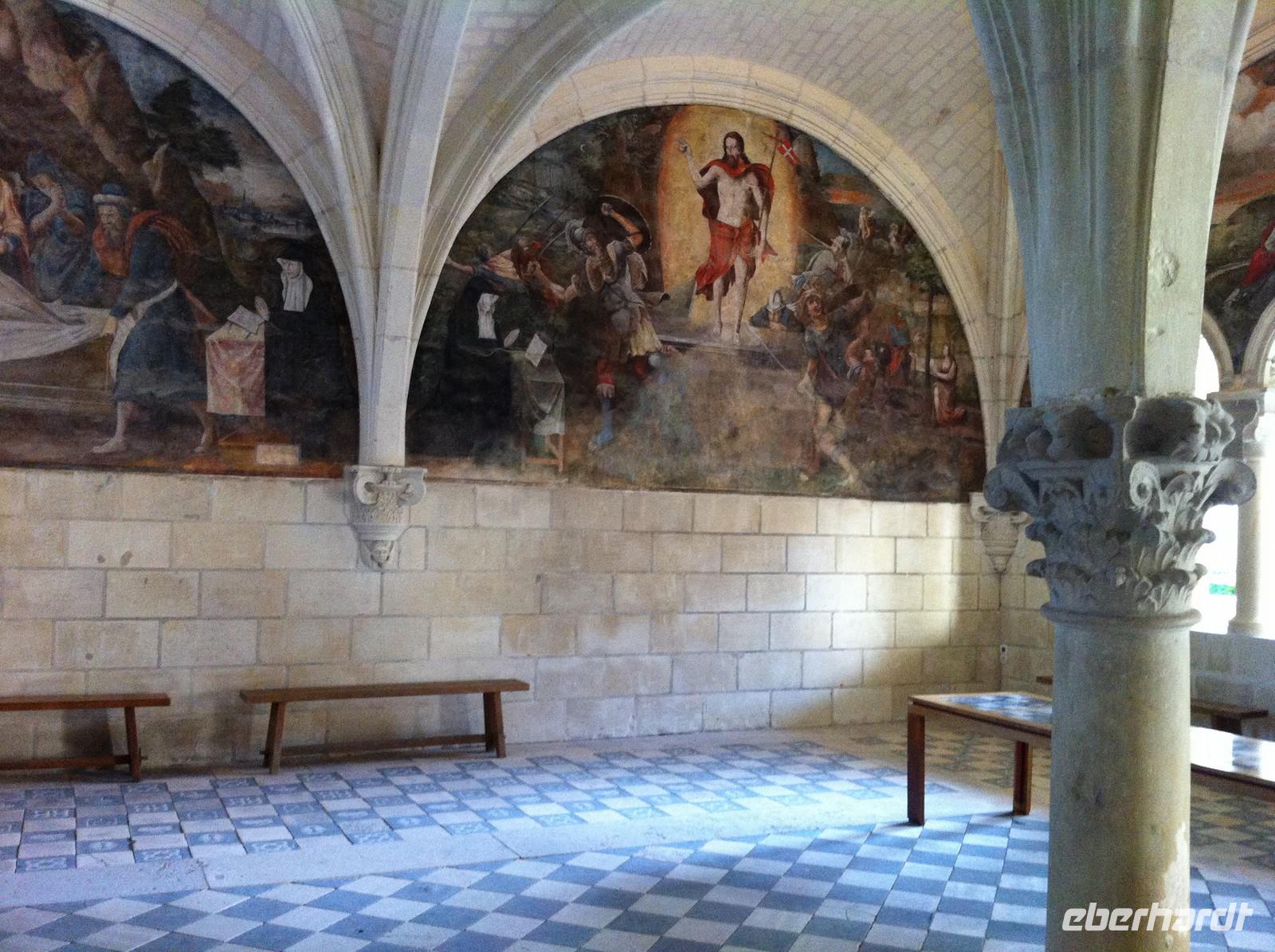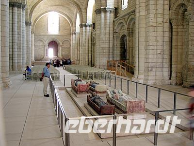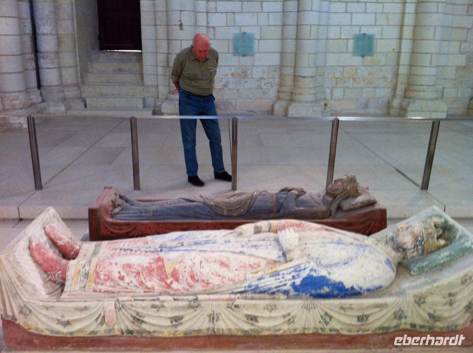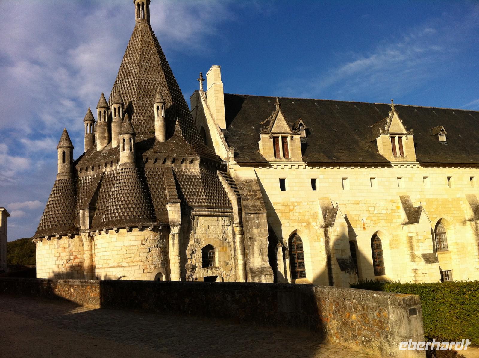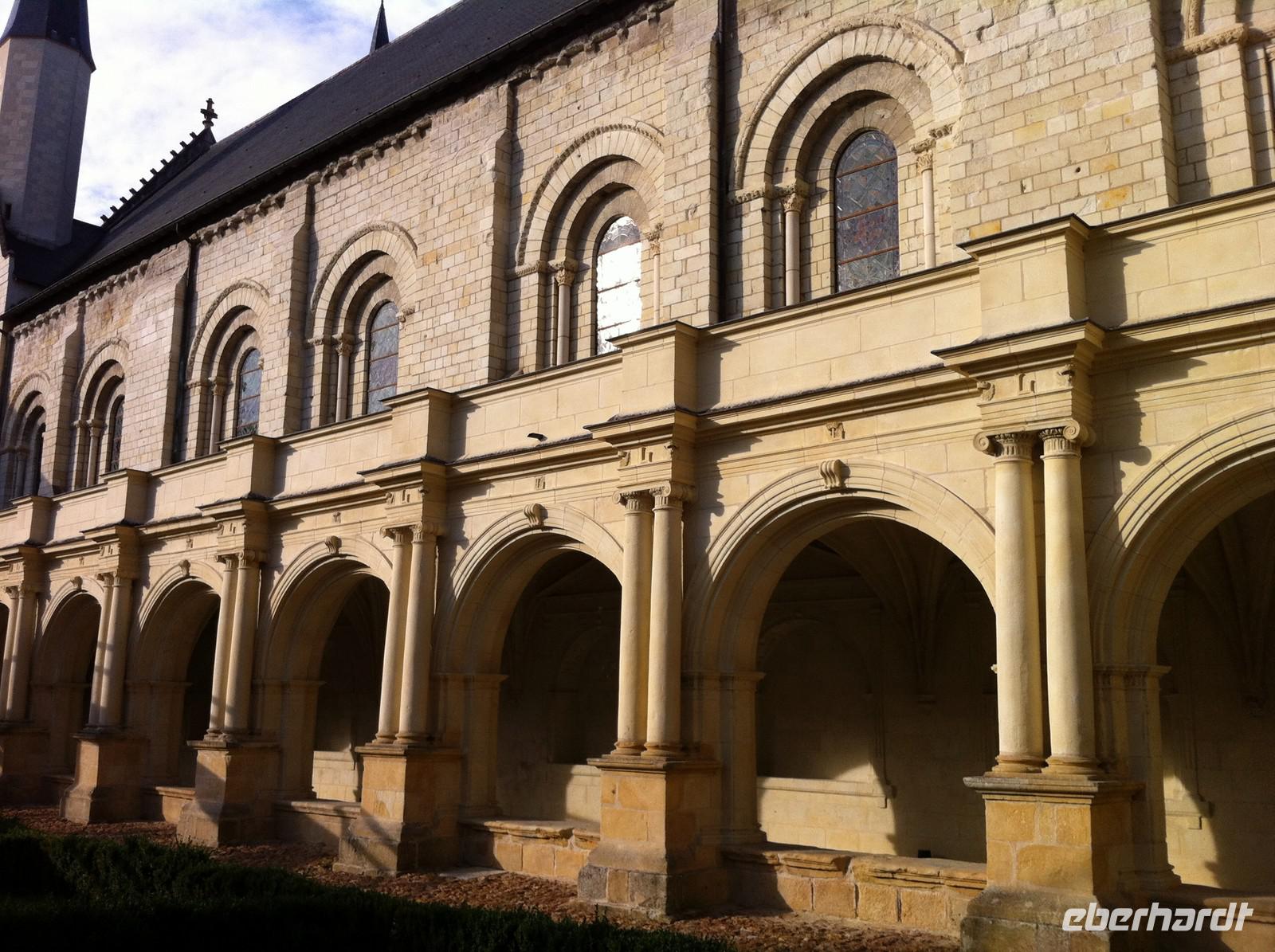 Mit dem Bus fahren wir zum westlichsten Punkt unserer Reise: Der kleine Ort Trèves ist Ausgangspunkt für unseren letzten Radfahrtag. Es gibt zwei Möglichkeiten nach Saumur zu gelangen: Entweder auf Loire-Niveau entlang des Flusses oder auf dem Hochplateau durch Wiesen und Felder. Keine Frage, wofür sich die sportliche Gruppe entscheidet! Der Weg verläuft zwar nur im Abstand von etwa einem Kilometer parallel zum Fluss, aber es gibt permanent Steigungen. Belohnt werden wir natürlich durch die schöne Landschaft und die Ausblicke! In Saumur, wegen der Häuser aus hellem Tuffstein auch „Perle des Anjou" genannt, nehmen wir uns Zeit für eine Mittagspause an der Place de Bilange vor dem klassizistischen Theater oder an der Place St. Pierre vor der gleichnamigen Kirche, welcher von schönen Fachwerkhäusern gerahmt ist. Der berühmte Schaumwein der Region ist sehr zu empfehlen und ein Glas zum Essen verträgt sich noch mit der weiteren sportlichen Aktivität: Zum Schloss Saumur geht es enge Serpentinenwege steil bergauf. Eine trutzige Ritterburg, flankiert von vier Ecktürmen und umgeben von einem schützenden tiefen Graben empfängt uns. Leider haben wir keine Zeit zur Besichtigung, aber wir genießen den phantastischen Blick ins Loiretal. Der Weg geht mit leichten, aber zahlreichen Steigungen weiter durch die Weinberge und an mehreren Tuffsteinhöhlen vorbei. Die Hälfte der französischen Champignonzucht wird in diesen Höhlen produziert. Einige von ihnen sind zu Felsenwohnungen oder Werkstätten ergänzt und ausgebaut. In Montsoreau machen wir eine kleine Rast am Ufer der Loire mit Blick auf das Schloss, welches durch den Roman "Die Dame von Montsoreau" von Alexandre Dumas bekannt wurde. Nun kommt schon die letzte Etappe dieser Radreise! Bereits vom Radweg sehen wir die Dächer der mittelalterlichen Klosteranlage, die zu den größten Europas zählt: Die Abtei von Fontevraud, erbaut aus dem ortstypischen Materialien weißer Tuffstein und graublauer Schiefer. Anfang des 12.Jh. wurde sie von dem charismatischen Wanderprediger Robert d'Arbrissel gegründet. Die Leitung der sich aus Mönchen und Nonnen zusammensetzenden Ordensgemeinschaft übertrug der Priester gleich zu Beginn einer Frau. Sechsunddreißig Äbtissinnen, manche sogar von königlichem Geblüt, lösten sich bis 1792 an der Spitze des Ordens ab. Wir schaffen es noch rechtzeitig zur Besichtigung: Ein schöner Abschluss des Tages!