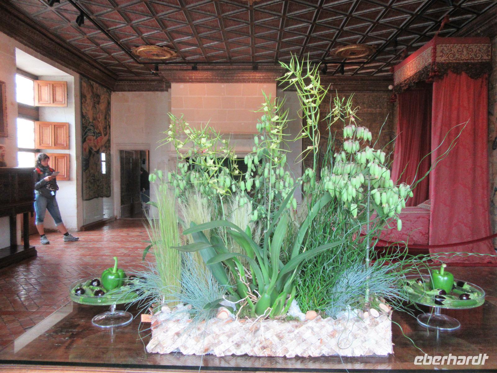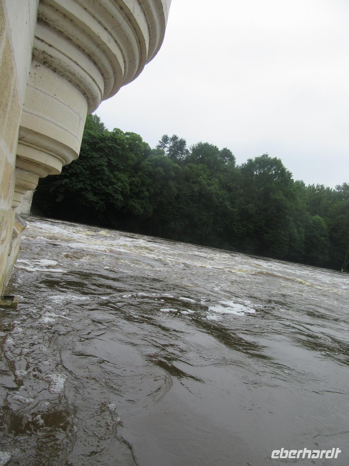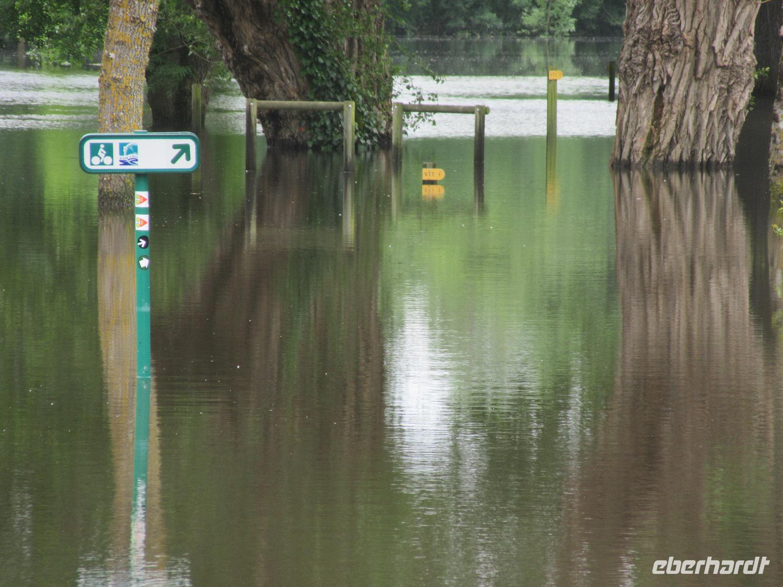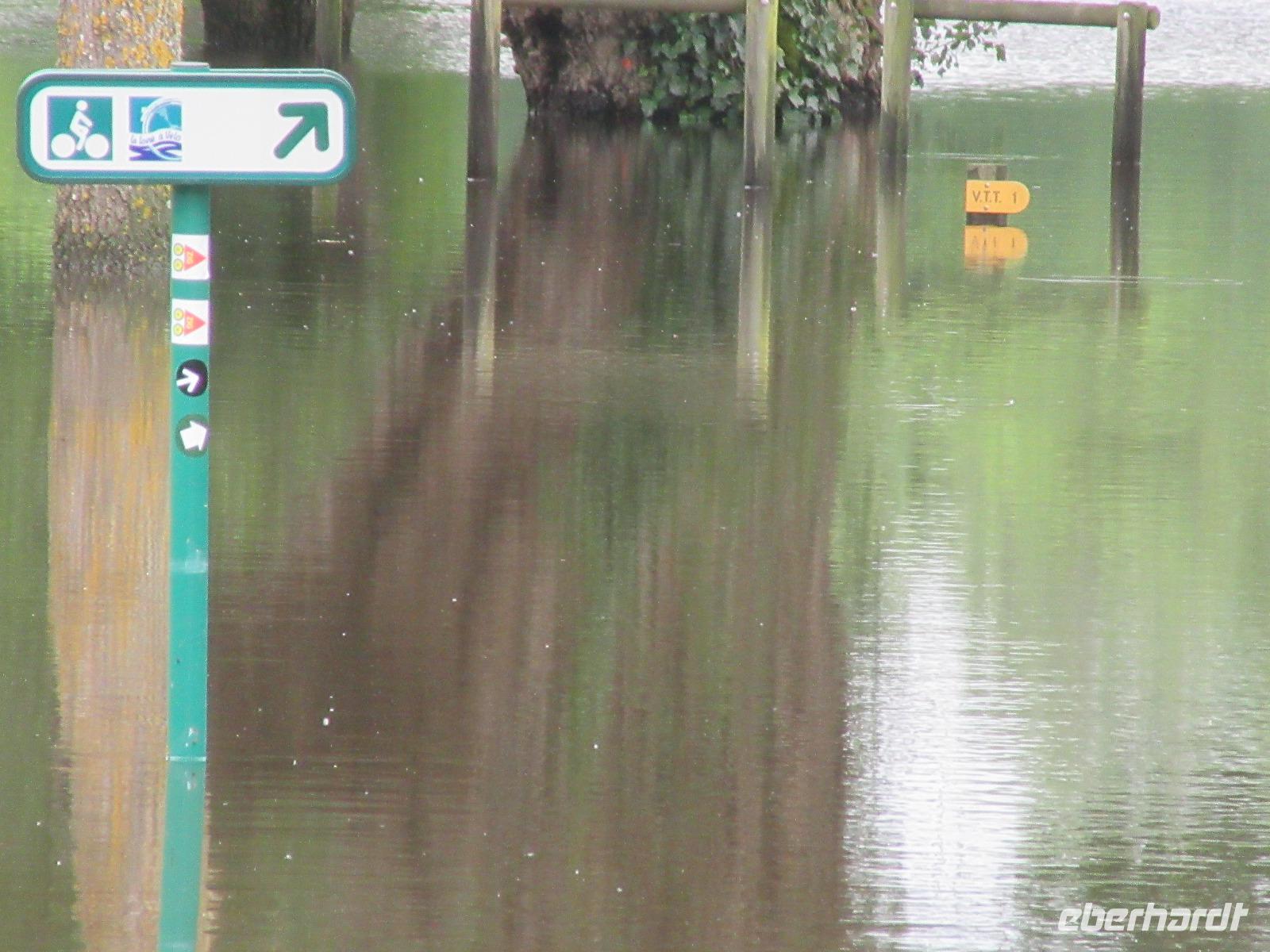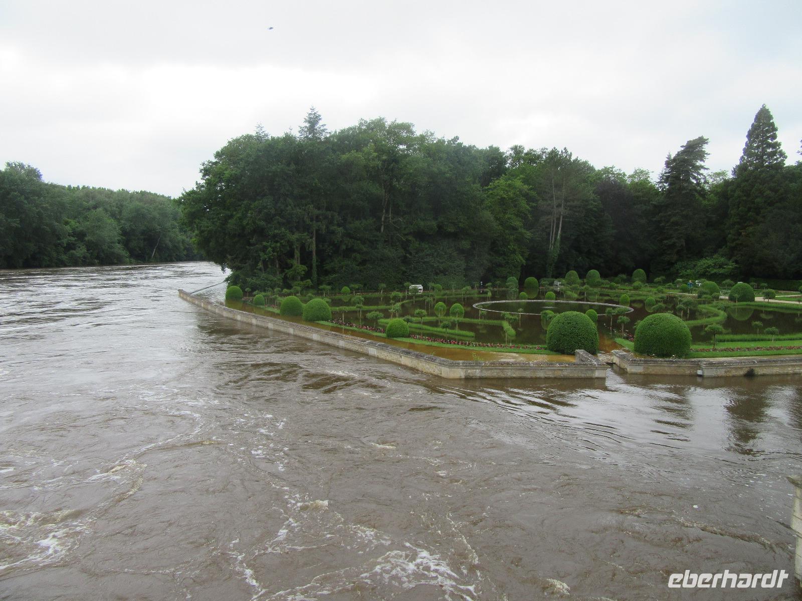 Das Schloss selber trotzte den Wassermassen und stand nun noch spektakulärer im Fluss als ich es gewohnt war. In fast jedem Raum stand wie immer ein sehr schöner Strauß mit Blumen. Dieses Jahr allerdings, steckten in relativ vielen Sträuchern auch Gemüsesorten oder das Gesteck ist gleich ganz mit Gemüse bestückt. Am Ausgang des Parks, wartete eine Überraschung für unsere Radler. Wir hatten heute im Supermarkt allerlei Sachen für ein schönes Picknick eingekauft und so war der Tisch fürstlich gedeckt. Es gab hier unterschiedlichste Sorten von Käse, feine Salami Sorten, Baguette und natürlich Wein. Nachdem wir uns alle gestärkt hatten, wollten wir noch das Schloss Montpoupon besichtigen. Dazu mussten wir aber den Cher überqueren und dies stellte sich relativ schwierig dar. Nachdem wir an der vierten gesperrten Brücke vorbei gefahren waren, entschlossen wir uns, zurück ins Hotel zu fahren.