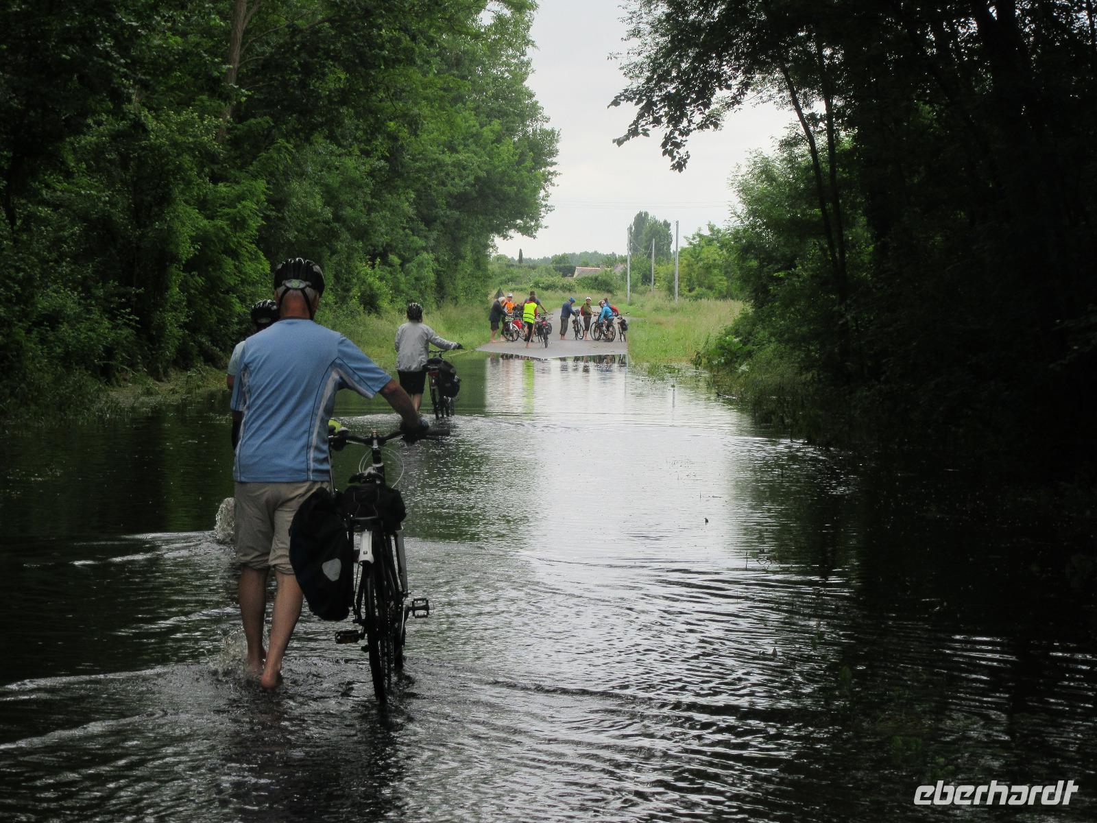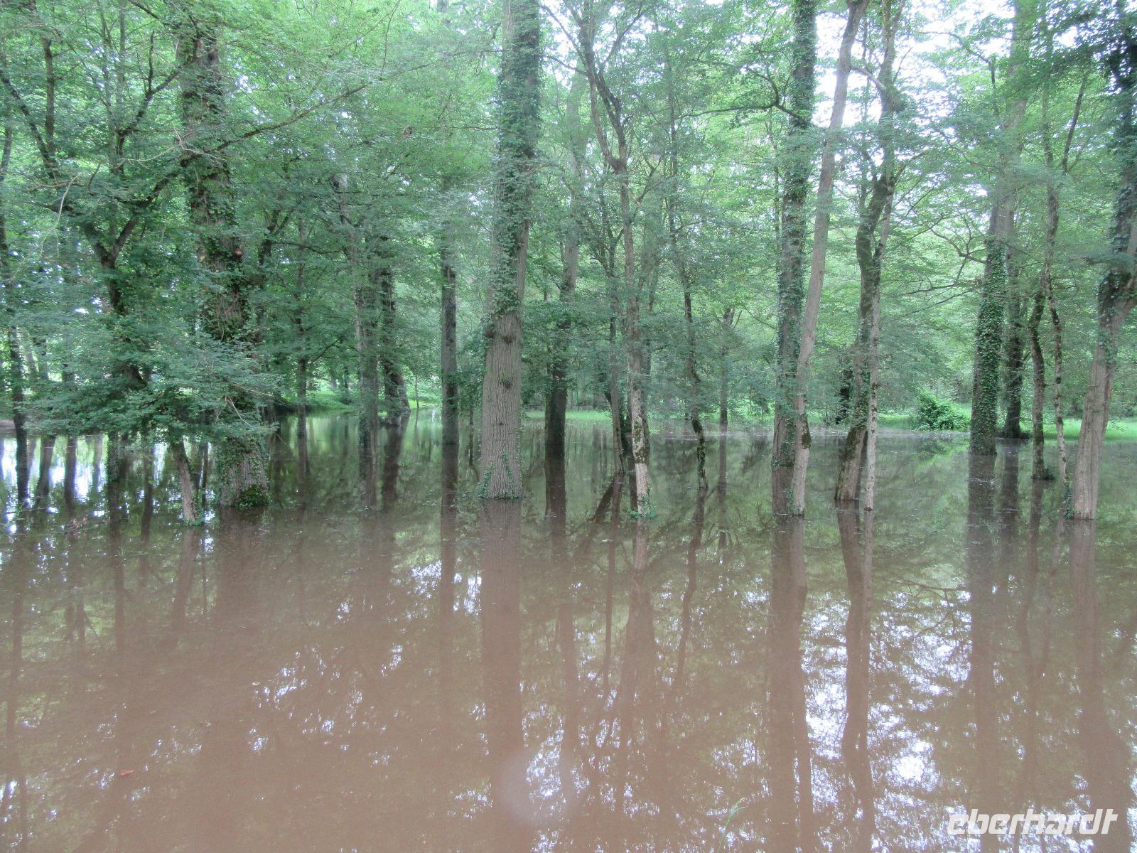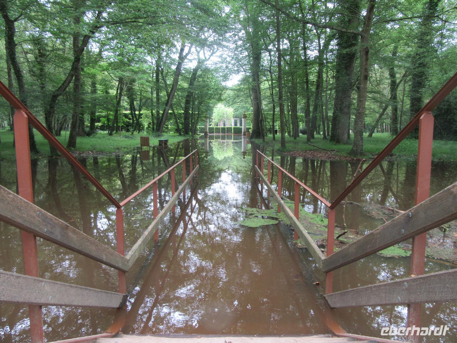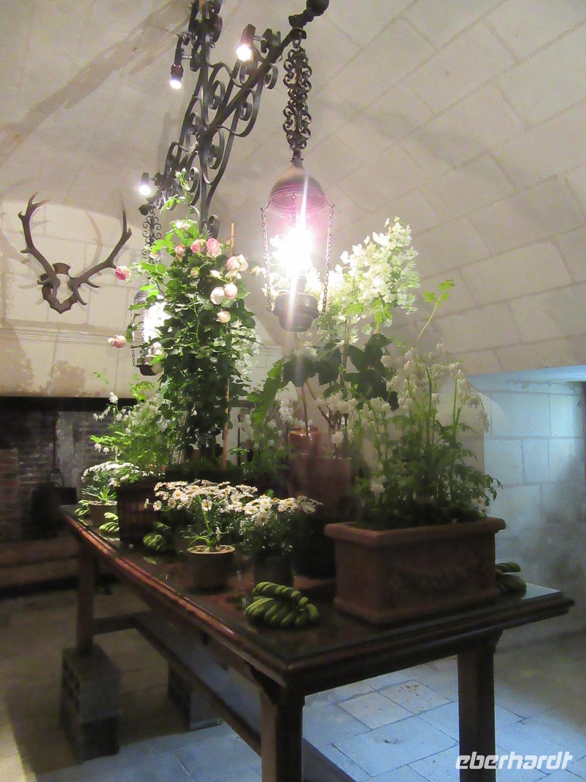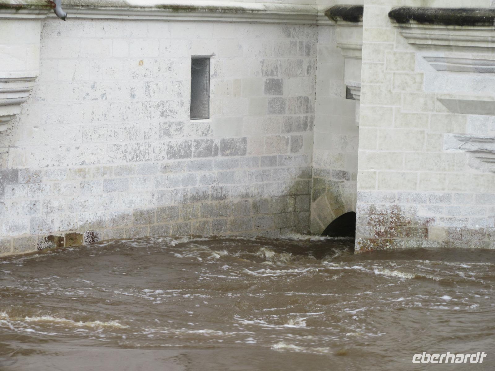 Das Schloss selber trotzte den Wassermassen und stand nun noch spektakulärer im Fluss als ich es gewohnt war. In fast jedem Raum stand wie immer ein sehr schöner Strauß mit Blumen. Dieses Jahr allerdings, steckten in relativ vielen Sträuchern auch Gemüsesorten oder das Gesteck ist gleich ganz mit Gemüse bestückt. Am Ausgang des Parks, wartete eine Überraschung für unsere Radler. Wir hatten heute im Supermarkt allerlei Sachen für ein schönes Picknick eingekauft und so war der Tisch fürstlich gedeckt. Es gab hier unterschiedlichste Sorten von Käse, feine Salami Sorten, Baguette und natürlich Wein. Nachdem wir uns alle gestärkt hatten, wollten wir noch das Schloss Montpoupon besichtigen. Dazu mussten wir aber den Cher überqueren und dies stellte sich relativ schwierig dar. Nachdem wir an der vierten gesperrten Brücke vorbei gefahren waren, entschlossen wir uns, zurück ins Hotel zu fahren.