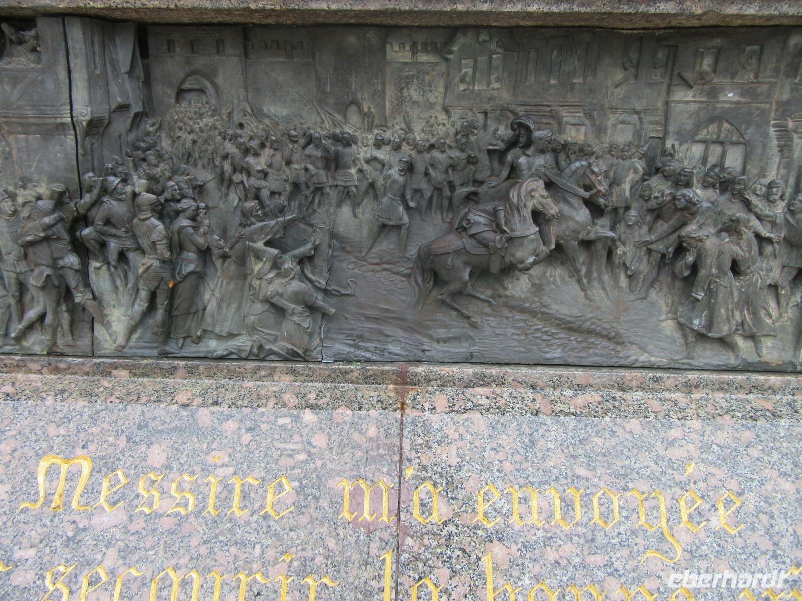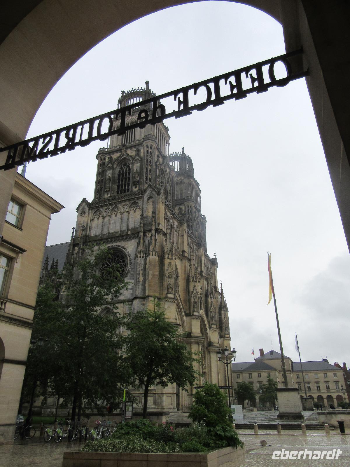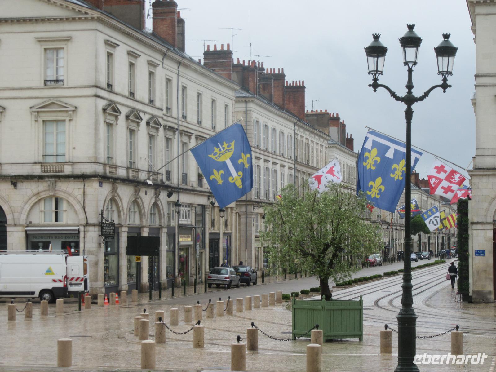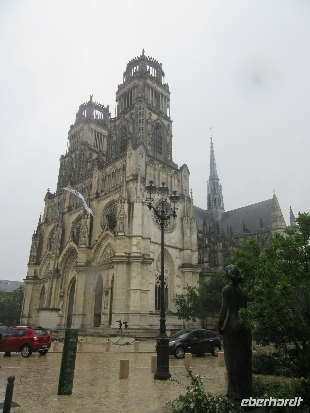 Schließlich können wir so, die Kathedrale von innen besichtigen. Dies ist sonst nicht möglich, da wir sonst nach unserer Radtour immer zu spät in der Stadt sind. In der Stadt der Jeanne d'Arc, der Jungfrau von Orléans beginnen wir somit auch gleich unseren Rundgang an der gotischen Kathedrale Saint Croix, deren Bau sich bis ins 18. und 19. Jahrhundert hinzog. Beim Spaziergang durch das mittelalterliche Viertel können wir eindrucksvolle bauliche Zeugnisse aus sechs Jahrhunderten bestaunen. Ein Regenguss beschert uns allerdings eine „Zwangspause". In einem Café genießen die meisten Teilnehmer einen Espresso und einige Mutige lassen sich zu einem Kir (Weißwein mit Johannisbeerlikör), dem sehr beliebten Aperitif, überreden Anschließend besichtigen wir den Place du Martoi mit dem Reiterstandbild der Jeanne d'Arc.