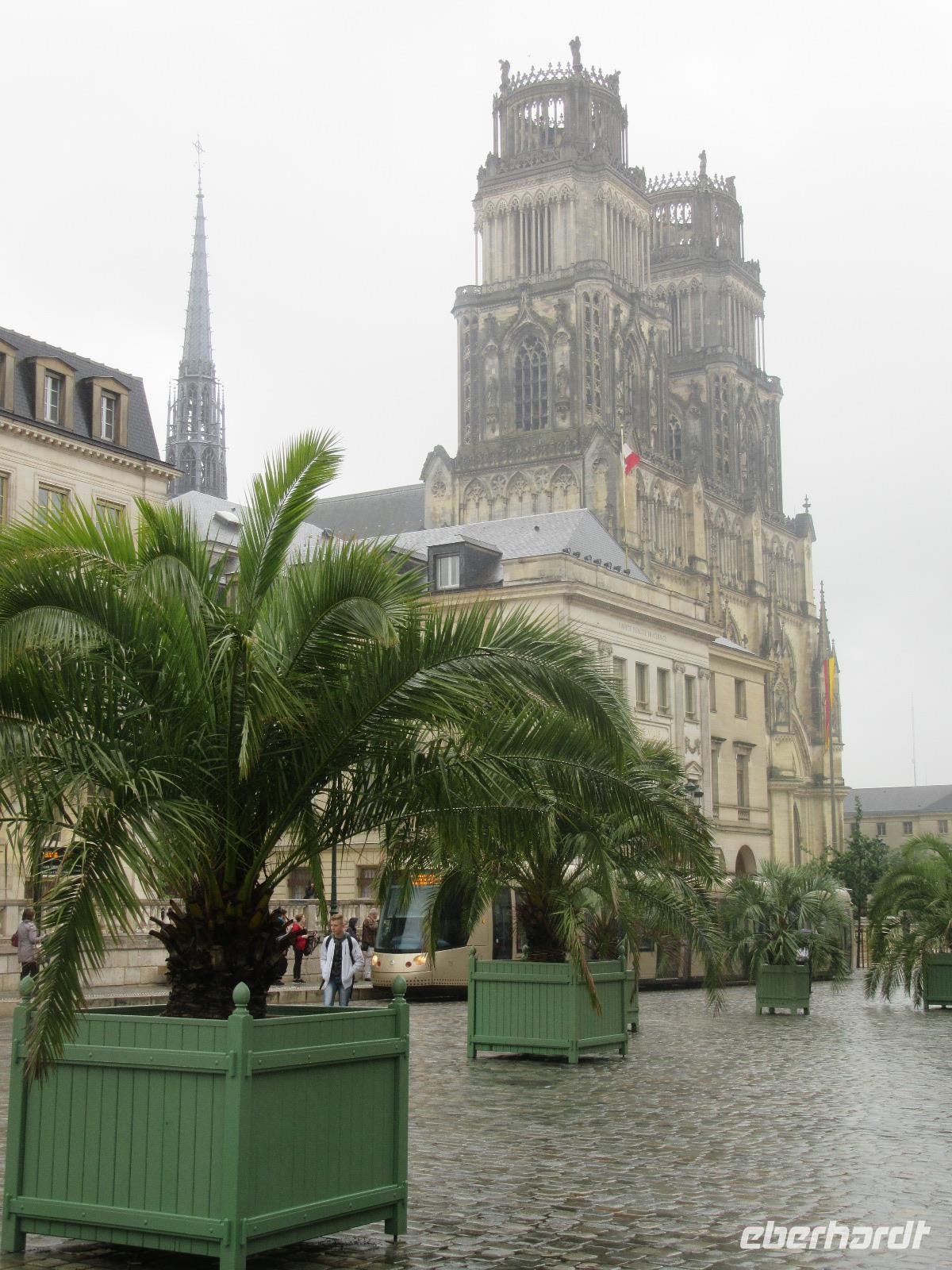 Das heutige Ziel ist Sully-sûr-Loire. Hier würde theoretisch unsere erste Rad Tour beginnen. Wir fahren zunächst über Sens und Montargis in Richtung Gien. Nach Verlassen der Autobahn geht unsere Route bald auf kleineren Landstraße entlang des Loire Dammes. Leider bleibt der Himmel auf der gesamten Fahrt grau und wir fahren immer wieder durch heftige Regenschauer. Deshalb beschließen wir, die Radtour mit einer Erkundung im Trockenen zu beginnen: Mit der Besichtigung des Château Sully-sur-Loire, welches sich eher wie eine Burg als ein Schloss mit dicken, runden Wehrtürmen aus großformatigen Kalksteinen präsentiert. Besonders interessant ist hier der alte Dachstuhl. Nach der Besichtigung des schönen Schlosses, stößt unsere örtliche Reiseleiterin Estelle zu uns. Sie ist, wie sich das für eine echte Radreiseleiterin gehört, mit dem Fahrrad gekommen und meinte, dass der Fahrradweg über weite Strecke nicht wirklich gut ist. Da wir uns das schon gedacht haben, fahren wir weiter nach Orléans und machen hier einen größere Besichtigung der Stadt.