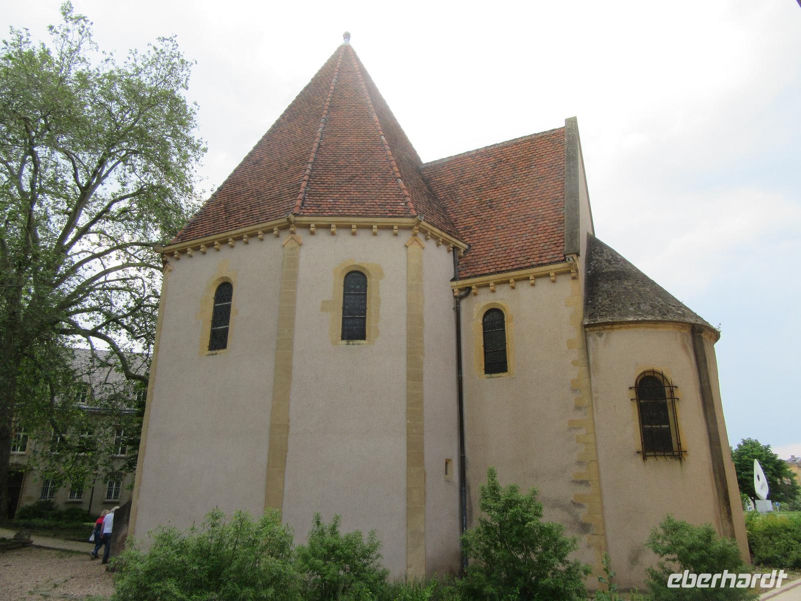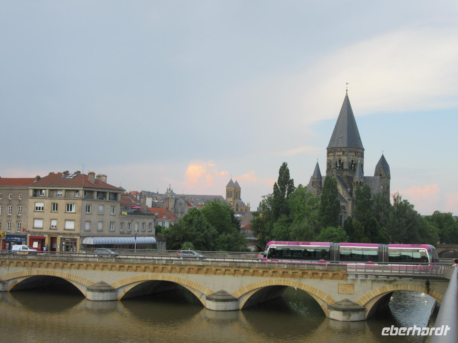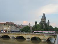 Weiter unten an der Mosel steht der „Temple Neuf", eine nach Vorbild des Doms von Speyer erbaute neoromanische Kirche aus dem Jahr 1904. Sie befindet sich auf einer Moselinsel, die den Fluss wie ein Schiffsbug teilt. Auf dem Hinweg sind wir noch an den hohen Festungsmauern der Stadt vorbei gelaufen, haben den ehemaligen Exerzierplatz der traditionsreichen Festungsstadt Metz gesehen und sind vorbei am Arsenal und einer gigantischen Kaserne gekommen. Am Bus trafen wir uns dann alle wieder, leerten noch einmal den hinteren Kühlschrank und fuhren anschließend in unser Hotel.