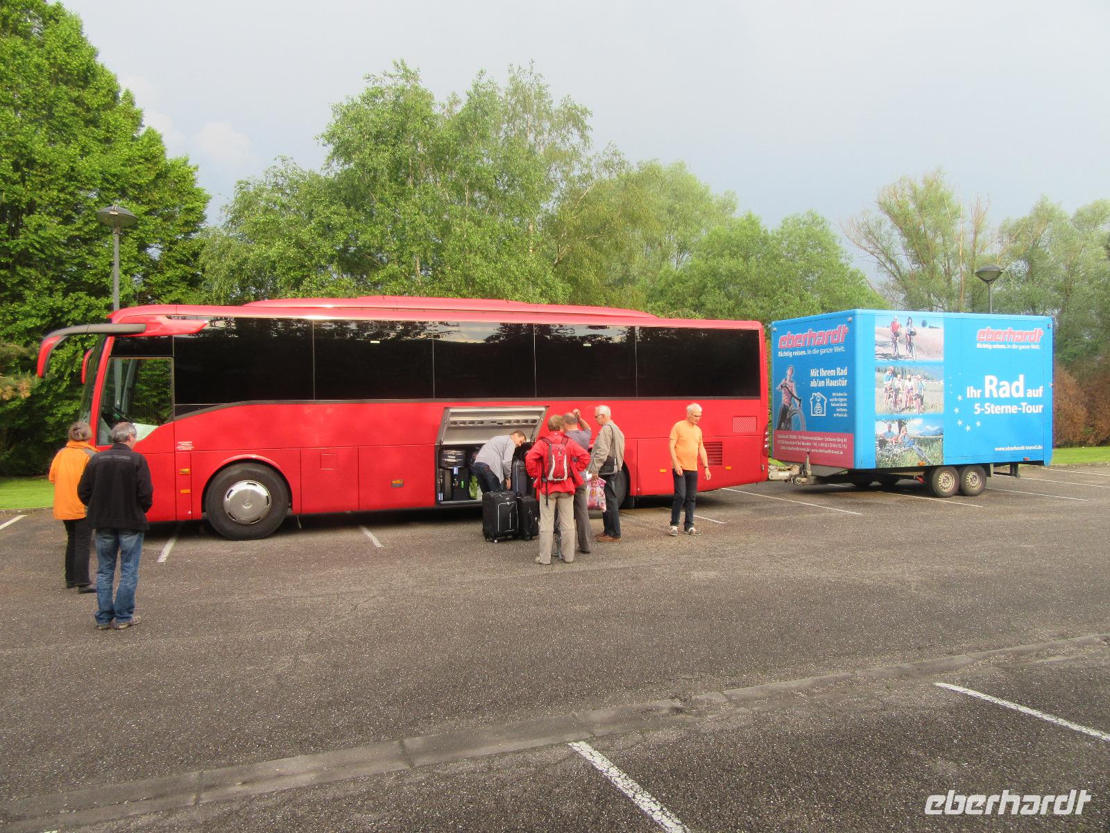 Die Fahrt beginnt morgens bereits um fünf Uhr in Kesselsdorf bei Dresden. Hier steigen die ersten Radler zu, die bereits am Vortag angereist sind. An anderen Haltepunkten gibt es weitere Zustiege, in Eisenach findet der Fahrerwechsel statt und nach dem letzten Zustieg in der Pfalz ist die sportliche Gruppe komplett. Einige werden mit Leihrädern von Eberhardt-Travel fahren, andere haben Ihre eigenen Trekkingräder, Mountainbikes oder E-Bikes dabei. Die Stahlrösser sind sicher im blauen Radanhänger verstaut, alle sind mit der breiten Palette der Outdoor-Bekleidung ausgestattet, denn es sind auch einige Tropfen Regen auf der Wetterkarte der nächsten Tage zu sehen.