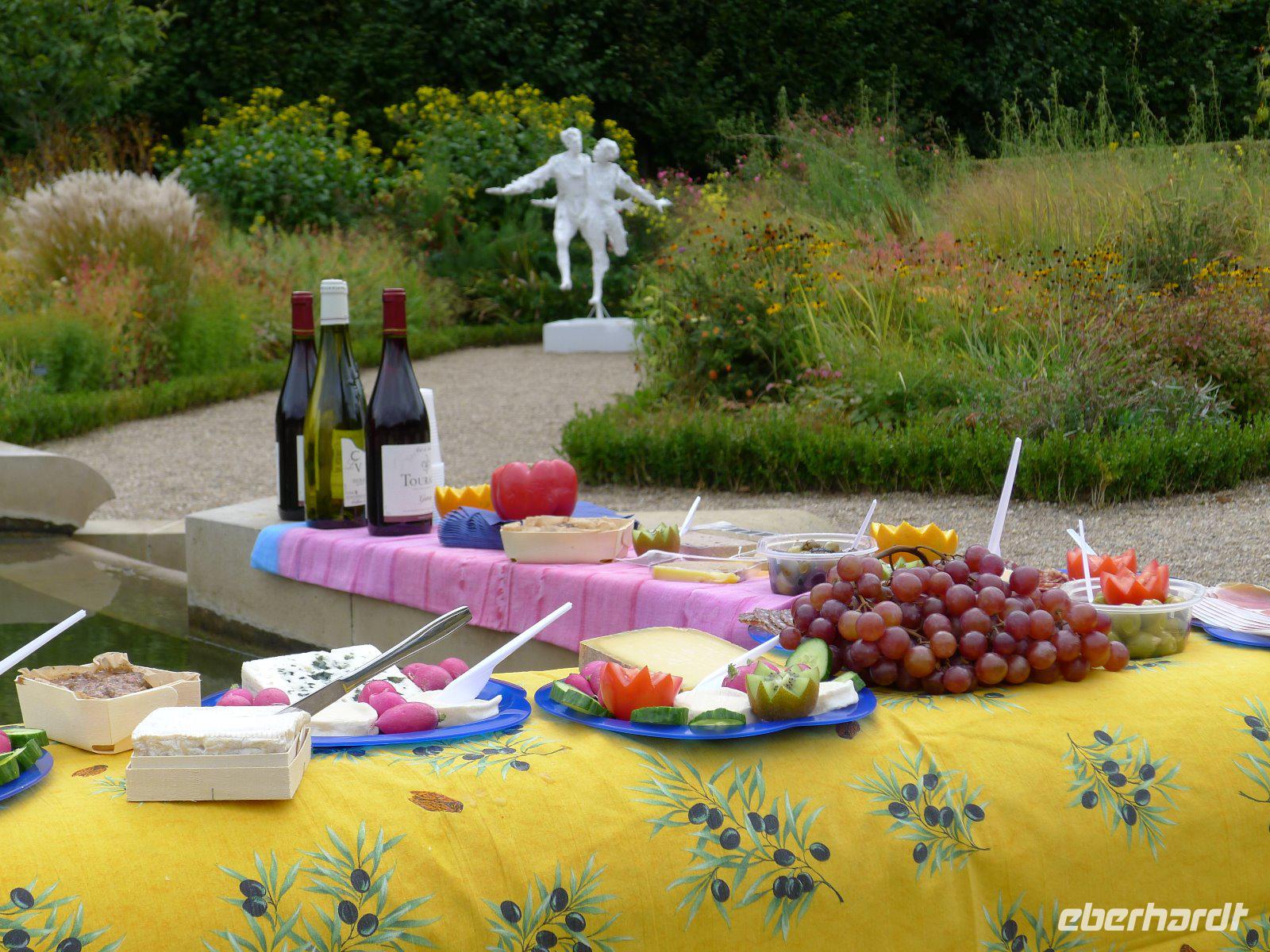 Heute zwang uns der Wettergott, unser Programm etwas umzustellen. Bei heftigem Regen begaben wir uns auf die Entdeckung von Tours. Alle waren dabei und in unserer Regenbekleidung waren wir ein wirklich ‚buntes' Grüppchen. An Radfahren war vorerst nicht zu denken, aber dafür wartete Tours mit allerlei Sehenswertem auf uns. Die Kathedrale von Tours, eine gotische Kirche, ist dem heiligen Gatien geweiht und ihre Fassade beeindruckte uns auch im Regen. Unser Spaziergang führte uns weiter zu den Türmen Charlemagne und der Tour de l´Horloge, die als einzige Türme der ehemaligen Basilika Saint-Martin de Tours erhalten geblieben sind. In der Altstadt bestaunten wir uralte Fachwerkhäuser mit ganz besonders schönen Holzschnitzereien. Man muss nur etwas Geduld haben! Während einer Kaffeepause beschloss der Wettergott, dass es genug sei und die Sonne kam langsam hervor. Um das Glück nicht zu gefährden und die Terrassengärten von Villandry im Trockenen besuchen zu können, ließen wir uns von Ingo im Bus nach Villandry bringen. Villandry ist das letzte der großen Schlösser, die während der Renaissance am Ufer der Loire errichtet wurden. Das Loire-Schloss ist vor allem für seine phantasievollen Gartenanlagen bekannt, die nach einem ganz ausgeklügelten Pflanzplan mit Blumen und Gemüsen gestaltet werden. Während sich die Gruppe Schloss und Gärten ansah, bereiteten die Reiseleiterinnen ein Picknick mit allerlei französischen Spezialitäten vor. An einem romantischen Brunnen im Sonnengarten bei verschiedenen Käsesorten, leckeren Pasteten, Baguette und französischem Wein genossen wir unsere Mittagspause. Das Wetter schien stabil zu bleiben und wir wagten uns auf die Räder und fuhren ohne große Regenschauer von Villandry zurück nach Tours. Nachdem wir uns im Hotel etwas frisch gemacht hatten, ging es ins Zentrum von Tours. Heute Abend erwartete man uns im Restaurant l´Odéon: Pochiertes Ei auf einer Creme mit Fois Gras, ein gedünstetes Fischfilet mit frischen Gemüsen und ein erfrischendes Sorbet mit Minze und Aprikosen, dazu ein Gläschen Wein, was will man mehr?
