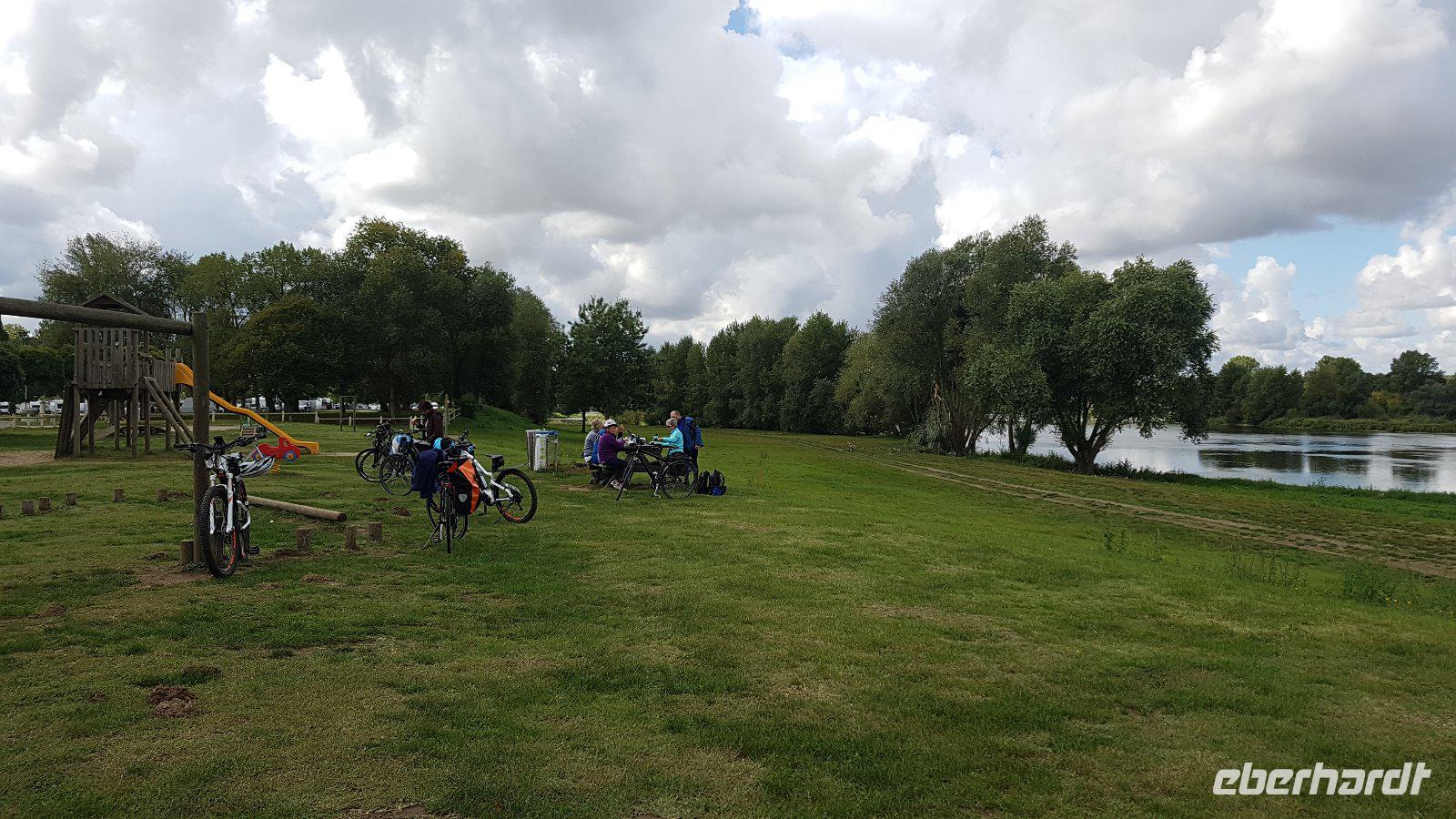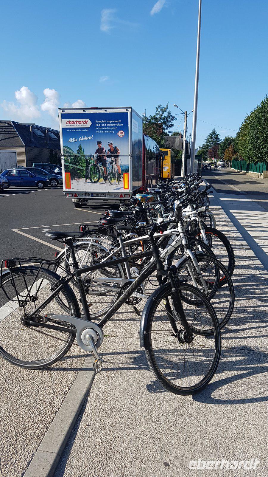 Schon vor sechs Uhr morgens versammelten sich bereits die ersten Reisegäste am Dresdener Flughafen und warteten sehnsüchtig auf das Eintreffen des Busses, der uns alle nach Frankreich bringen sollte. Doch der Bus mit unserem Radanhänger war leider nicht in Sicht. Ein technischer Defekt am Anhänger führte dazu, dass sich unsere Fahrt um mehr als eine Stunde verzögerte. Diesen Umstand nutzten die Radler für ein erstes Kennenlernen bei einem gemeinsamen Frühstück im noch menschenleeren Flughafen. Erleichterung machte sich breit als endlich gegen 7.15 Uhr der Bus am Flughafen ankam - die Fahrt nach Frankreich konnte beginnen! Voller Erwartung machten wir uns auf den Weg. An anderen Haltepunkten wie Chemnitz und Teufelstal gab es weitere Zustiege. Einige Gäste reisten mit eigenem Fahrrad an, andere hatten sich ein Leihrad von Eberhardt gebucht. In Eisenach fand der Fahrerwechsel statt und wir begrüßten unseren Busfahrer Ingo, der uns auf unserer Reise an die Loire begleitete. Regen und Stau verzögerten unsere Fahrt und ließen uns erst am Nachmittag unsere letzten Radfahrer in der Pfalz erreichen. Wir mussten sie immer wieder vertrösten, aber sie hatten sich ihre gute Laune nicht verderben lassen und inzwischen einen kleinen Ausflug in die Pfalz unternommen und sich mit einem typisch pfälzischen Mittagessen gestärkt. Gemeinsam machten wir uns nun auf den Weg nach Troyes, wo wir unsere erste Nacht verbrachten. Bei strömendem Regen wurde es später und später und schließlich mussten wir den Tatsachen ins Auge sehen: Auf unser geplantes Abendessen im Hotel mussten wir verzichten. Frohen Mutes marschierten wir in eine Raststätte in Frankreich, doch das Angebot sah etwas mager aus. Die zweite Raststätte war gerade dabei, zu schließen. Zum Glück hatte Ingo jede Menge Würstchen und Suppen und kühle Getränke an Bord, so dass wir uns nicht verdrießen ließen und unser erstes Abendessen auf französischem Boden im Bus einnahmen. Gegen 0.45 Uhr erreichten wir erschöpft unser Hotel in Troyes und fielen müde ins Bett. Ein langer und anstrengender Anreisetag mit einigen Hindernissen ging zu Ende. Die Vorfreude auf die kommenden Tage und die zu erwartenden Radtouren war trotzdem bei allen ungebrochen! Oder vielleicht gerade deshalb???