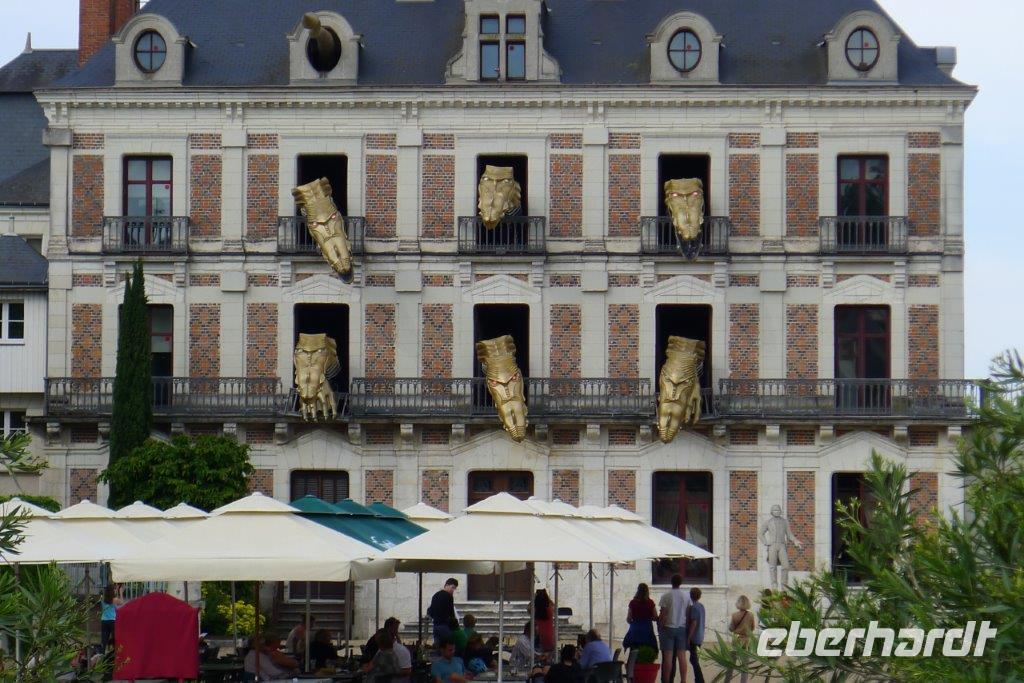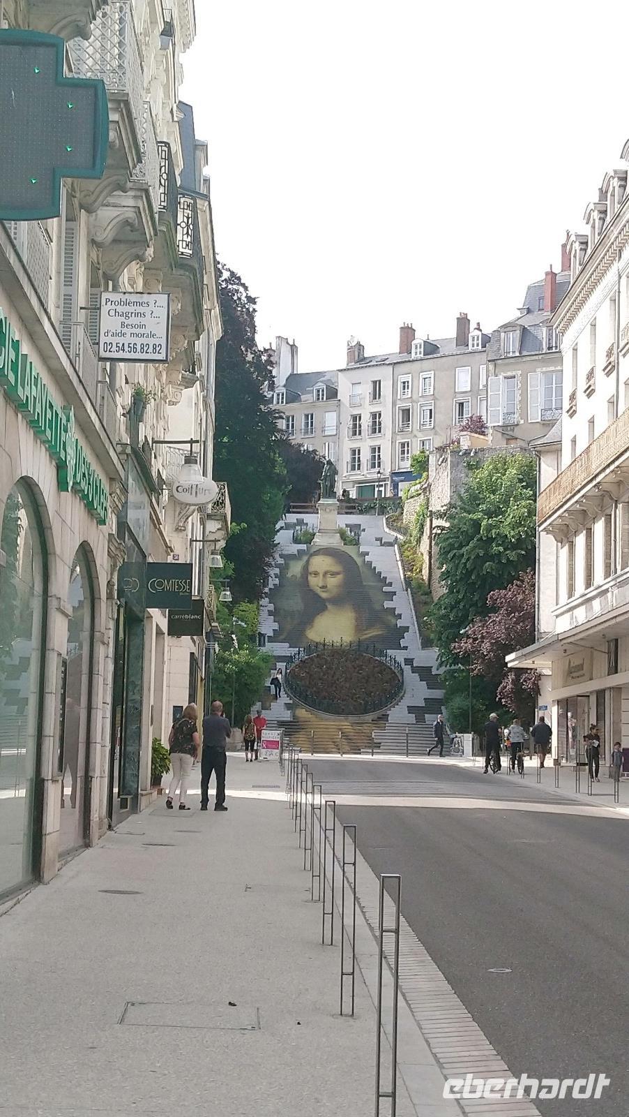 Heute erwartete uns die mit 50 Kilometern längste Tagesetappe unserer Radreise. Diese begann im beschaulichen Örtchen Beaugency. Während Claudia gemeinsam mit den Gästen einen kleinen Rundgang unternahm, luden Steffen, Eric und Laura die Räder ab. Der erste Stopp fand bereits nach wenigen Metern statt, um eine zunächst unscheinbar wirkende Brücke zu betrachten. Bei genauem Hinsehen konnten wir jedoch erkennen, dass kein Brückenbogen dem anderen glich. In diesem Zusammenhang erzählte uns Claudia von der Legende, dass der Teufel diese Brücke gebaut haben soll und die Seele desjenigen einforderte, welcher als erstes die Brücke überqueren würde. Die schlauen Bewohner von Beaugency schickten jedoch als erstes eine Katze auf diesem Weg an das andere Ufer, mit welcher sich der Teufel begnügen musste. Wir radelten weiter in Richtung Südwesten und kehrten der Loire den Rücken, um in das bergige Hinterland zu kommen, in welchem unser nächstes Ziel wartete: Schloss Chambord. Über Jahrhunderte residierten in diesem Jagdschloss die Könige Frankreichs, restaurierten und erweiterten die Gebäude. Neben den zahlreichen Türmen ist vor allem die von Leonardo da Vinci entwickelte doppelläufige Treppe im Inneren des Schlosses ein Hingucker. Bei ca. 24°C Außentemperatur und strahlendem Sonnenschein waren die kühlen Gemächer von Schloss Chambord eine gelungene Abwechslung. Nachdem alle Winkel des Schlosses und der Gartenanlage individuell erkundet waren, setzten wir uns wieder in den Sattel unserer Räder. Zurück an der Loire konnten wir bereits unser Ziel sehen: die kleine Stadt Blois lag am gegenüberliegendem Ufer. Weithin sichtbar sind die Türme der Kathedrale und der Kirche St. Nicolas. Auf der anderen Loireseite in Blois angelangt, sahen wir das Bildnis der Mona Lisa, welches zu Ehren des 500. Todestages von Leonardo da Vinci auf eine Treppe gemalt wurden war. Im Gegensatz zu dem prunkvollen Schloss Chambord vom Mittag erscheint das Schloss von Blois fast unscheinbar. Umso mehr hat uns eine Fassade auf dem Vorhof des Schlosses fasziniert: aus den Fenstern eines Hauses ragten fünf goldene Drachenköpfe. Im Anschluss schlenderten alle eigenständig durch die Straßen der Stadt, genossen einen Kaffee oder ein Eis als Belohnung für die heute zurückgelegte Radstrecke. Dann legten wir mit dem Bus die letzten Kilometer bis nach Tours zurück, wo wir unsere Zimmere für die nächsten fünf Nächte bezogen. Bevor wir erschöpft in die Betten fielen, ließen wir uns Rillette, Fischfilet von der Scholle und eine Schokoladenmousse schmecken.