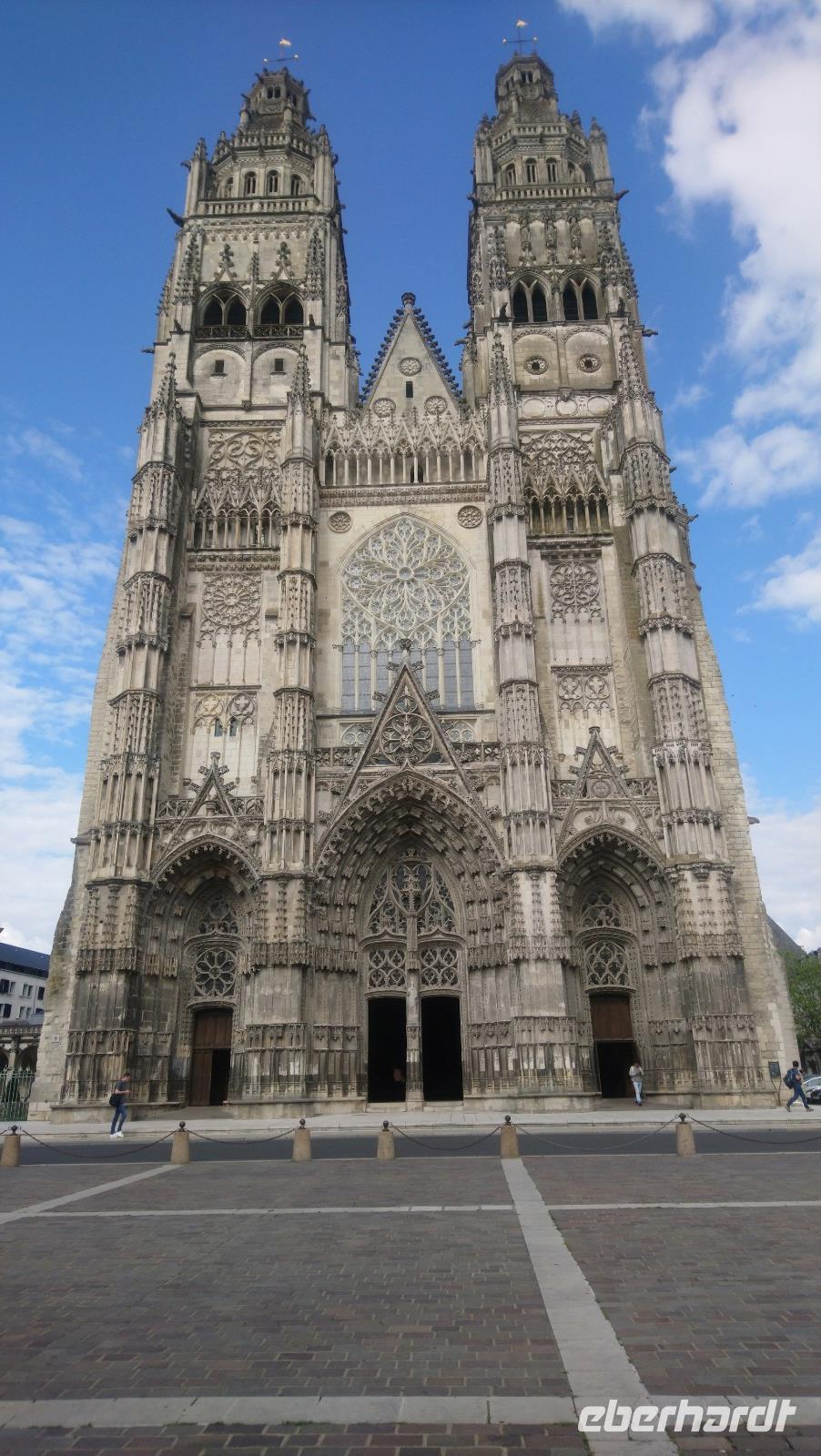 Den Sonnabend begannen wir mit einer kurzen Busfahrt zum Stadtrand von Tours, wo unsere heutige Strecke startete. Bei angenehmen Temperaturen und Sonnenschein durchfuhren wir zunächst einen kleinen Stadtpark, bevor wir an das Ufer des Cher, welcher Tours im Süden begrenzt, kamen. An diesem führte unsere Route in Richtung Westen. Im kleinen Örtchen Savonnières legten wir eine Pause ein, während welcher sich unsere Gäste mit süßen Leckereien aus der ortsansässigen Boulangerie stärken konnten. So wurden bald schon vielerlei süße Eclairs und Madeleines verspeist. Gegen Mittag erreichten wir dann Villandry. Das hiesige Schloss ist besonders für seine außergewöhnlichen Gartenanlagen bekannt, welche durch die Gäste besichtigt wurden. So werden nach einem saisonal abgestimmten Plan verschiedene Gemüsesorten und Blumen angepflanzt. Währenddessen wurde durch die Busfahrer Steffen und Eric, Reiseleiterin Claudia und Reisebegleiterin Laura ein Picknick vor dem Schloss vorbereitet. Bei diesem wurden die lokalen Spezialitäten der Touraine aufgetischt. Neben einem guten Tropfen Wein zählt hierzu frisches Gemüse vom Wochenmarkt, cremiger Ziegenkäse, knuspriges Baguette und verschiedene Pasteten. Nach dieser Stärkung radelten wir ein Stück weiter und passierten den Zusammenfluss von Loire und Cher, bevor wir in Langeais unser heutiges Etappenziel erreichten. Während die Räder im Anhänger verstaut wurden, konnte die Freizeit in Langeais genutzt werden, um Einkäufe zu tätigen oder einen Kaffee zu trinken. Im Anschluss fuhren wir mit dem Bus zurück in unser Hotel, wo wir uns kurz erfrischten, um anschließend einen Stadtrundgang in Tours zu unternehmen. Da an diesem Tag ein Weinfest auf dem Bahnhofsvorplatz stattfand, dauerte die Parkplatzsuche für den Bus ein wenig länger als geplant. Aber auch diese Aufgabe meisterte Steffen mit Bravour. Die erste Station unserer Stadtbesichtigung waren das Museum der schönen Künste und die danebenliegende Kathedrale St. Gatien. Claudia führte uns weiter durch die mittelalterlichen und römischen Stadtviertel, vorbei an alten Fachwerkhäusern und der früher sehr bedeutsamen Pilgerkirche St. Martin. Das für Frankreich typische Zusammensitzen am Abend in kleinen Bistros konnten wir auf einem kleinen Platz mit regem Treiben beobachten. Unser Abendessen genossen wir heute nicht im Hotel, sondern in einer kleinen Crêperie im Stadtkern von Tours. Im „Mamie Bigoude" konnten wir nach Herzenslust süße Crêpes und salzige Galettes probieren. Währenddessen ließen wir uns ein Glas des französischen Apfelweins Cidre bzw. einen Kir, ein Getränk aus Weißwein und Johannisbeerlikör, munden. Vorbei an den beleuchteten Fassaden der Häuser liefen wir anschließend zurück zum Bahnhof, wo unser Bus für die Rückfahrt ins Hotel bereitstand.