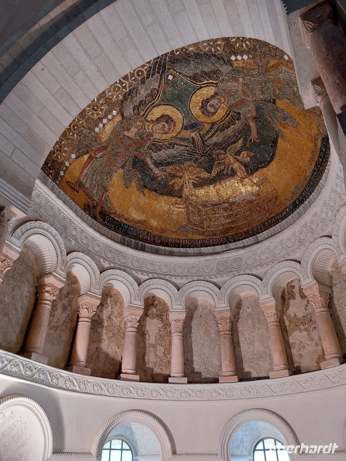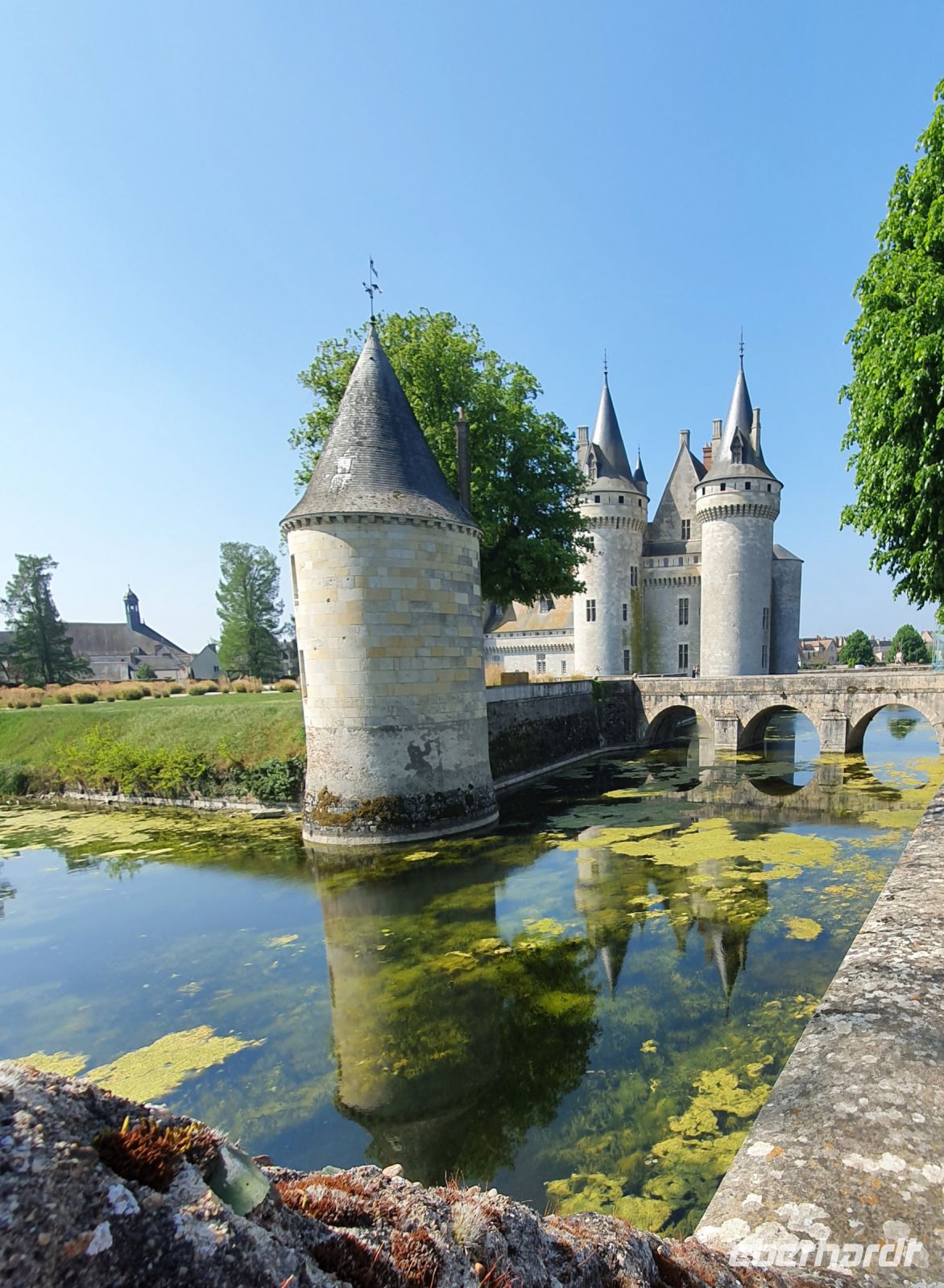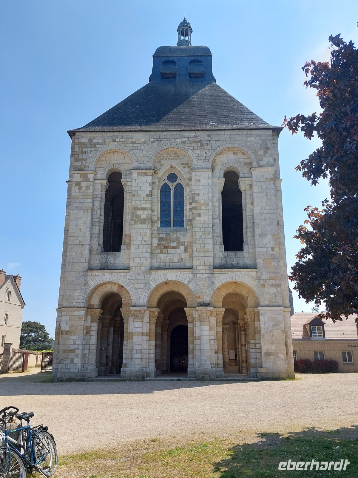 Nach einer dreistündigen Fahrt erreichen wir das Städtchen Sully, das den Beginn des UNESCO-Weltkulturerbes im Tal der Loire markiert. Während Daniel und unser Reisebegleiter Dieter, ein ausgewiesener Fahrradfachmann, die Räder entladen, schauen wir uns das Wasserschloss an, bei dem man die Entwicklung von der Grenzburg zum Repräsentationsbau gut erkennen kann. Dann schwingen wir uns auf die Räder und gelangen bald zu einer der berühmtesten romanischen Kirchen Frankreichs, der Klosterkirche von St. Benoit. Ausgestattet mit einem trutzigen Vierungsturm, der prächtigen Vorhalle, dem einzig noch existierenden französischen Königsgrab und der Krypta mit den Gebeinen des heiligen Bernhard war dies im Mittelalter eine überaus wichtige Pilgerstätte. Wenige Kilometer später kommen wir in Germiny zum Oratorium des Theodulf, eines bedeutenden Freundes Karls des Großen, das mit seinen goldgefassten Mosaiken byzantinisch anmutet.