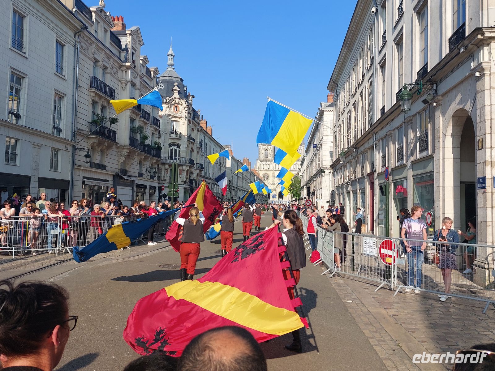 Denn am Abend steht noch die Stadtbesichtigung von Orleans an, das just an diesem Tag die Befreiung von den Engländern durch ihre Stadtpatronin, der heiligen Jungfrau Johanna, feiert. Zuerst geleitet der Reiseleiter die große Gruppe durch den sehr vollen Mittelaltermarkt auf dem Campo Santo, ehe er ihr durch das Begutachten der bunten Kathedrale-Fenster das abenteuerliche Leben dieser außergewöhnlichen Frau nahebringt. Zwei sehr unterschiedliche Denkmale und ihr altes Fachwerk-Wohnhaus runden ihr Bild ab, ehe zum Schluss der feierliche Umzug durch die Stadt mit Fahnenschwingern und zahlreichen Musikkapellen bestaunt werden kann.