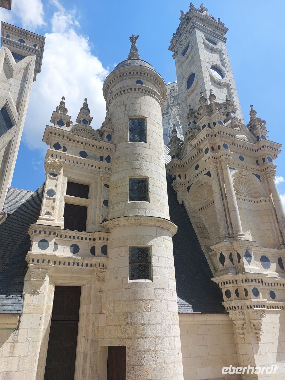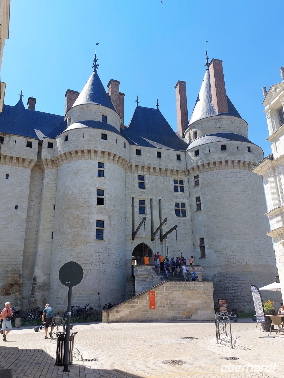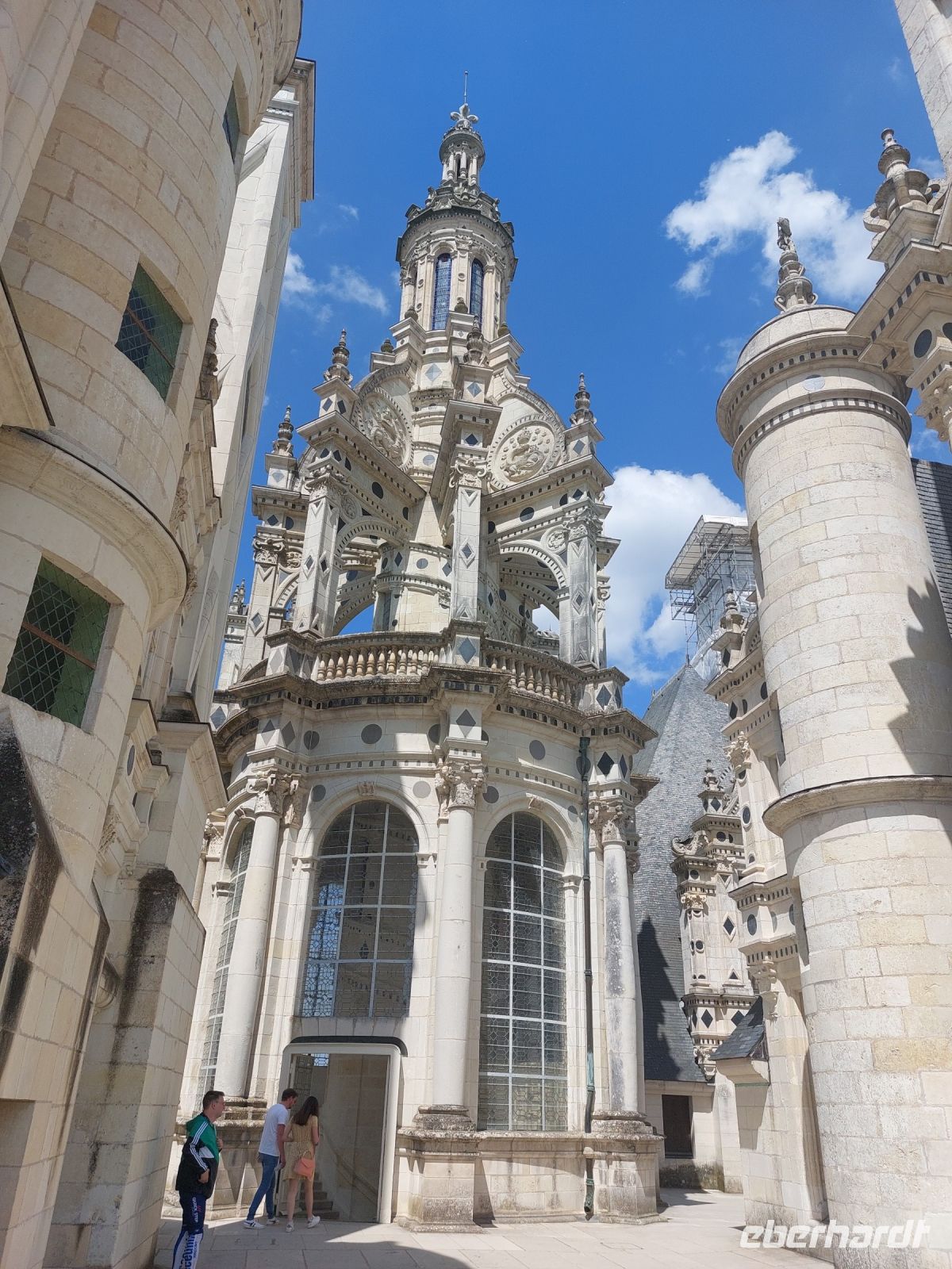 Am Morgen fahren wir mit unserem Bus nach Beaugency und statten dem mittelalterlichen Städtchen mit den zwei riesigen Wehrtürmen einen Besuch ab, um uns mit dem nötigen Proviant für den Tag zu versorgen. Leider sind die französischen Bäcker vom Montag Morgen nicht so begeistert, sodass wir eine Weile nach einer geöffneten Boulangerie suchen müssen, deren Produkte wir dann nach einer schönen Radstrecke bei einer Rast in St. Dye verzehren. Von dem alten Hafen, dem Umschlagplatz für die riesigen Menge von Baumaterialien, geht es weg vom Fluss zum größten der Loire-Schlösser nach Chambord. Mit diesem Prachtbau wollte der französische König Franz I. (der mit dem Salamander) seinen europäischen Widersacher Karl V. ausstechen, nachdem ihm dieser die deutsche Königswürde weggeschnappt hat. Leider wird die Betrachtung des Schlosses durch Gerüste, die momentan an vielen Laternen-Türmen angebracht sind, etwas beeinträchtigt, aber die herrlichen Innenräume und vor allem die doppelt gewundene Innentreppe entschädigen uns wieder.