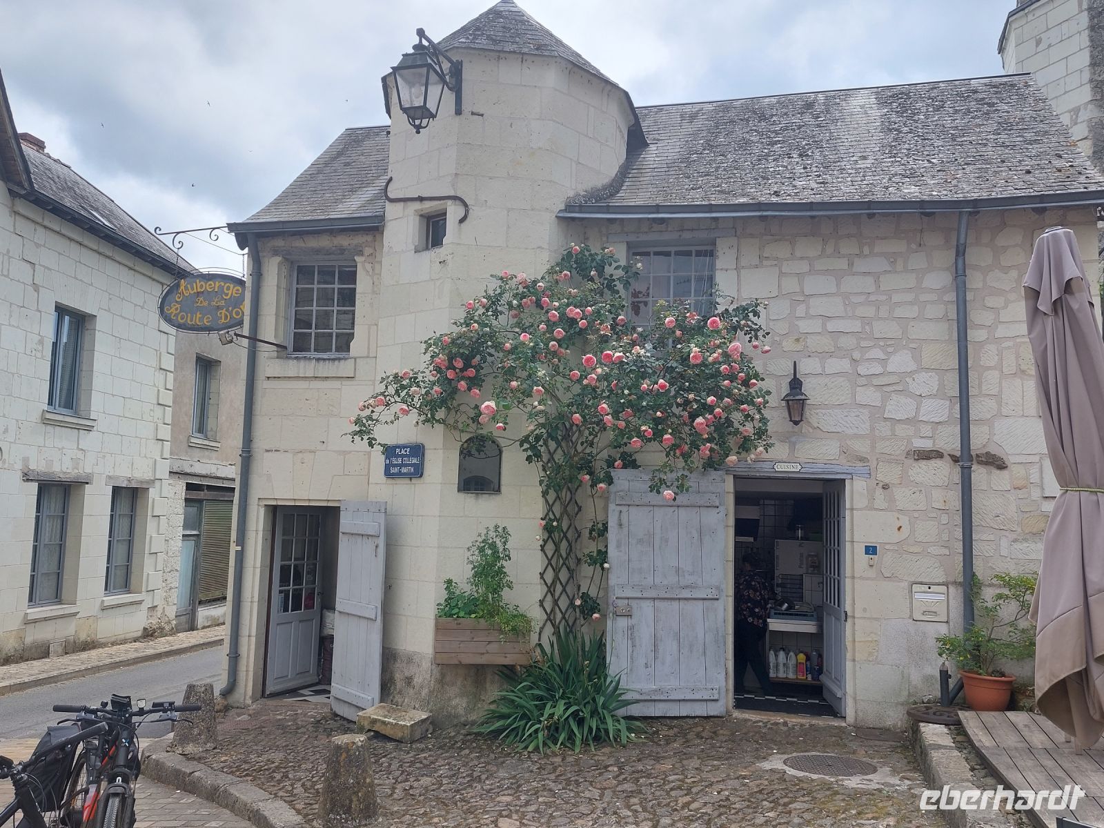 Diesmal beginnt unsere Radtour am Märchenschloss von Usse, das mit seinen Zuckertürmchen und filigranen Zinnen durchaus an Dornröschen denken lässt. Unser Reisebegleiter Dieter hat allerdings keine Zeit sich solchen romantischen Gedanken hinzugeben, denn er muss in Windeseile eine Reifenpanne beheben, was er souverän bewerkstelligt. Dann fahren wir die ersten Kilometer an der Indre, einem kleinen Nebenfluss der Loire entlang, ehe wir uns zu einem weiteren Nebenfluss, der Vienne, aufmachen. An deren Mündung in die Loire, der Flusshochzeit, wie eine Teilnehmerin schön formuliert, machen wir an einem sehr romantischen Platz eine kurze Rast, um dann auf recht holprigen Wegen in das von einer markanten Festung überbaute Chinon zu gelangen. Nach einer individuellen Stadterkundung treffen sich alle wieder, um den letzten Höhepunkt des Tages zu anzusteuern, einer Weinprobe in einem riesigen Tuffstein-Keller vor der Stadt. Dort empfängt uns die temperamentvolle Besitzerin des Weinguts, um uns durch die dunklen Hallen zu führen und uns auf Französisch mit ihren Weinen vertraut zu machen. Dabei spielt der Reiseleiter den Übersetzer und redet manches Mal doppelt so lange wie Madame. Anschließend probieren wir zwei weiße und drei rote Weine und können mit kleinen Häppchen unsere Geschmacksnerven wieder neutralisieren. Mit einigen Flaschen im Gepäck machen wir uns in heiterer Stimmung auf den Weg ins Hotel nach Tours.