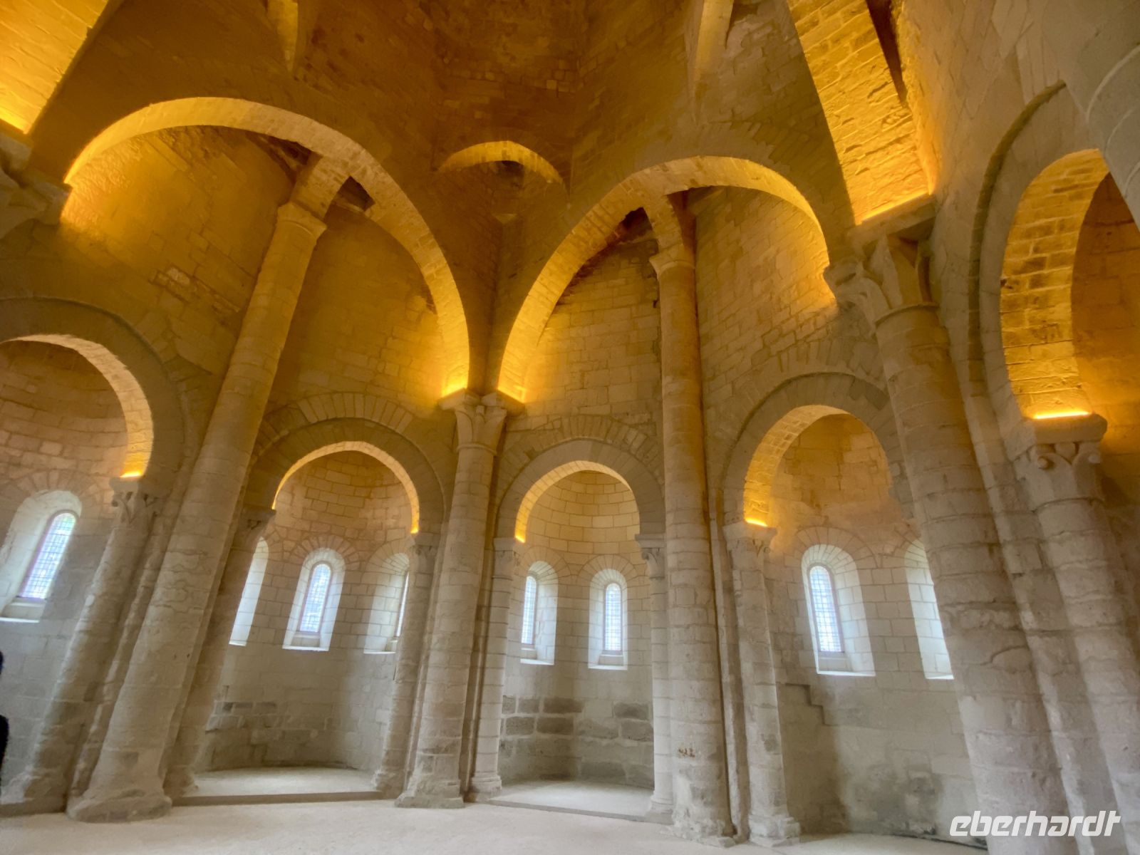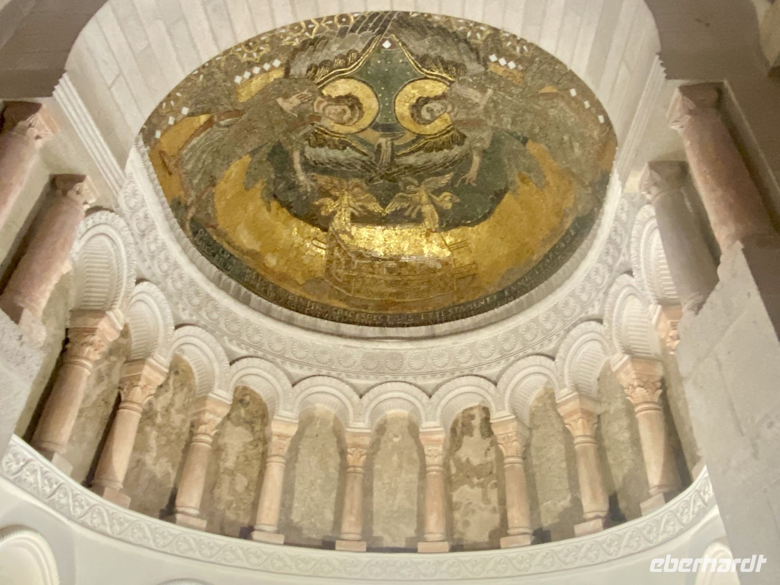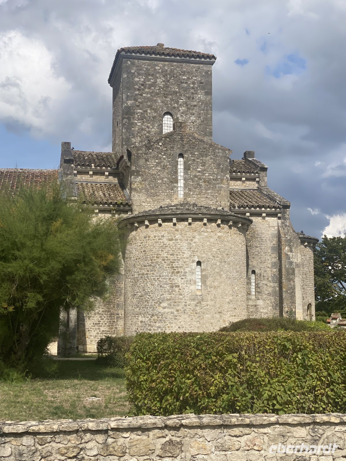 Weiter geht die Tour ins verschlafene Örtchen Germigny-du-Pre, in dem im einzigen Gasthof die Mittagspause ansteht. Beim gerade am Mittagstisch sitzenden Patron und seiner Frau löst unsere Ankunft eine panikartige Hektik aus, was dazu führt, dass die schon bezahlte Cola immer im Blickfeld ist, aber lange nicht überreicht wird. Doch die riesigen Sandwiches und das Freibier für die Fahrradmonteure entschädigen für den anfänglichen Bestellungsmarathon und gut gestärkt können wir uns dem Highlight des Ortes zuwenden. Eben mal über die Straße schauen wir das Oratorium des Theodulf, eines Freundes Karls des Großen, an. In diesem uralten Kirchlein können wir das einzige karolingische Deckenmosaik nördlich der Alpen mit seinen vielen goldenen Steinchen bewundern.