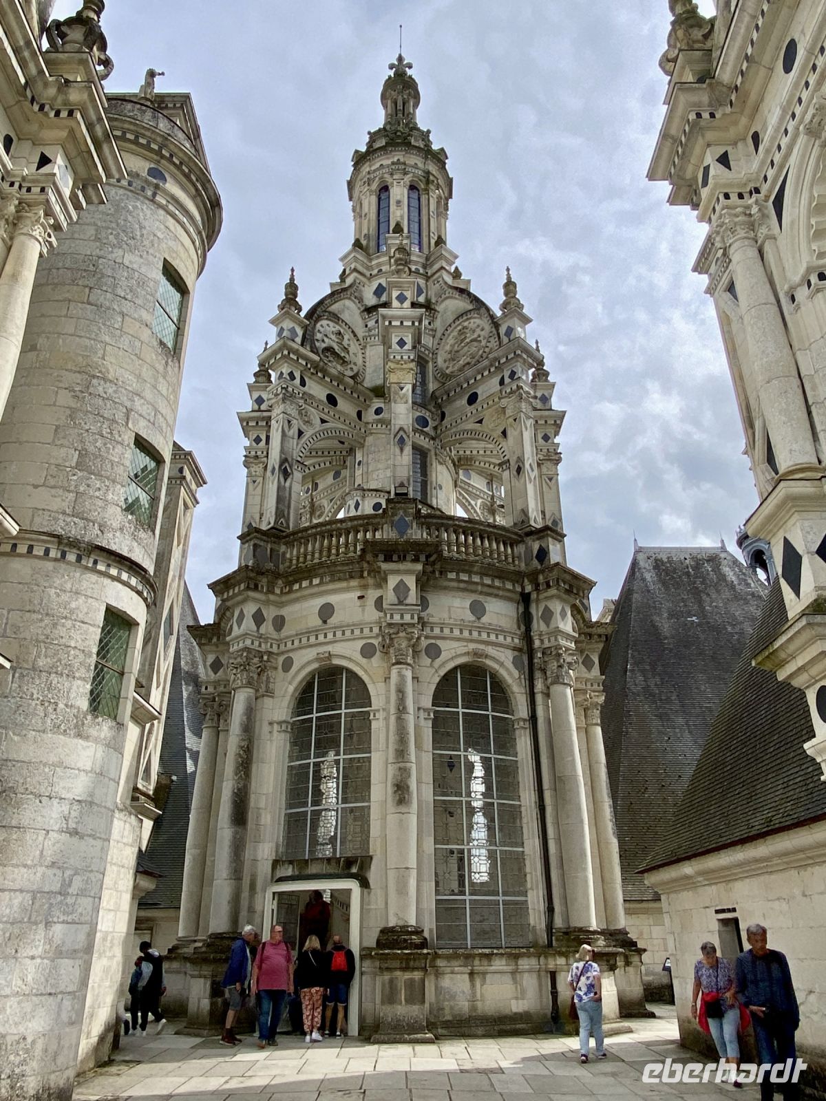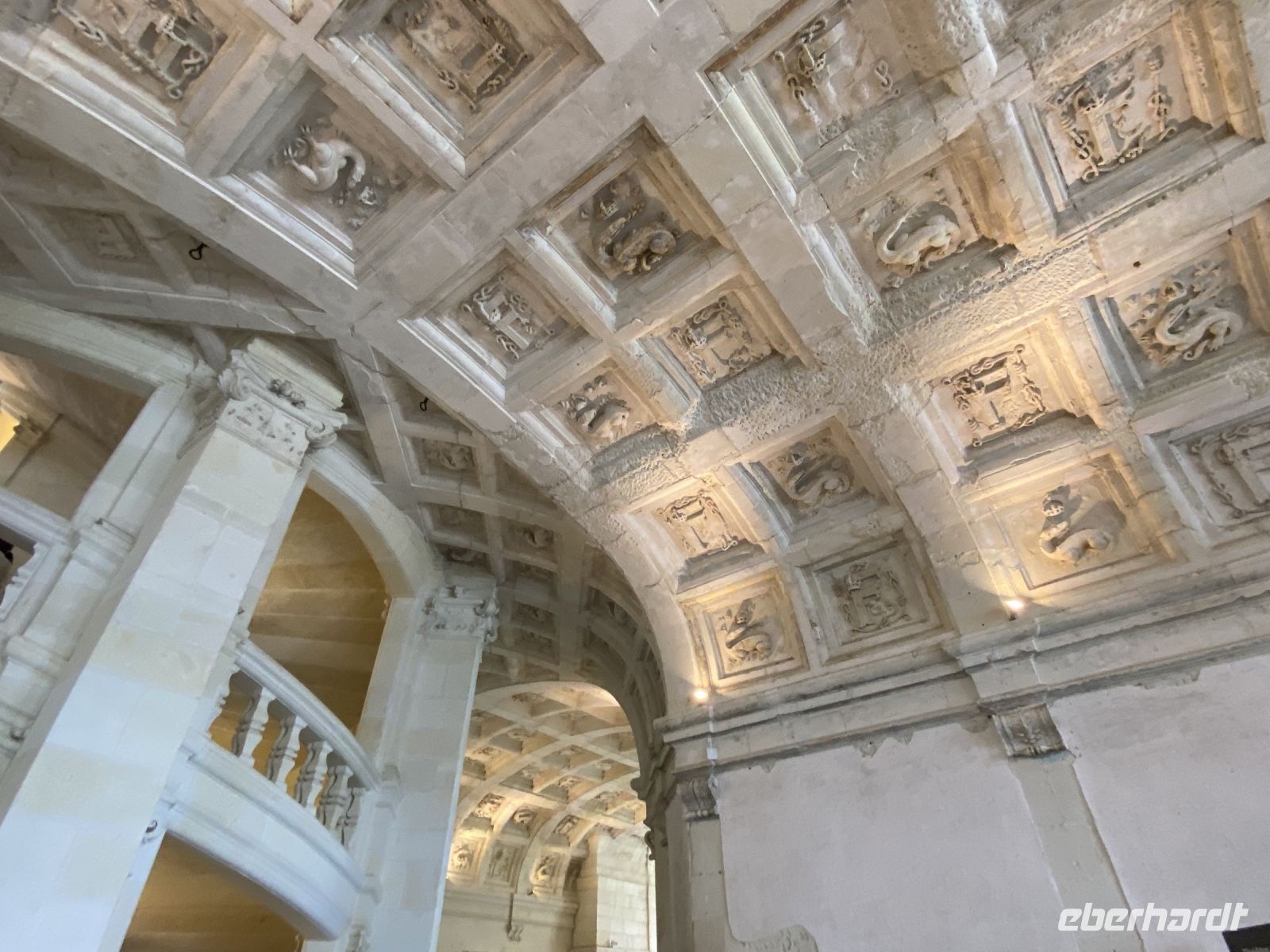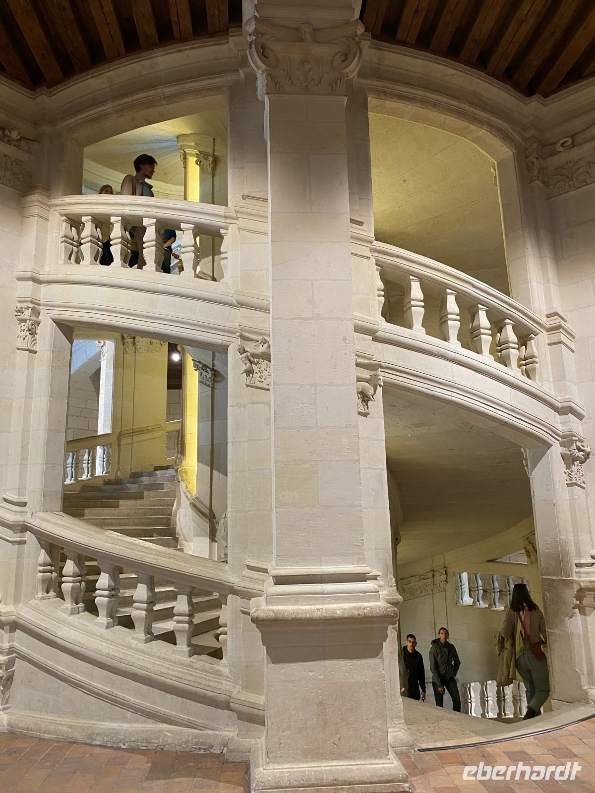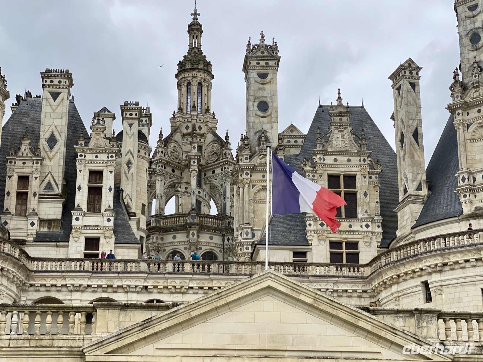 entschließt sich der Reiseleiter nach Absprache mit der Gruppe, den Spaziergang durch den Ort zu verlängern und mit dem Bus zum größten der Loire-Schlösser nach Chambord zu fahren. Da das miese Wetter nun eine Pause eingelegt hat, in allen Vorhersagen aber am Nachmittag sehr schlecht sein soll, entschließen wir uns zu einer improvisierten Rundfahrt in der Gegend des Schlosses. Mit diesem Prachtbau wollte der französische König Franz I. (der mit dem Salamander) seinen europäischen Widersacher Karl V. ausstechen, nachdem ihm dieser die deutsche Königswürde weggeschnappt hat. Wir stehen überwältigt vor den unzähligen Türmchen, Laternen und Kamine und der ausladenden Symmetrie dieses riesigen Schlosses. Und auch die herrlichen Innenräume und vor allem die doppelt gewundene Innentreppe, die der greise Leonardo da Vinci geplant hat, lassen einen über die Maßen staunen. Staunen muss auch die weibliche Aufsichtsperson, als der Reiseleiter die originale Bühne des berühmten Theaterdichters Moliere besteigt und ein Gedicht zum Besten gibt, ehe sie ihn ob dieses Faux-pas herunterkommandiert.
