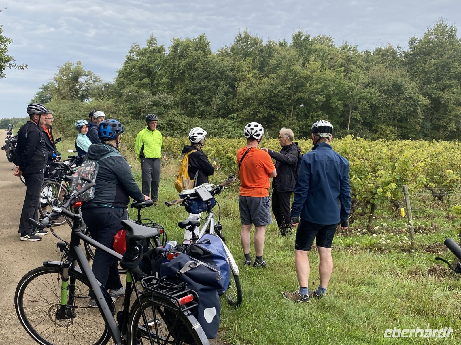 Nachdem uns unser Busfahrer Sergej nach Chaumont gebracht hat, radeln wir zunächst an unserer ehrwürdigen Loire entlang, ehe wir uns dann in kleineren Anstiegen durch die Weinberge nach Amboise bewegen. Dabei warten die E-Bike-Fahrer vorbildlich auf diejenigen, die sich mittels Muskelkraft den Berg hoch quälen. Zur Erholung für die schnaufenden Radler führt der Reiseleiter angesichts der Reben in die Geheimnisse des französischen Weines ein, was auch als Vorbereitung zur noch folgenden Weinverkostung dienen soll.