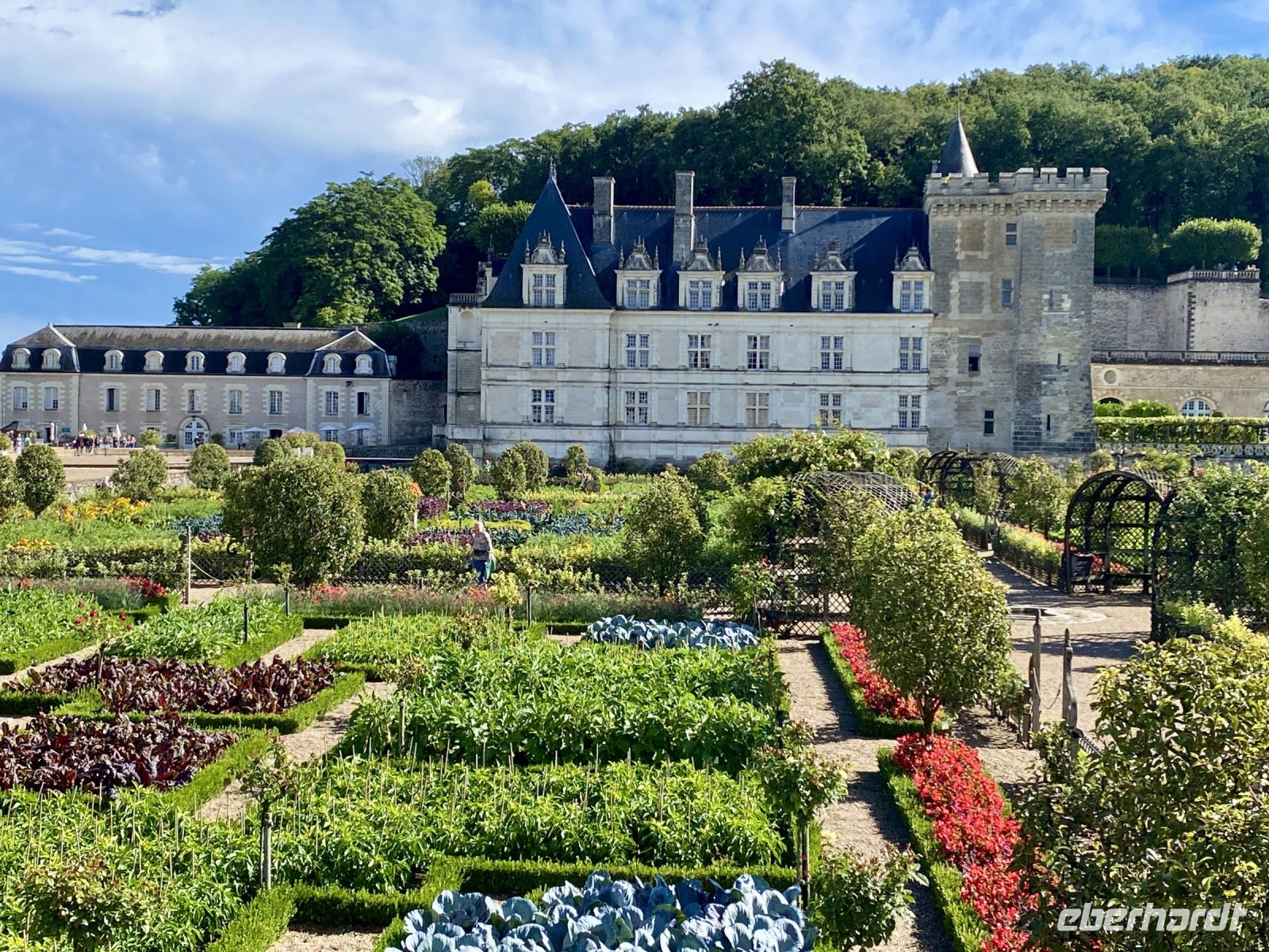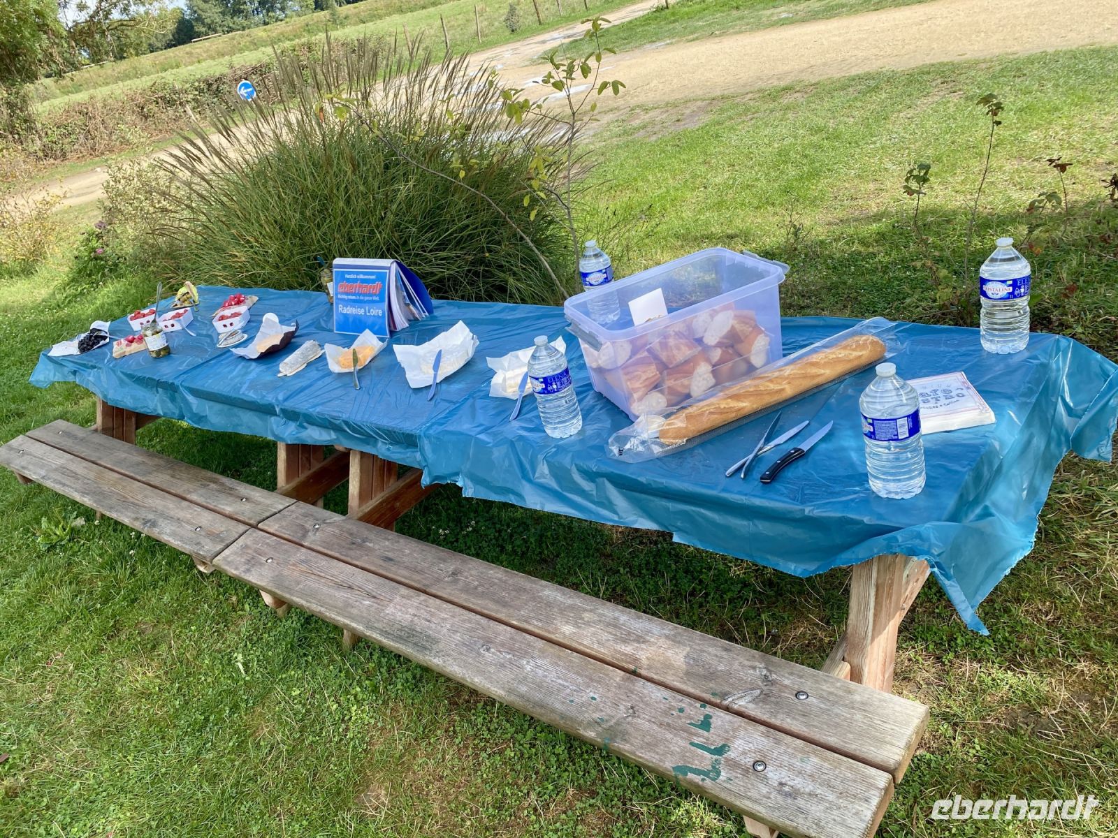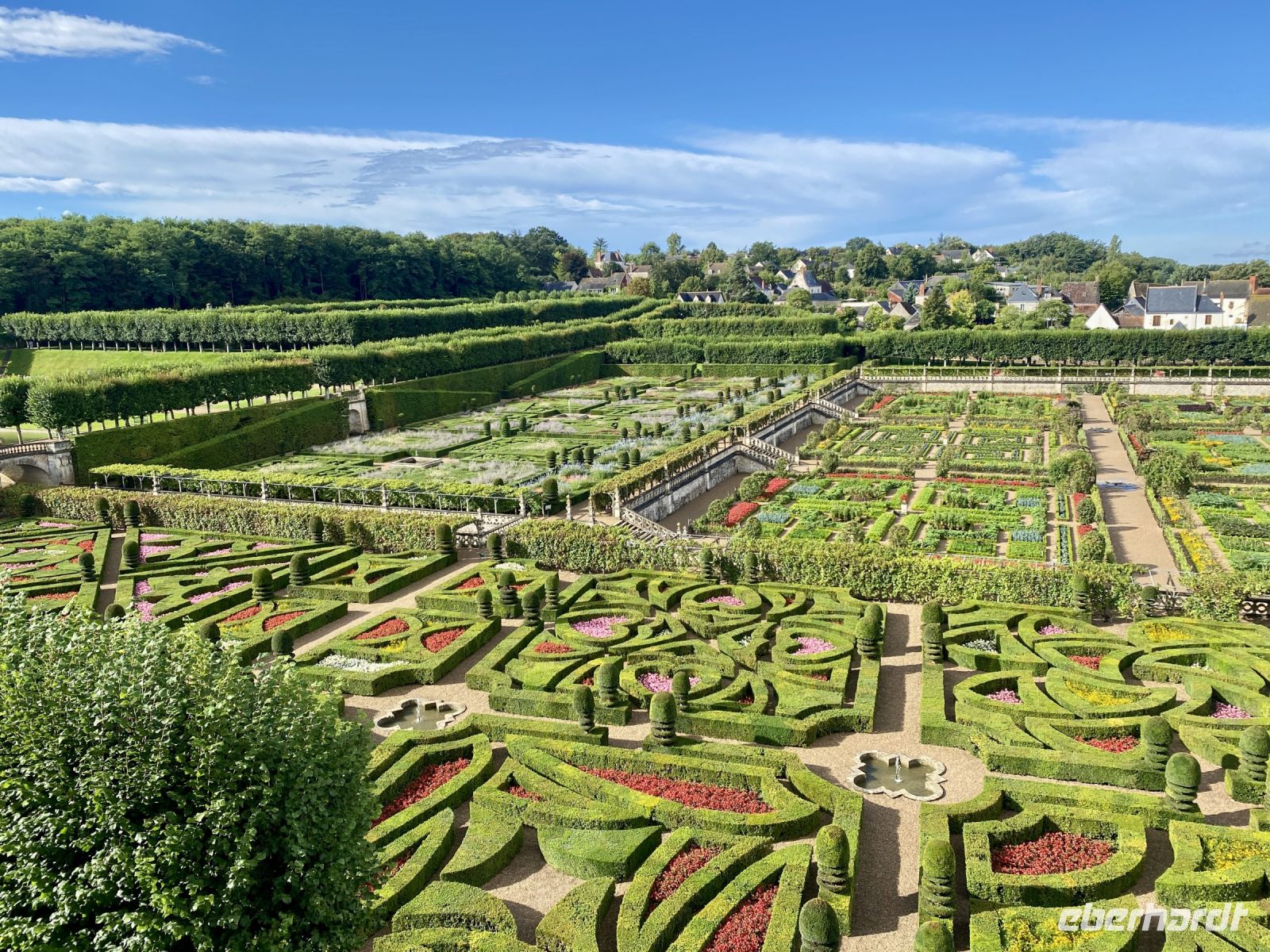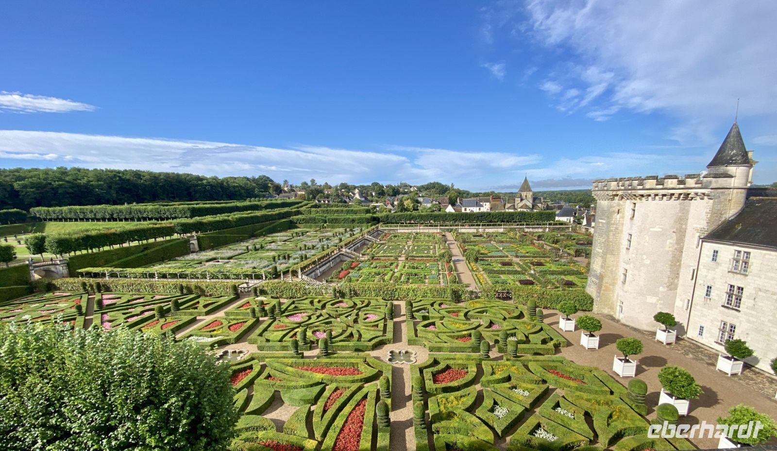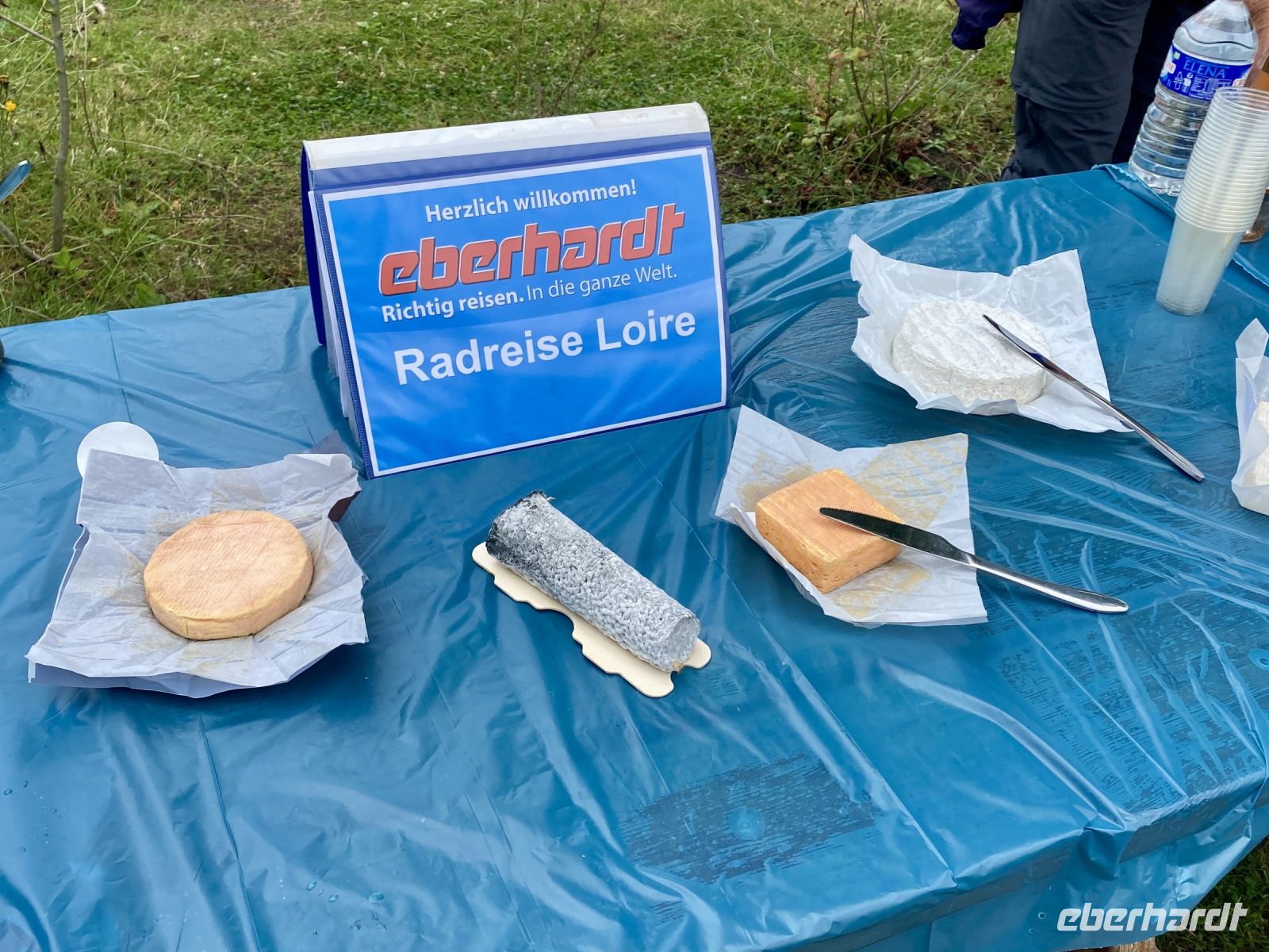 Da es am Morgen recht stark regnet, lassen wir uns mit dem Bus zum Städtchen Villandry fahren. Doch als wir dort ankommen, scheint die Sonne ("reisende Engel") und alle freuen sich auf die Besichtigung. Dieser Ort besticht weniger durch sein Schloss, sondern vielmehr durch seine überaus kunstvoll angelegten Gärten. Während sich die Radlergruppe, vor allem aber die zahlreich vertretenen Gartenliebhaberinnen, diese florale Schönheit zu Gemüte führen und aus dem Staunen nicht mehr heraus kommen, bereitet der Reiseleiter ein schmackhaftes Picknick mit typisch französischen Leckereien vor, um die zurückkehrende Truppe im Namen von EBERHARDT TRAVEL einzuladen. Hier können die Gäste milde bis würzige Käsesorten probieren, hier können sie sich an Pasteten mit Wildpilzen und denen aus der Gänseleber laben und die Crudite darf auch nicht fehlen. Nicht fehlen darf auch die kabarettistische Einlage unseres Maitre de amusement, der, inspiriert durch den Käse aus Kuhmilch, ein starckdeutsches Gedicht über die Kuh zum Besten gibt. Dies wird begeistert aufgenommen und dank seiner großzügigen Mundschenkkünste (typischer kühler Rosewein) wird die Fahrt dann recht beschwingt in Angriff genommen.