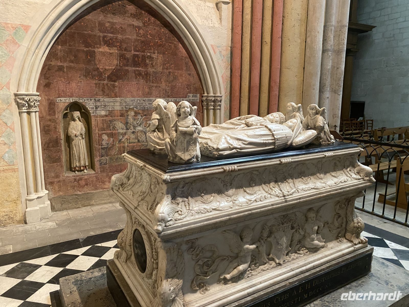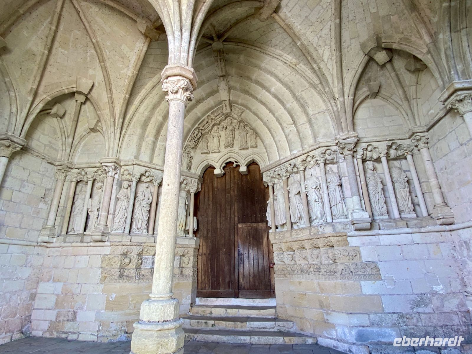 Und nachdem der Reiseleiter den Gästen diese ehrwürdige Pilgerkirche samt Königsgrab, Krypta und leider mit einem Gerüst versehenen Vorbau nahe gebracht hat und alle wieder bereit zum Weiterfahren sind, ereilt uns die erste Panne. Ein fieser Nagel hat für einen platten Reifen gesorgt. Doch was darauf folgt, ist einfach phänomenal. Sofort wird das lädierte Rad von mehreren Gruppenmitgliedern fachmännisch bearbeitet, die alle Hand in Hand agieren, und nach wenigen Minuten ist ein neuer Schlauch eingezogen. Diese Aktion, so kann man im Nachhinein feststellen, ist wohl der Beginn einer bemerkenswerten Gruppenzusammengehörigkeit.
