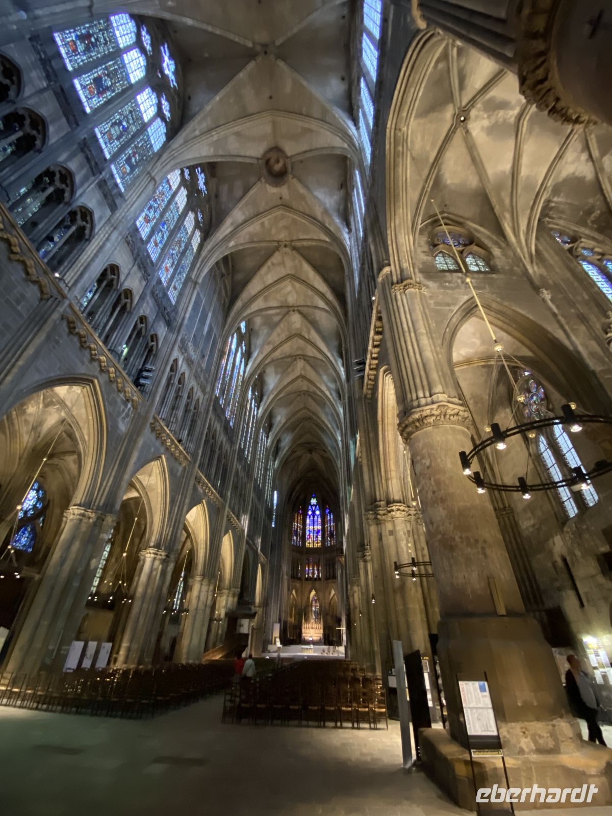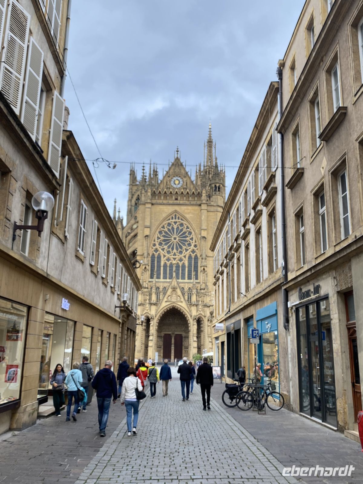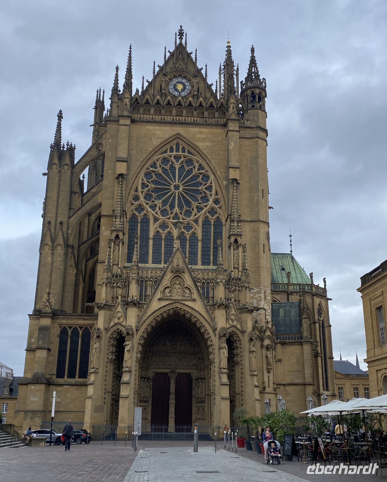 Nachdem die Koffer gepackt und im Bus verstaut sind, machen wir auf die Heimreise, die wir nach ungefähr 600 Kilometern unterbrechen, um uns in der bedeutenden lothringischen Metropole Metz einen schönen Abend zu gönnen. Da unser Hotel im Viertel Imperial nahe am Bahnhof liegt, lässt sich die wechselvolle Geschichte dieser Stadt sehr gut erläutern.. Den sehr deutsch anmutenden Häusern folgen in der Altstadt Bauten französischer Prägung aus allen Jahrhunderten. Der Höhepunkt dieses letzten Stadtrundgangs stellt die extrem hohe Kathedrale mit ihren riesengroßen herrlichen Fenstern dar, bei denen vor allem die des berühmten Künstlers Marc Chagall hervorstechen. Aber auch die mittelalterlichen Plätze mit ihren Laubengängen, die auch an diesem Dienstag voller Menschen sind, erregen ebenso unsere Aufmerksamkeit wie der heitere Theaterplatz auf der Moselinsel, der vom Temple Neuf, einer Kirche abgeschlossen wird, die zur Zeit der deutschen Herrschaft nach dem Vorbild des Speyrer Domes geschaffen wurde. Auf dem Rückweg in Richtung Hotel kehren wir dann in einer für die Gegend typischen Brasserie ein, in der wir unter dem Hirsch tafeln und dazu ein kühles Bier trinken. Danach lassen einige den Abend etwas wehmütig an der Hotelbar ausklingen, da sie wissen, dass der Urlaub sich dem Ende zuneigt.