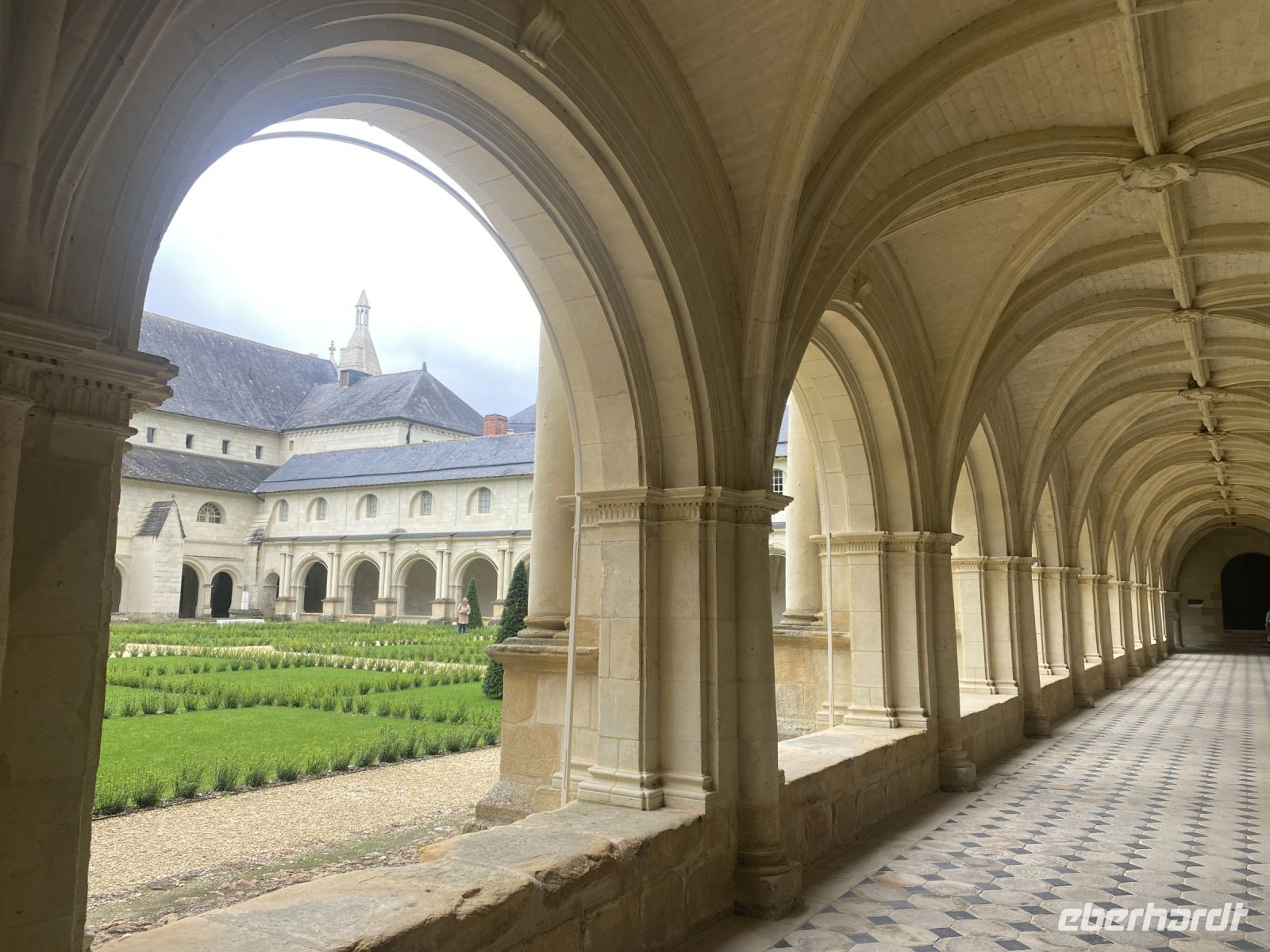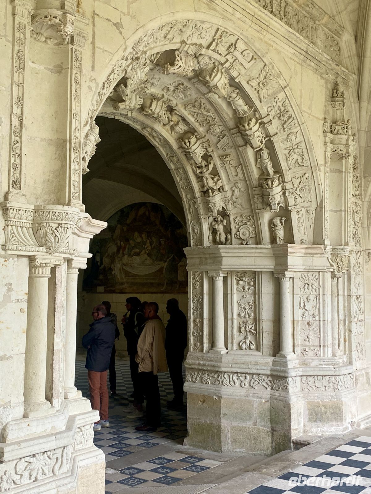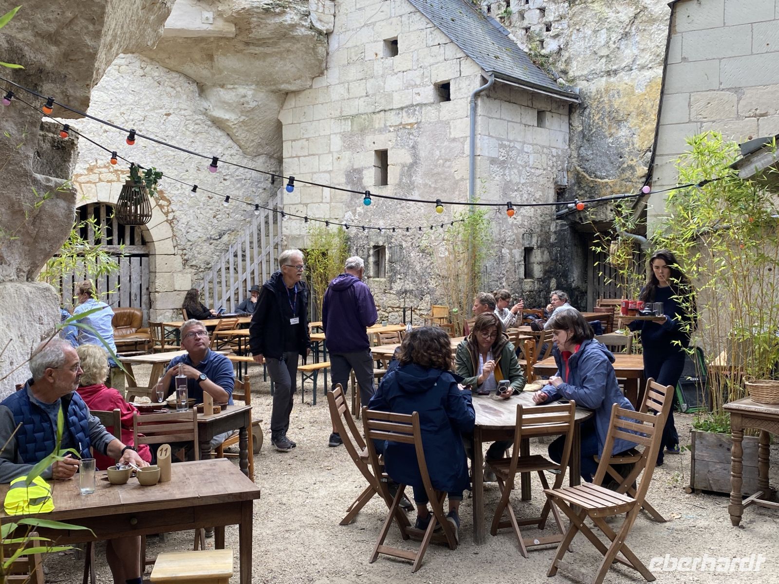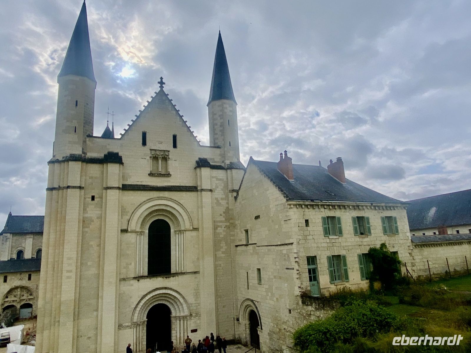 Da die Radkilometer sich in den letzten Tagen zu einer erklecklichen Summe angehäuft haben, drehen wir das Programm unserer heutige Tour einfach um und können so einige Gefällstrecken genießen. Zuerst erkunden wir die altehrwürdige Abtei von Fontevraud, in deren Kirche die Größen des Herrschergeschlechtes der Plantagenets ihre letzte Ruhe gefunden haben. Vor allem die berühmteste Frau des Mittelalters, Eleonore von Aquitanien und ihr nicht weniger berühmter Sohn Richard Löwenherz fesseln unsere Aufmerksamkeit. Aber auch die beiden Kreuzgänge mit ihren bemerkenswerten umliegenden Räumen und vor allem die exaltierte spitzgieblige Küche üben eine eigentümliche Faszination aus. Dann fahren wir wieder zu unserem Fluss hinunter, um mit Hilfe unseres Chef-Navigators zu den bemerkenswerten Höhlenbehausungen von Souzay zu gelangen, um dort in der urigen Kneipe bei guter Musik unsere Mittagspause zu machen. Mit etwas Verspätung (die beiden hinter dem Tresen sind mit unseren Bestellungen etwas überfordert) schwingen wir uns wieder auf unsere Räder und fahren entlang der immer breiter werdenden Loire nach Saumur. Dort schlendern wir durch die Straßen der Altstadt und manche erklimmen gar das schöne Chateau, das durch ein bekanntes Stundenbuch des Herzogs von Berry zu einem Modellschloss wurde. Da die Gegend berühmt für seine Sektherstellung ist, statten wir dem Marktführer Ackerman einen Besuch ab und probieren vier unterschiedliche Cremants, ehe wir uns au bord de la Loire auf unsere letzten Radstrecke machen. Nach über 200 Kilometern steigen wir müde, aber doch alle sehr zufrieden in den Bus zurück nach Tours.