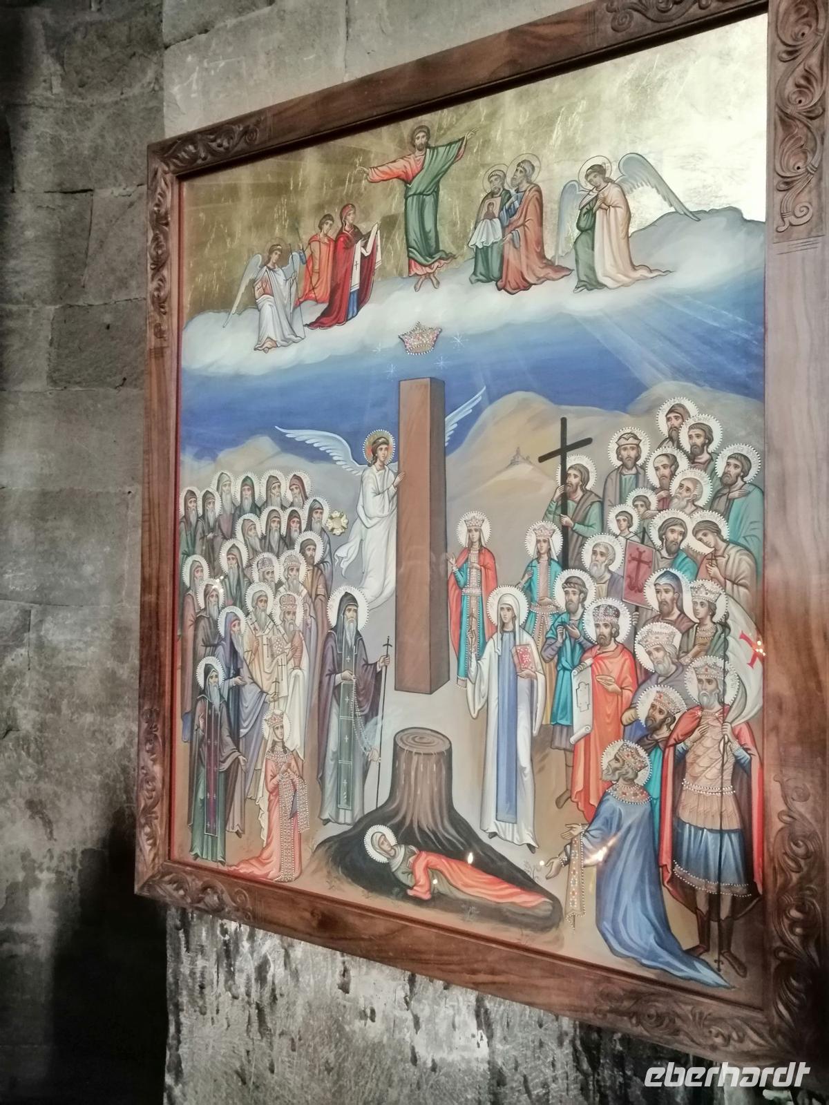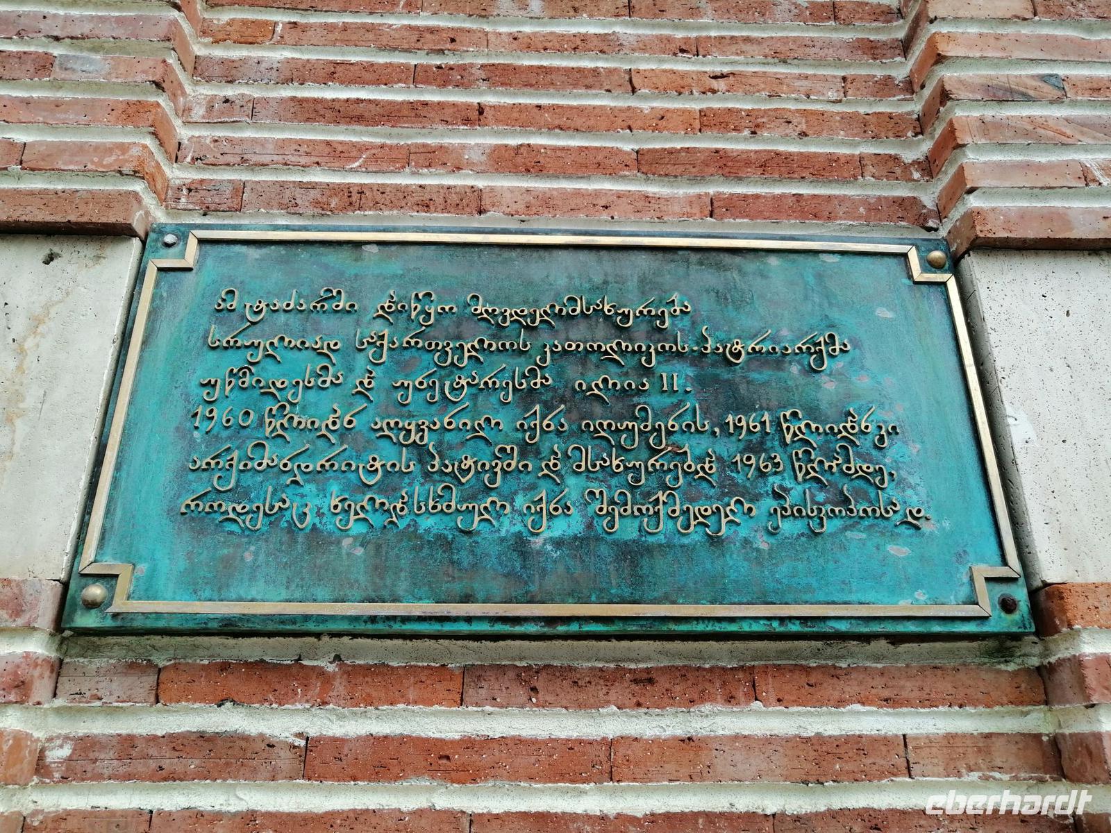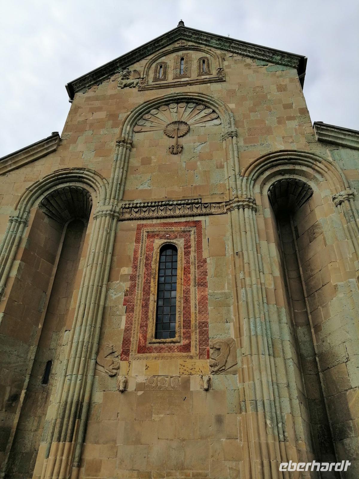 Um die Kathedrale herum schlendernd, fiel uns an der Stelle des Kreuzes der Nino, gebunden aus Weinreben, im oberen Teil der Außenfassade vor allem die Darstellung einer abgeschlagenen Hand auf. Sopo klärte uns auf: der Legende nach sollte durch diese rigide Maßnahme der Baumeister der Kathedrale kein zweites Mal in der Lage sein, ein vergleichbares Bauwerk zu errichten.