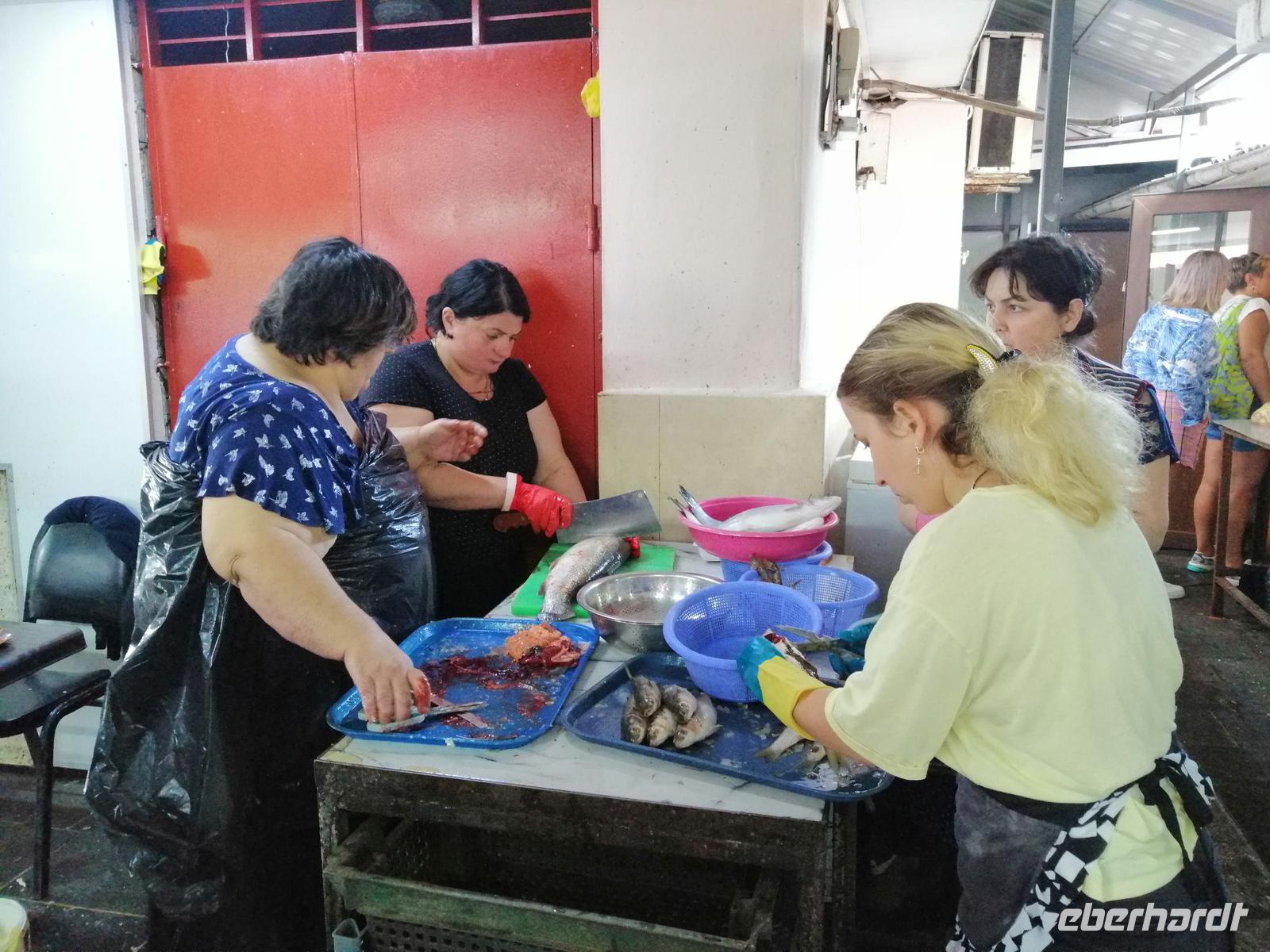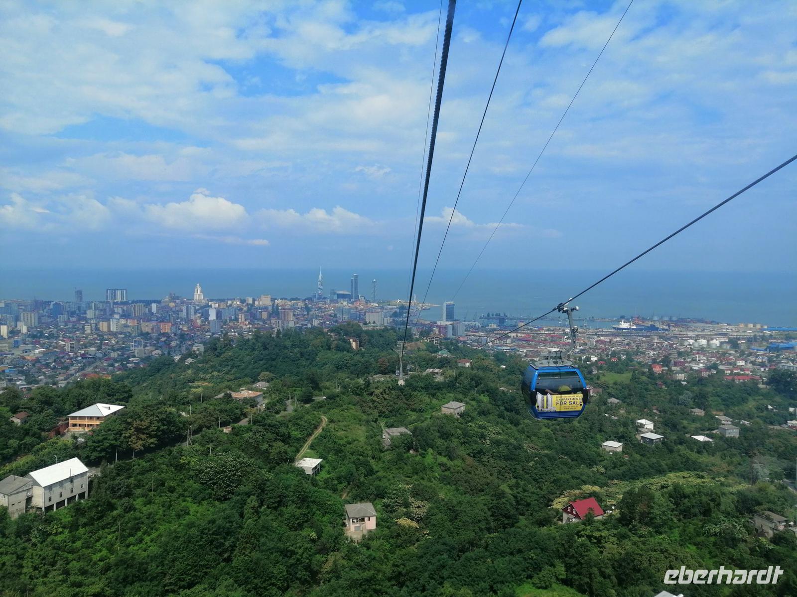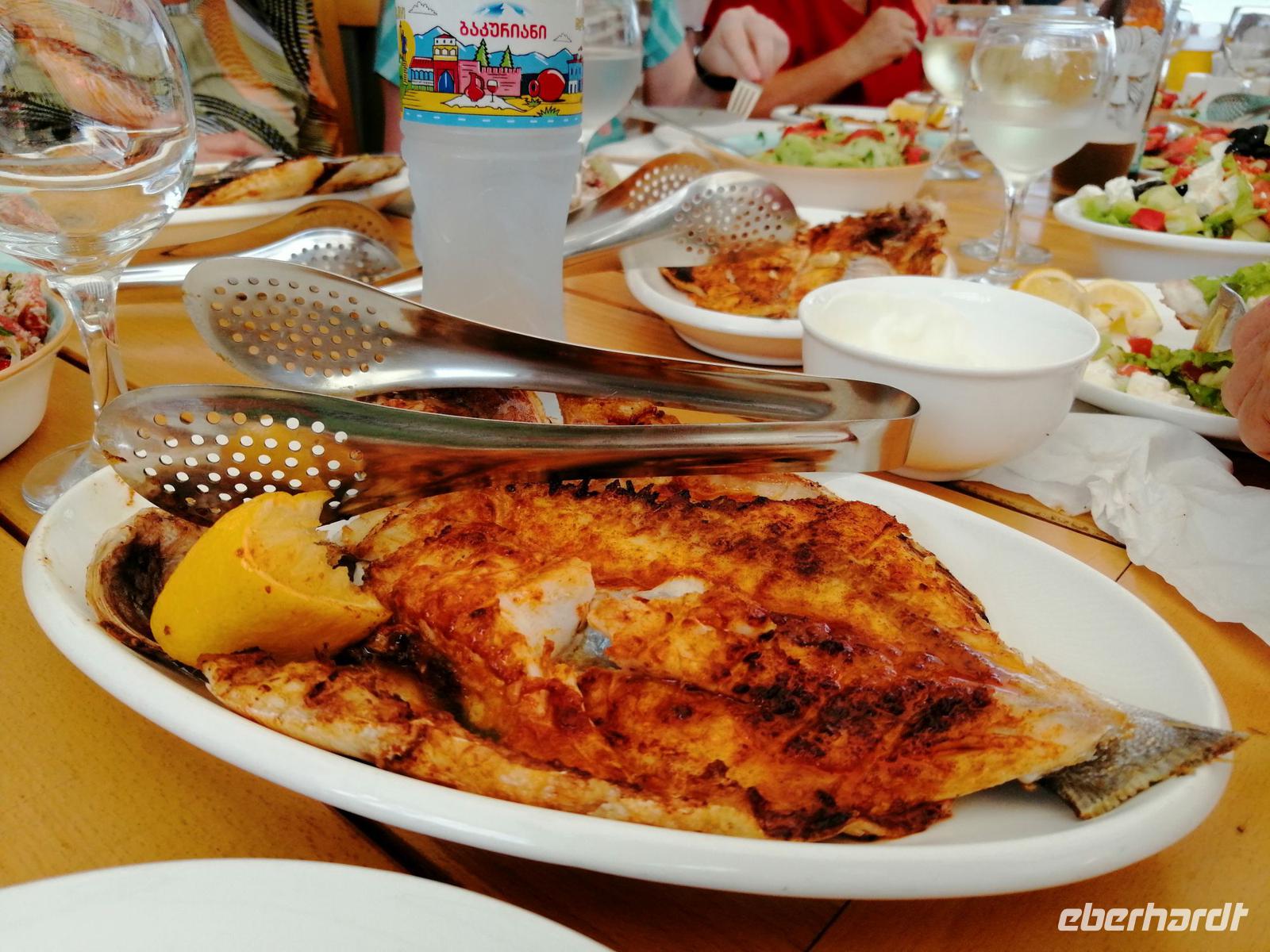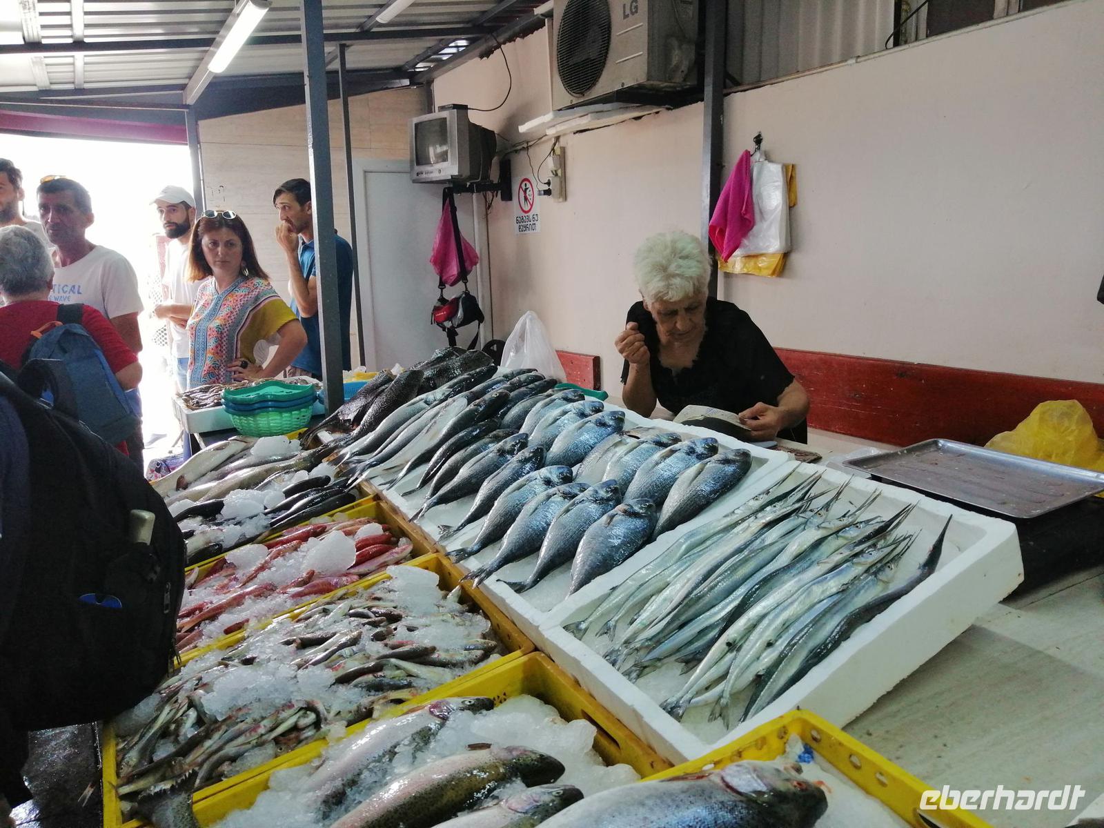 Danach schlugen wir mit Sopo unseren Reisegästen vor mit der Stadt-Seilbahn auf einen Berg zu fahren. Die Fahrt war spektakulär! Wir hatten eine gute Sicht über die ganze Stadt. Nach der Fahrt mit der Seilbahn, hat uns unser Busfahrer Sergio abgeholt und zum Fischmarkt in Batumi gebracht. Der Besuch des Fischmarktes war ein tolles Erlebnis! Man konnte zuschauen wie die Händler ihre Fische ausgenommen, angeboten und anschließend sie verkauft haben. Wir suchten uns die leckeren Doraden aus und gingen in die Fischgaststätte um die Ecke um die Fische grillen zu lassen. Das Essen schmeckte uns sehr gut. Nach dem leckeren Mittagessen in der Fischgaststätte am Strand, brachte uns unser Busfahrer Sergio zum Botanischen Garten.