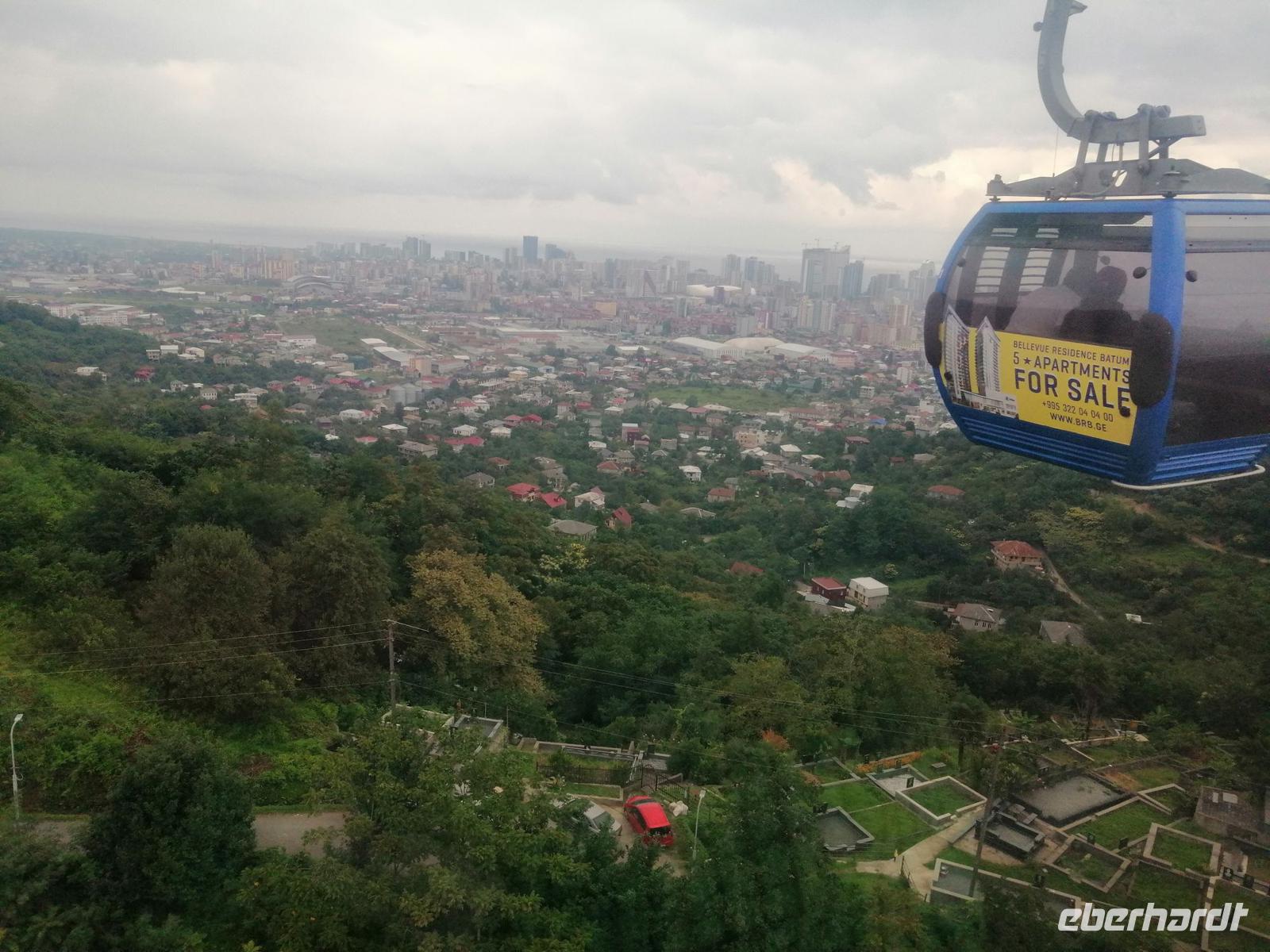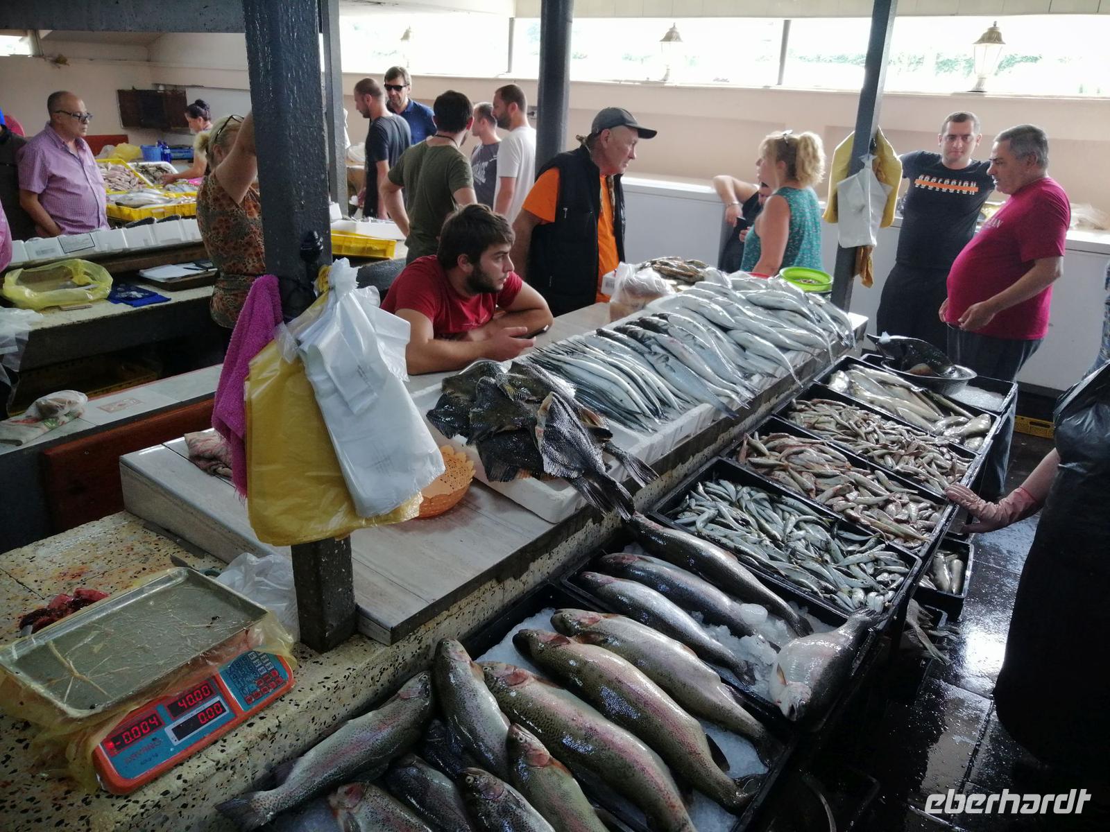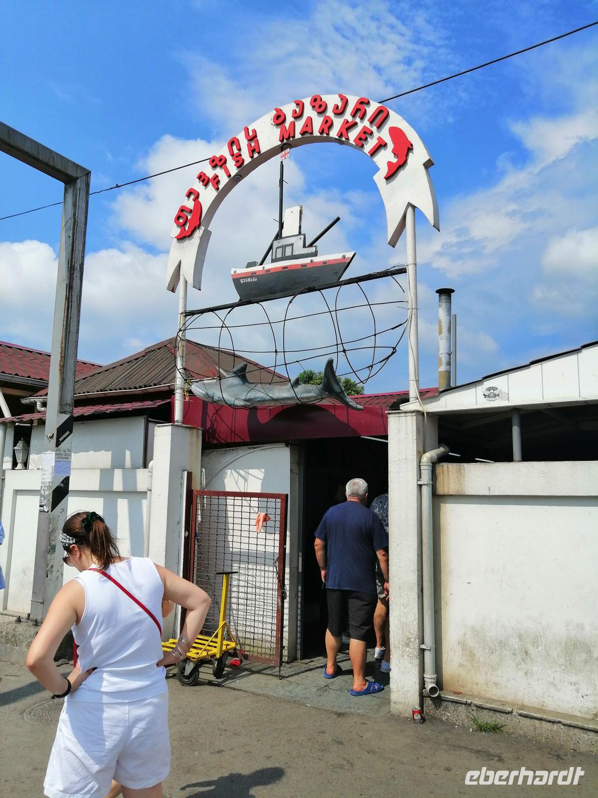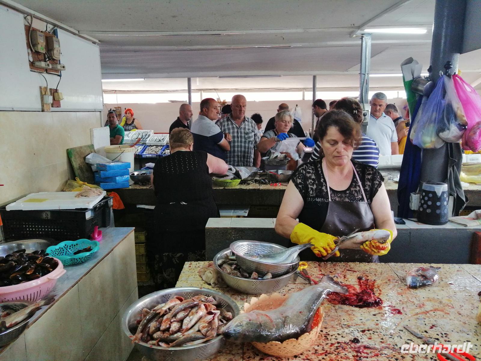 Danach schlugen wir mit Sopo unseren Reisegästen vor mit der Stadt-Seilbahn auf einen Berg zu fahren. Die Fahrt war spektakulär! Wir hatten eine gute Sicht über die ganze Stadt. Nach der Fahrt mit der Seilbahn, hat uns unser Busfahrer Sergio abgeholt und zum Fischmarkt in Batumi gebracht. Der Besuch des Fischmarktes war ein tolles Erlebnis! Man konnte zuschauen wie die Händler ihre Fische ausgenommen, angeboten und anschließend sie verkauft haben. Wir suchten uns die leckeren Doraden aus und gingen in die Fischgaststätte um die Ecke um die Fische grillen zu lassen. Das Essen schmeckte uns sehr gut. Nach dem leckeren Mittagessen in der Fischgaststätte am Strand, brachte uns unser Busfahrer Sergio zum Botanischen Garten.