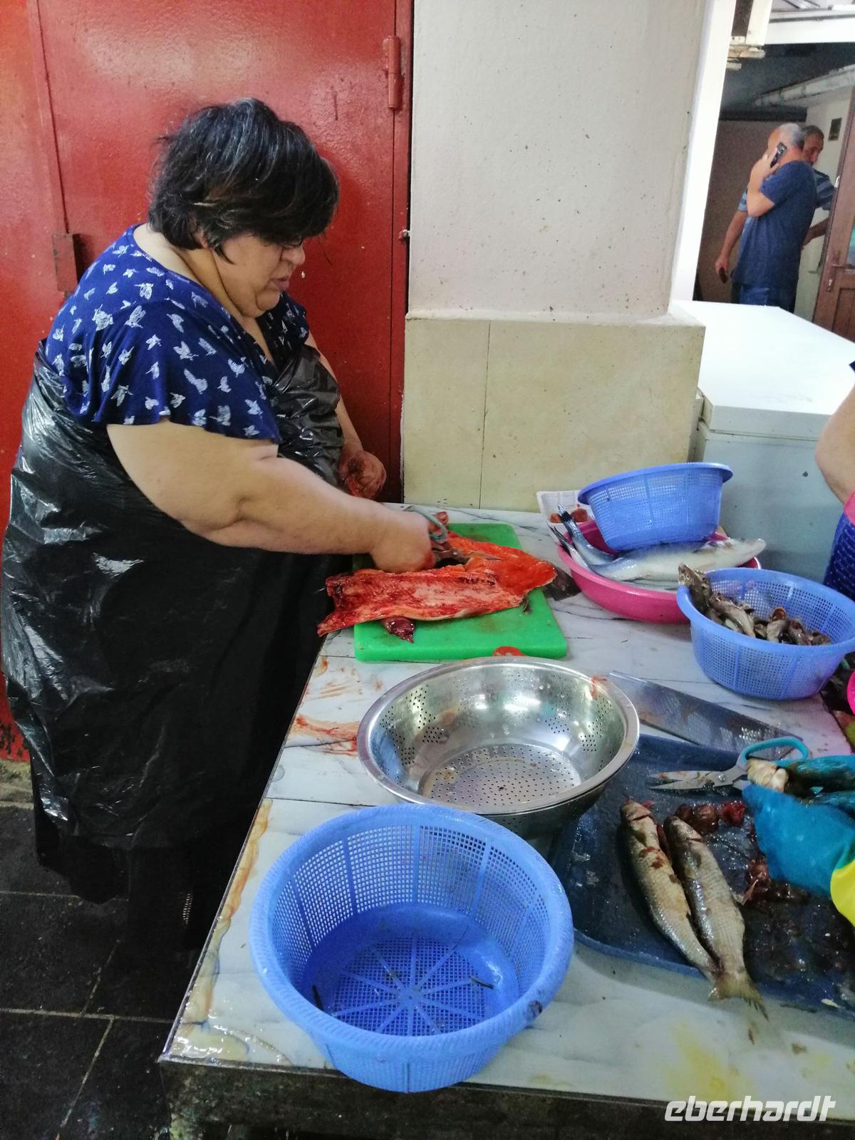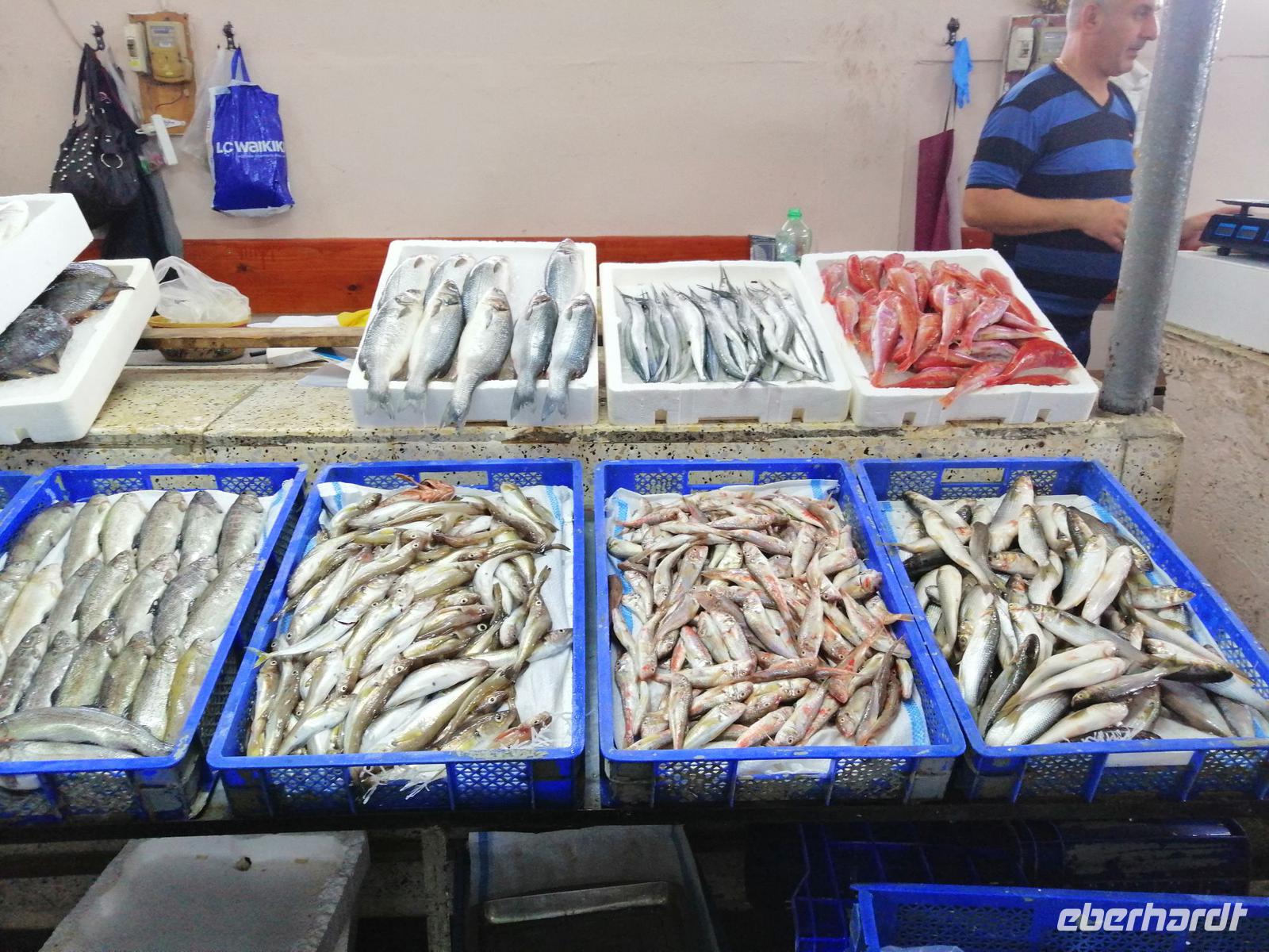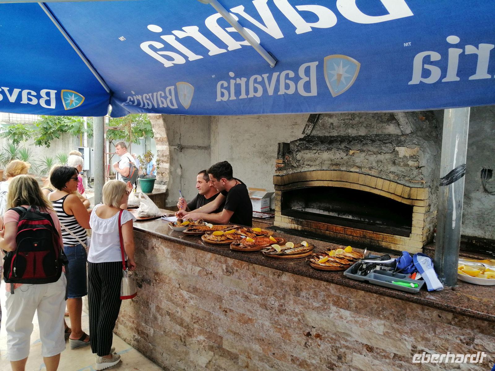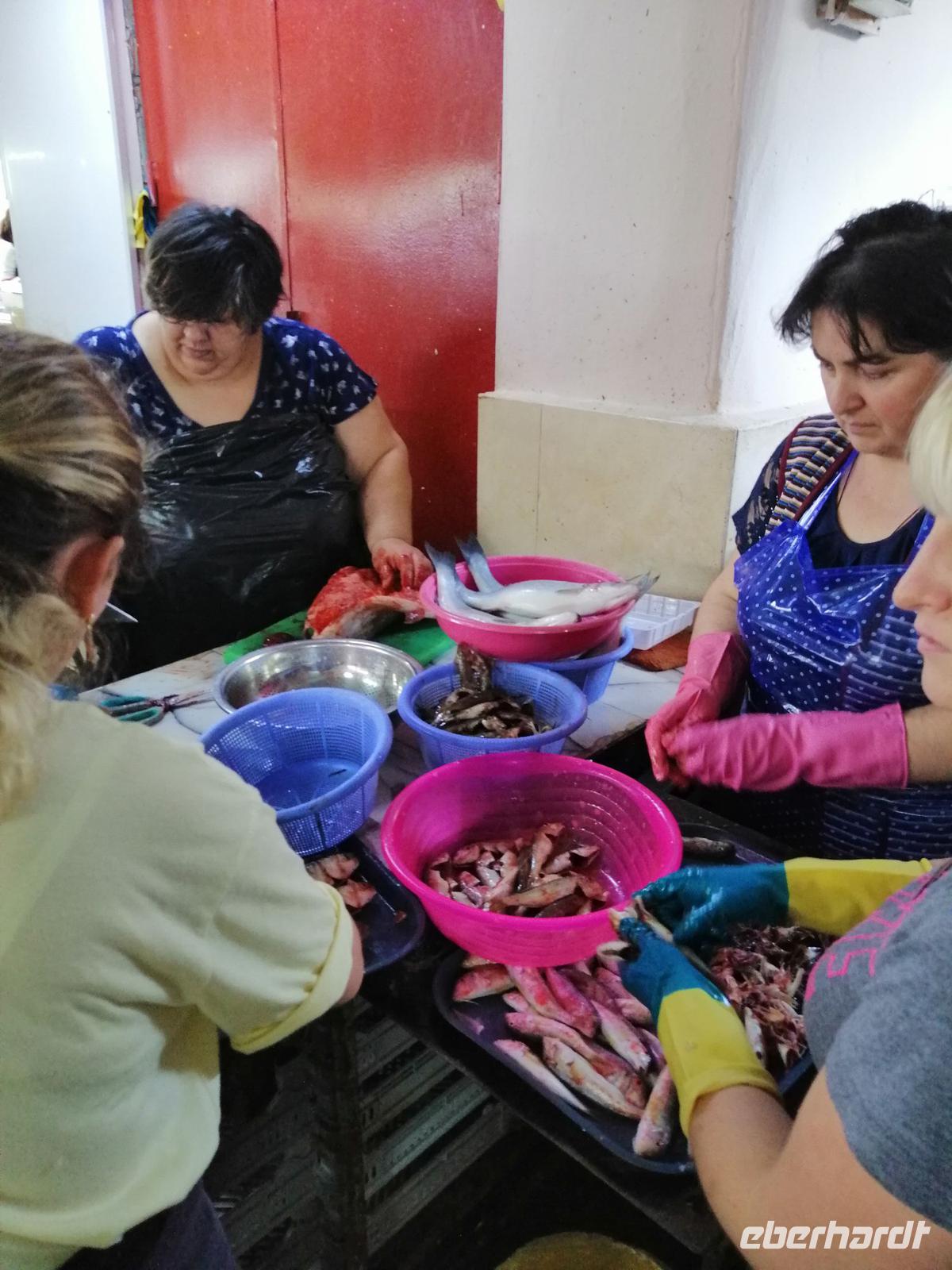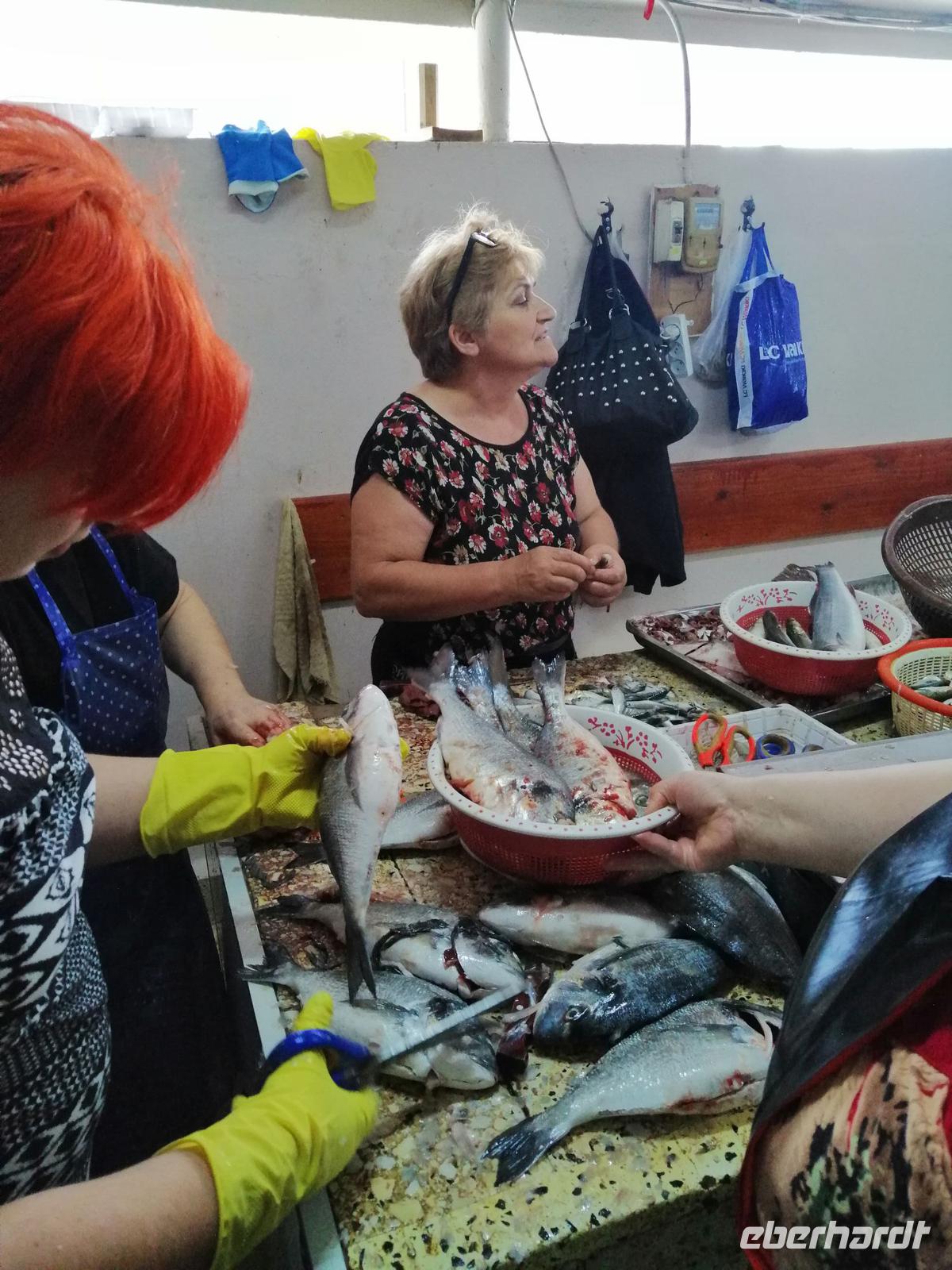 Danach schlugen wir mit Sopo unseren Reisegästen vor mit der Stadt-Seilbahn auf einen Berg zu fahren. Die Fahrt war spektakulär! Wir hatten eine gute Sicht über die ganze Stadt. Nach der Fahrt mit der Seilbahn, hat uns unser Busfahrer Sergio abgeholt und zum Fischmarkt in Batumi gebracht. Der Besuch des Fischmarktes war ein tolles Erlebnis! Man konnte zuschauen wie die Händler ihre Fische ausgenommen, angeboten und anschließend sie verkauft haben. Wir suchten uns die leckeren Doraden aus und gingen in die Fischgaststätte um die Ecke um die Fische grillen zu lassen. Das Essen schmeckte uns sehr gut. Nach dem leckeren Mittagessen in der Fischgaststätte am Strand, brachte uns unser Busfahrer Sergio zum Botanischen Garten.