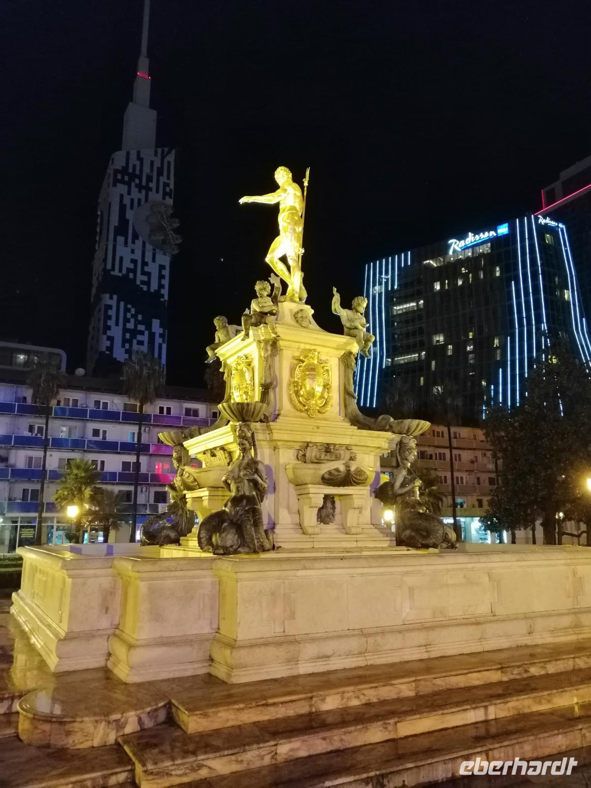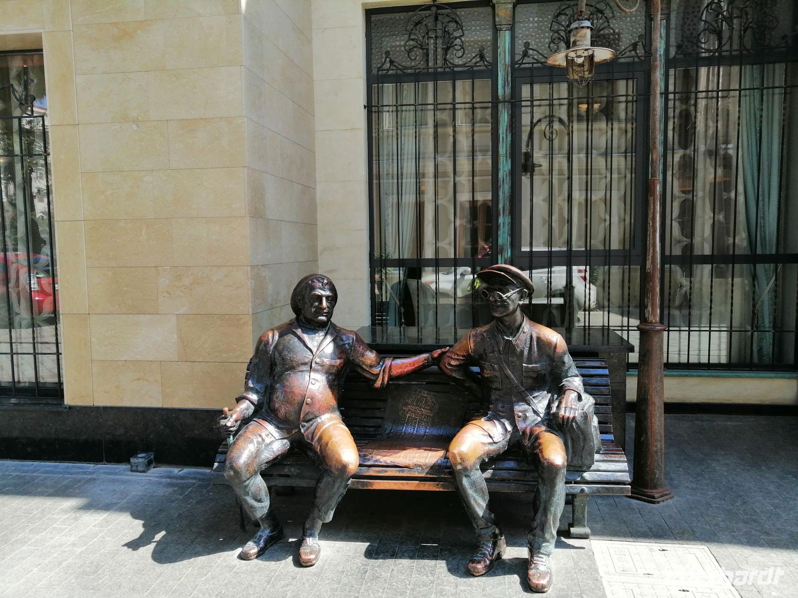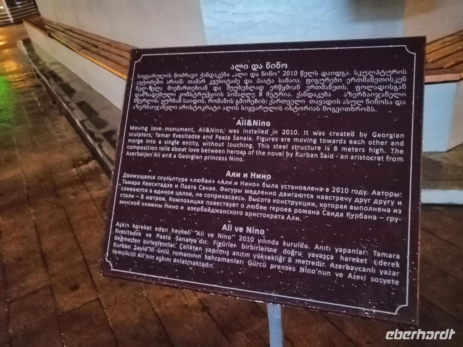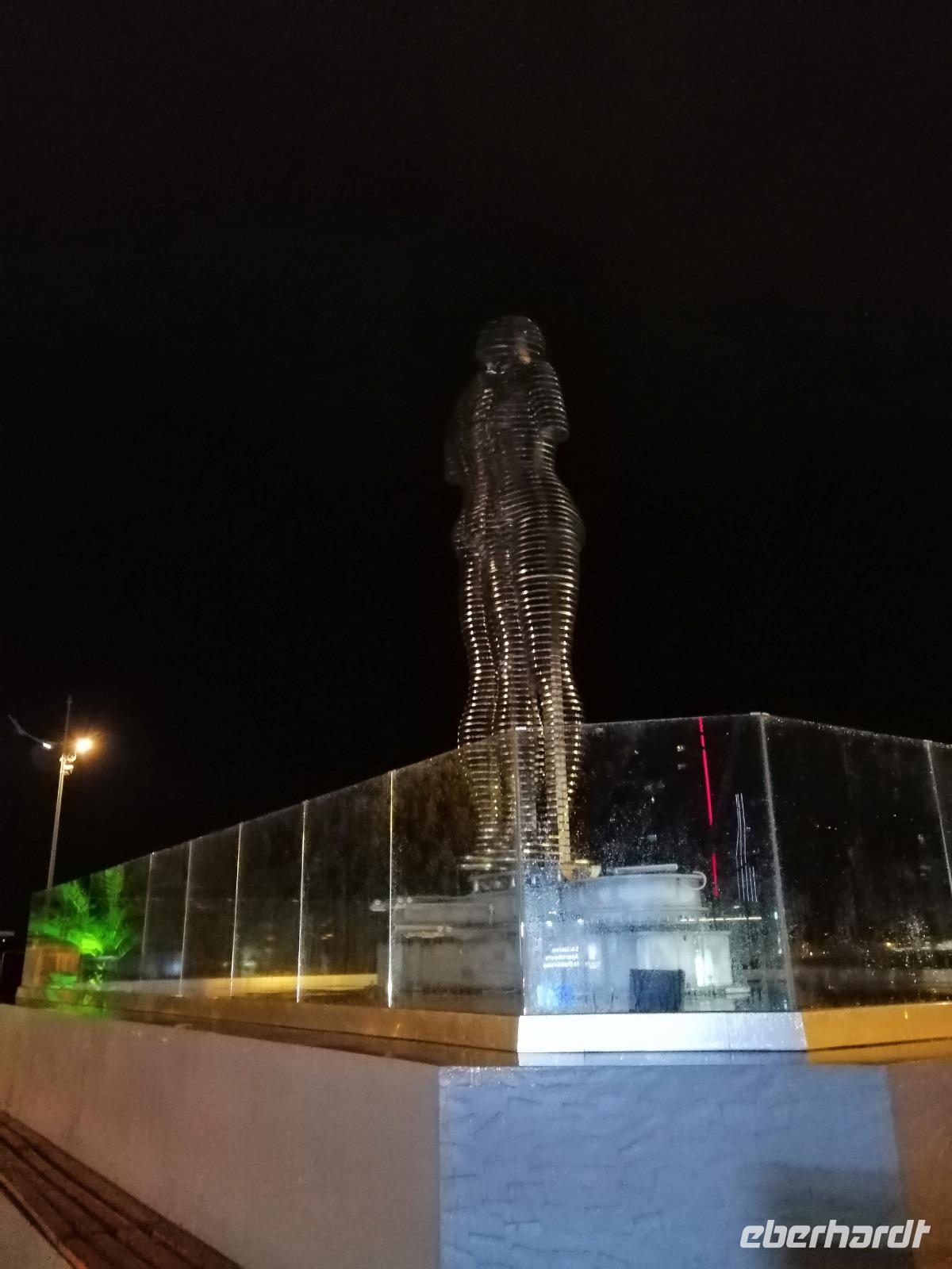 Gegen 19 Uhr gingen wir zusammen ins Restaurant des Alphabet Tower (Buchstabenturm), dort wurde für uns das Abendbrot vorbereitet. Leider hat es an diesem Abend sehr stark geregnet, so dass wir keine gute Sicht von diesem großen Turm (130 Meter hoch) hatten. Dafür war das Essen im "Buchstaben-Restaurant" sehr gut. Nach dem Essen (es regnete nich mehr) gingen wir zum Denkmal von Ali und Nino ein bisschen spazieren. Direkt an diesem Denkmal erzählte uns Sopo die Legende über die zwei Verliebten. Den ersten Tag in Georgien beendeten wir am Neptun-Brunnen gegenüber vom Musiktheater. Es war ein sehr schöner Tag!